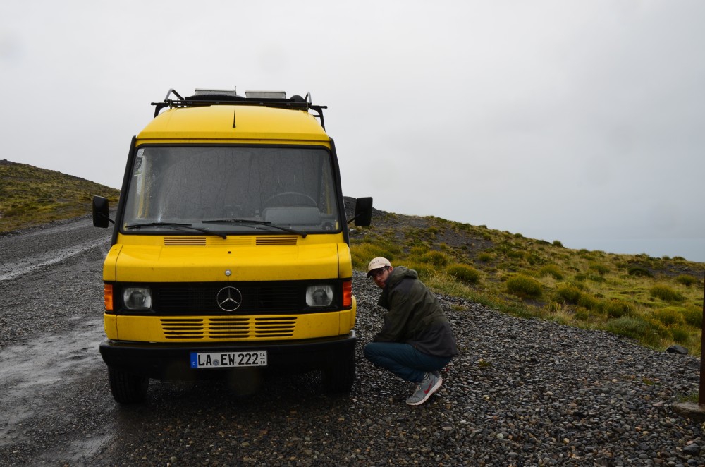 Es regnet. In Strömen. Wir haben uns nur für ein paar Einkäufe in Puerto Natales eine Nacht aufgehalten und sind dann weiter gefahren zum Nationalpark. Dort angekommen, wurden wir erstmal von mega unfreundlichen Empfangsdamen gebeten uns in die Besucherliste einzutragen und 21.000 Peso p.P. zu bezahlen. Achtung, neue Währung -> Ungefähr 770 Chilenische Peso sind ein Euro. Bisher die umständlichste Währung für uns. Noch dazu, weil wir die 1000er Zahlen noch nicht wirklich gebraucht haben und somit noch nicht besonders gut auf Spanisch verstehen. Die ersten Meter im Park waren gefahren und die Stimmung wurde immer mieser. Zumindest die von Matthias. Die Straßen (nicht asphaltiert, nur „Gravel“) bestanden eigentlich nur noch aus Löchern. Ein Schlagloch neben dem Anderen. Und wenn gerade mal keine da waren, dann gab es schöne Waschbrettstrecken. Auch mit reduziertem Luftdruck in den Reifen eine Tortur… bisher die schlechtesten und nervigsten Straßen die wir gefahren sind. Angekommen am Parkplatz machte sich dann ein laut quietschender Keilriemen bemerkbar. Matthias war „etwas“ genervt. Überteuerte Eintritte (Natürlich nur wieder für Ausländer), dann die unfreundlichen Tussen am Eingang und Straßen, dass man Angst um das ganze Auto haben muss. Der Keilriemen war dann das I-Tüpfelchen. Ersatz war zwar dabei, aber es regnete natürlich immer noch in Strömen und einen Keilriemen bei 0°C und starkem Wind im Matsch zu wechseln ist kein Spaß. (Bisher noch nicht gewechselt, quietscht aber auch nicht mehr)