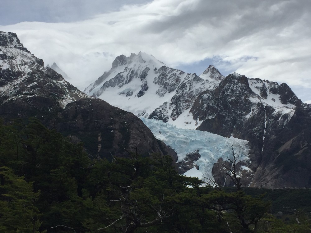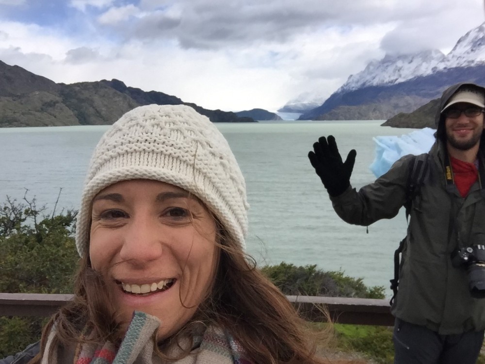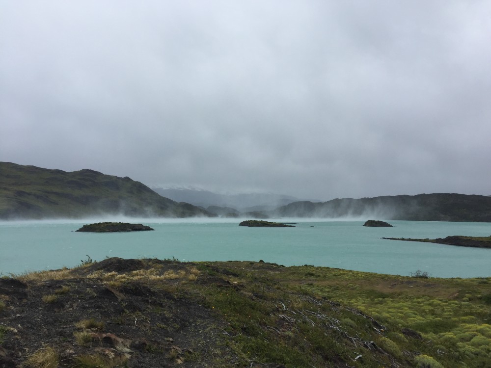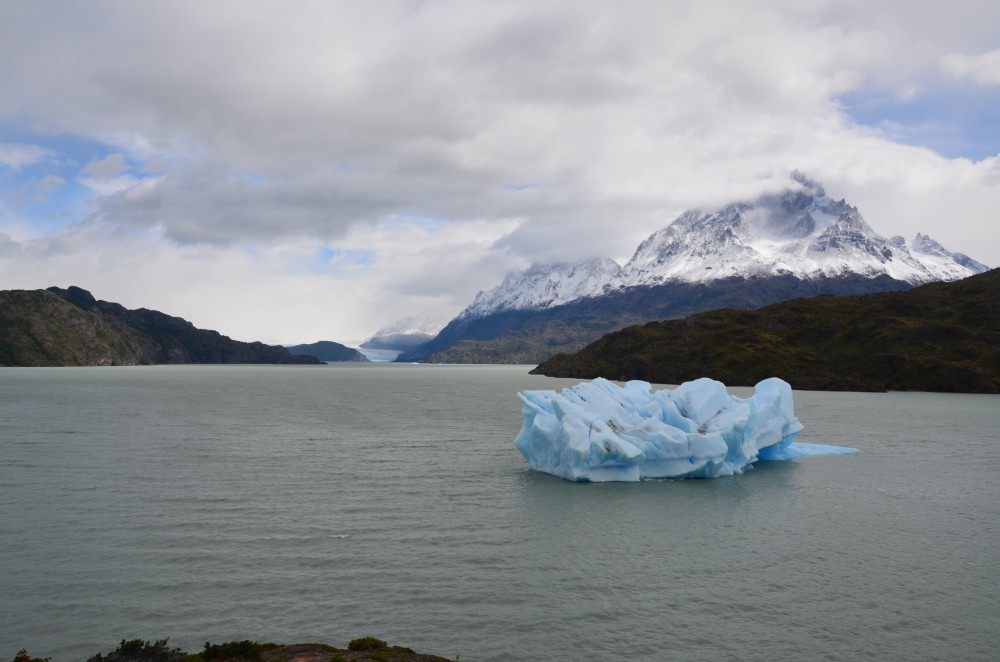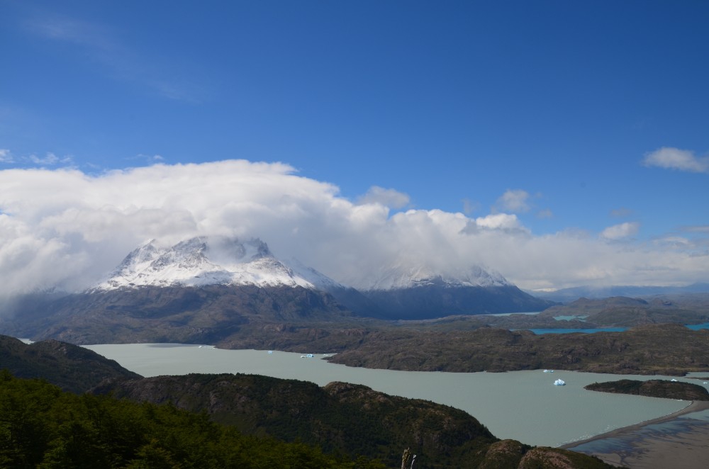 Am nächsten Tag wurde das Wetter gottseidank etwas besser und die Laune wurde langsam besser. Wir nutzten den ersten Tag und gingen zu einem Aussichtspunkt, bei dem man auf den Glacier Grey blicken kann. Auf dem Weg dorthin haben wir auch Teile vom Gletscher gesehen, die nun als Eisberge dort herumschwimmen. Schon beeindruckend, so ein großer, richtig hellblauer Eisberg. Die zweite Wanderung an dem Tag führte uns über 600 Höhenmeter zu einer Panoramaaussicht über den ganzen Park. Der Weg hatte es wirklich in sich. Zunächst ging es recht lange auf der Ebene entlang und wir wunderten uns schon, wie der Weg die 600 Höhenmeter in den angegeben 2 Stunden schaffen will, wo wir doch schon eine gute halbe Stunde „am Boden“ unterwegs waren. Naja… es kam wie es kommen musste und es ging steil hinauf. Es war sehr anstrengend, doch wir wurden dafür absolut belohnt. Schon auf dem Weg zum Gipfel haben wir das Patagonische Wetter richtig zu spüren bekommen. Regen, Sonnenschein, Sturm, Sonnenschein, viel Wind, Regen, Sonnenschein, Schneesturm, Sonnenschein. Zum Glück hatten wir mit dem Zwiebel-Look gut vorgesorgt (Jacke aus, Jacke an, Jacke aus, Pullover aus, Pullover an, Jacke an, Mütze auf, Handschuhe an). In 700 Metern Höhe pfiff uns dann ein Wind um die Ohren… sowas haben wir beide noch nicht erlebt. Im Stehen war es eigentlich unmöglich an den Gipfel zu kommen. Auf allen Vieren gingen wir vorsichtig bis zum höchsten Punkt. Nach einigen Fotos war es uns dann doch zu ungemütlich geworden und wir kletterten wieder Richtung Tal. Ein sehr schöner Weg, für den wir insgesamt 4,5 Stunden unterwegs waren. Es war auch die anstrengendste Wanderung, die uns fast zum Umkehren brachte (Es war einfach kein Ende in Sicht… Zitat Matthias während Schneesturm: „Warum mach i den Scheiss eigentlich?? Aussichtspunkt aufm Berg bei 0,0 Sicht und i soi mi do auffe schindn…?“)
