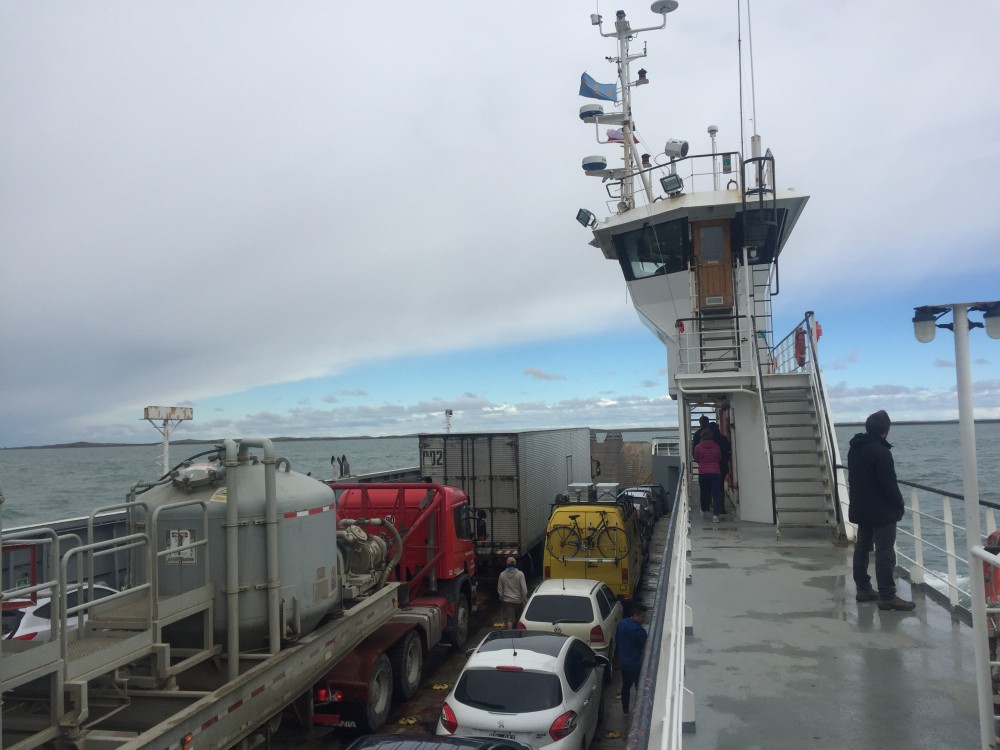 Aber von Anfang an. Erst einmal musste uns Erwin noch knapp 150 km von Rio Gallegos entlang der RN3 an die chilenische Grenze bringen. Bereits vorab haben wir in Erfahrung gebracht, dass die Chilenen bei der Einreise– in Bayern würde man sagen – etwas hoaglig sind. Es darf weder frisches Obst und Gemüse noch Fleisch oder Tierprodukte, wie zum Beispiel Honig oder rohe Eier eingeführt werden. Wer sein “Glück“ trotzdem versucht, muss mit Geld- oder sogar Bewährungsstrafen rechnen. Also gab es noch eine letzte große Koch-Session vor der Grenze. Zufällig haben wir dabei mitten im nirgendwo einen mittlerweile erloschenen Vulkan entdeckt (Lago Azul). Nach fünfmaligem nachfragen von Matthias, ob wir auch wirklich kein Obst oder Gemüse mehr im Erwin haben (M: „Ich hab ja keine Ahnung wo Stephie das ganze Grünzeug immer herzieht“), ging es also auf Richtung Chile. Nach geschlagenen 1,5 Stunden haben wir den Papierkram an den drei Schaltern im Grenzübergang erledigt. Bevor wir aber endgültig einreisen konnten, mussten wir noch mit Erwin durch den Zoll (Aduanas). Ein etwas grimmiger Beamter fragte uns noch, ob wir frisches Obst und Gemüse dabei hätten und kam sogleich mit einem Spürhund um die Ecke. Also samt Wauwau rein in unseren Erwin (es hat den ganzen Tag geregnet à Erwin sah mach dem Schnüffel-Einsatz auch entsprechend aus) und los ging die Durchsuchung aller Schränke nach möglichen Obst- oder Gemüsevorräten. Sogar unser Bettzeug mussten wir ausräumen (Stephie versteckt ja hin und wieder eine Salami im Kopfkissen… ;-)) und Matthias sollte die Dachboxen öffnen. Letzen Endes gab es aber wie erwartet nichts zu finden und wir konnten ohne größere Probleme unsere Weiterfahrt antreten… nachdem wir alles wieder verstaut und den Boden gewischt hatten. Nächster Halt um nach Feuerland zu kommen war die sogenannte Magellan-Straße, die das argentinische und chilenische Festland von Tierra del Fuego trennt. In Punta Delgada hat man die Möglichkeit mit einer Fähre die etwa 4 Kilometer breite Magellan Straße zu überqueren. Recht unkompliziert konnten wir nach einer kurzen Wartezeit die etwa 25 Minütige Fahrt antreten. Bezahlt haben wir dafür als „Motorhome“ 31 US$. Unser Erwin weckte mal wieder das Interesse auf der Fähre und wurde prompt fotografiert. Es ist immer wieder schön, wenn man dadurch mit Einheimischen ins Gespräch kommt. Woher man kommt, wohin man fährt, dass das Auto so toll ist, usw. usw. Mittlerweile klappt so ein Small Talk auch ganz gut in Spanisch. Nach einigen Kilometern auf chilenischer Seite folgte ein weiterer Grenzübergang in San Sebastián nach Argentinien (mittlerweile haben wir bestimmt 5 Mal die Grenze gewechselt und sind schon recht routiniert!)