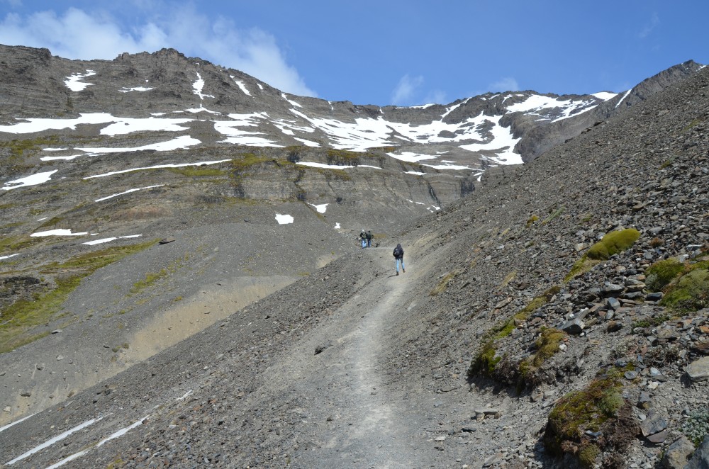Nach ungefähr 1,5 Stunden haben wir den Gletscher erreicht. Bzw. das, was von dem Gletscher noch übrig ist. Er ist eigentlich nicht mehr als solches erkennbar. Insgesamt war es aber ein toller Weg, der uns teilweise auch durch Schneefelder geführt hat (Der erste Schnee der Reise). Man geht zunächst einen kleinen Flusslauf entlang und steigt dann recht steil zum Gletscher auf. Beeindruckend sind dort ebenfalls die Windböen, bei denen man sich schon mal an Felsen festhalten muss.