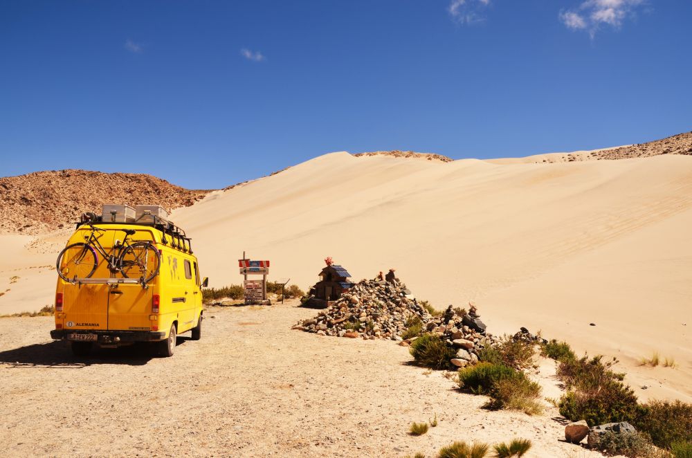 Dieser Tag hatte es richtig in sich. Angefangen hat alles mit einem wunderbaren Frühstück an der Laguna Antofagasta und einer Wanderung auf den Vulkan Antofagasta. Die Namen hier sind sehr einfallsreich wie ihr bemerkt… Der Vulkan ist nicht besonders hoch und kann in ungefähr einer Stunde „erklommen“ werden. Wäre da nicht die Höhe von ungefähr 3500 Metern. Da kommt man nämlich nach ein paar Metern ziemlich auf dem Zahnfleisch daher. Noch dazu für einen so durchtrainierten und von Ausdauer strotzenden Athleten wie Matthias (Fühlt sich doch eher für Essen und Fahren zuständig, Stephanie übernimmt den sportlichen Teil) Naja, irgendwann waren wir dann oben. Die Aussicht – einmalig. Die Kamera war im Dauereinsatz und gottseidank haben wir auch das Fernglas mit hoch geschleppt. (Matthias war natürlich nur deshalb so außer Atem ;-)) Unser Tagesziel war die kleine Oase Antofalla. Die liegt direkt am großen Salzsee Salar de Antofalle. Was wir zum Zeitpunkt des Aufbruchs noch nicht wussten – vor uns lag eine absolut miserable Straße und ein Pass, der bis auf 4600 Meter führt. Vor kurzem war die Strecke scheinbar noch eine „4×4 only“ Passage. Entweder ist die Beschilderung verschwunden oder wir haben das übersehen. Nur ein paar Pickups sind uns entgegengekommen und haben sich vermutlich gewundert wie die Alemanes da wohl her gekommen sind. Unser Spitzentempo lag bei etwa 20 km/h und wir hatten immer wieder mit steinigen Abschnitten, Flussdurchquerungen und steilen Anstiegen zu kämpfen. Doch das war alles noch kein Problem für uns und unseren Erwin. Bis wir auf 4600 Höhenmeter an den höchsten Punkt des Passes gelangten. Die letzten 100 Meter zum „Gipfel“ waren extrem Steil und da unser Erwin in 4600 Metern Höhe leider nicht mehr die vollen unglaublich kraftvollen 80 PS besitzt kam es, dass uns sprichtwörtlich „die Luft ausging“. So ungefähr 30 Meter davor ging nichts mehr. Trotz Untersetzung im ersten Gang war der Berg zu steil. Die 3 Tonnen machen sich auf der Höhe mit verminderter Leistung und reduziertem Luftdruck dann doch recht schnell bemerkbar. So standen wir also mit angezogener Handbremse auf der Schotterpiste und Matthias Kopf fiel langsam auf das Lenkrad. Nach dieser Steigung ging es nur noch bergab, wir hätten nur noch diese verdammten 30 Meter weiter kommen müssen. Es gab zwei Möglichkeiten: Entweder wir kehren um, scheitern an einem dämlichen Pass und müssen den ganzen Offroad Spaß wieder zurück ODER: wir machen Erwin so leicht wie möglich, pumpen die Reifen bis zum Maximum auf und versuchen es nochmal. Gesagt, getan. Wasserkanister, Dieselreserve, das Fahrrad, alles was leicht zu demontieren ging und viel Gewicht bringt landete schließlich am Straßenrand (inkl. Stephanie). Dann folgte das Aufpumpen der Reifen. Auf Meereshöhe geht das relativ flott, aber hier auf 4600 Meter quält sich der Kompressor regelrecht und ringt um Luft. Es dauerte eine Ewigkeit bis die Reifen aufgeblasen waren. Dann versuchten wir es. Den steilen Teil wieder zurück rollen und im ersten Gang mit Anlauf die Steigung hoch. Es war mega spannend und ehrlich gesagt rechneten wir schon stark damit auf Möglichkeit 1 zurück greifen zu müssen. Doch tatsächlich, es klappte. Erwin stand oben auf dem Gipfel und wir jubelten und sprangen in die Luft vor Freude. Zumindest so lange bis uns klar wurde wie anstrengend es sein wird das ganze Zeug den Berg hoch zu tragen. Zum Glück „nur“ 30 Meter. Doch das hatte es wirklich in sich. Um die 150 Kilo haben wir abgeladen. Die Abfahrt zum Salar de Antofalla hat uns daraufhin aber nicht wirklich geschont. Runter ging es nämlich noch wesentlich steiler und auf der steinigen Piste lagen Felsen so groß wie Fußbälle. Mit Untersetzung und ganz vorsichtiger Fahrweise hangelten wir uns die Serpentinen hinunter. Es war bereits dunkel als wir dann endlich Antofalla erreichten. Völlig entkräftet, doch trotzdem stolz und erfreut richteten wir uns für die Nacht ein. So gut wie an diesem Abend hat uns schon lange keine Brotzeit mehr geschmeckt.