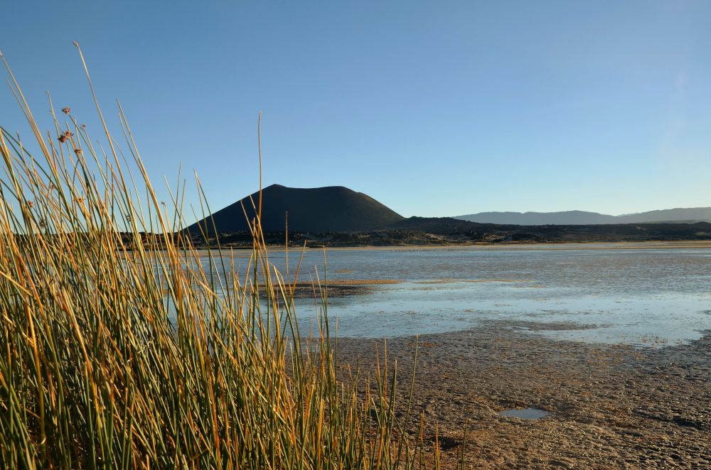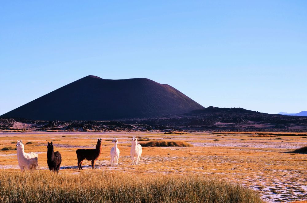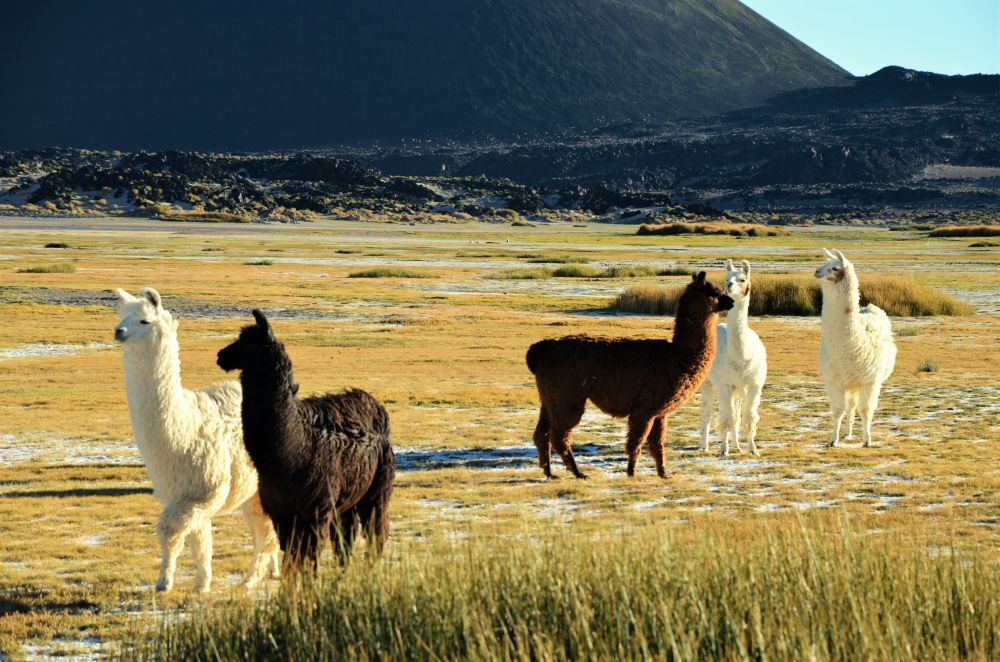Bis zu dieser Etappe waren die Straßen noch in Ordnung, meist asphaltiert und gut ausgebaut. Doch das Blatt wendete sich nun. Wir fuhren an dem Tag „nur“ 130 Kilometer, die uns aber einiges abverlangten. Die ersten Kilometer bis El Penón waren noch geteert, doch ab dann ging es mit reduziertem Reifendruck nur noch auf Schotter und viiiiiel Wellblechpisten weiter. Die Landschaft entschädigte uns dafür aber wieder einmal. Die unglaublichen Weiten der Puna wurden hier das erste Mal deutlich. So weit das Auge reichte sahen wir Vulkane, die Wüste und eine mondartige Landschaft. Aufgrund der Straßenverhältnisse kamen wir erst recht spät in Antofagasta de la Sierra an und richteten, nach einem kurzen Einkauf in einem der kleinen Lebensmittelgeschäfte des Ortes, unser Nachtlager ein. Wieder an einer Lagune – direkt vor dem Vulkan Antofagasta. Ein paar Lamas leisteten uns an dem Abend noch Gesellschaft.