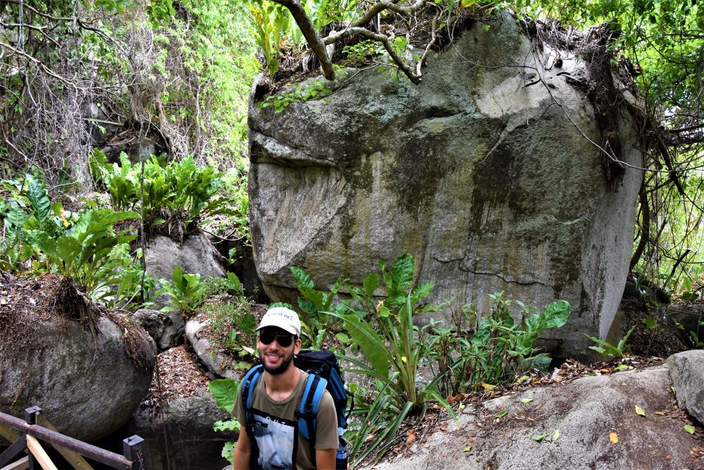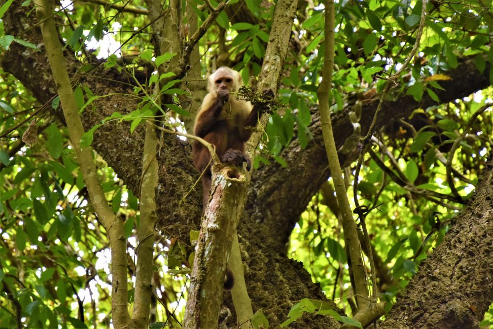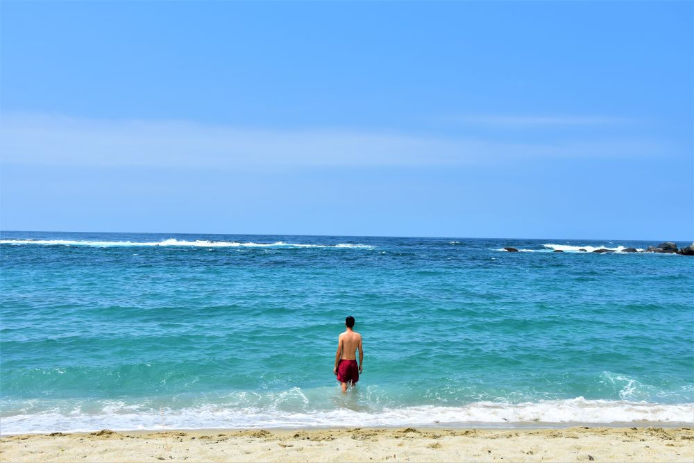 Wir hatten den ganzen Platz für uns alleine. Direkt unter Palmen an einem Fluss, der perfekt zum Baden geeignet war. Die freundlichen Eigentümer ließen uns drei Tage übernachten – für einen super Preis. So konnten wir Erwin während unseres Aufenthaltes im Park stehen lassen und nach dem Wandern auch noch im Fluss entspannen. Als wir am Parkeingang ankamen mussten wir uns erst mal anstellen. Denn die Organisation des Einlasses ist alles andere als gut. Nach einer guten halben Stunde vergeht uns langsam die Lust am Park und wir überlegen schon fast umzukehren, da tut sich plötzlich was und es geht voran. Wir kommen endlich dran und können unsere Eintrittskarten bezahlen. Mit fast 50€ finden wir den Eintritt ganz schön heftig, aber es führt natürlich kein Weg dran vorbei. Und im Nachhinein betrachtet war es das auch Wert. Wir marschieren also los und lassen uns bis zum tatsächlichen Parkeingang und den Wanderwegen mit einem Collectivo fahren (ein Kleinbus der normalerweise 10 Personen transportieren kann. Hier in Südamerika können es aber auch mal 15 sein) – der Bus kostet natürlich extra, doch 5 Kilometer wandern bis man erst mal zu den eigentlichen Wegen hinkommt wollten wir dann auch nicht. Bei einem Preis von umgerechnet 1€ pro Person sowieso nicht. Wir bekommen eine Karte auf denen die Wege mehr oder weniger gut eingezeichnet sind. Es ist eher eine Skizze des Parks und wir haben Mühe die richtigen Wege zu finden. Viel besser klappt die Navigation mit MAPS.ME, da sind die Wege nämlich genau drin. Wir verlaufen uns aber trotzdem einmal und werden prompt von einem Power Ranger zurück in die richtige Richtung gepfiffen. Die Wege führten dann vorbei an traumhaften Stränden die oft mit „Baden verboten, es sind hier schon über 100 Menschen ertrunken – werde kein Teil dieser Statistik“ – Schildern gespickt sind. Die Wellen hier sind richtig heftig und man begibt sich wirklich in Lebensgefahr wenn man dort badet. Sicherer und erlaubt ist das Baden nur an bestimmten Stränden wo sich die Wellen bereits durch Felsen einige Meter vor den Stränden brechen und man somit gefahrlos ins Wasser gehen kann. Wir genießen es, immer wieder ins Wasser zu springen und dann wieder ein paar Meter weiter den Wanderwegen entlang zu schlendern. Es ist nicht viel Strecke die man insgesamt zurücklegt, doch es gibt natürlich viel zu sehen und dann dauert alles ein bisschen länger. Einmal kommen wir auch an Affen vorbei, die haben sich wenig von den ganzen Touristen beeindrucken lassen. Zum Abschluss unseres Bade-Wandertages im Nationalpark Tayrona holen wir uns noch einen richtig fetten Sonnenbrand. Es war eigentlich immer leicht bewölkt und wir hatten überhaupt nicht damit gerechnet, aber das ist wohl immer so. Mittlerweile haben wir uns aber schön geschält und es ist wieder alles gut.