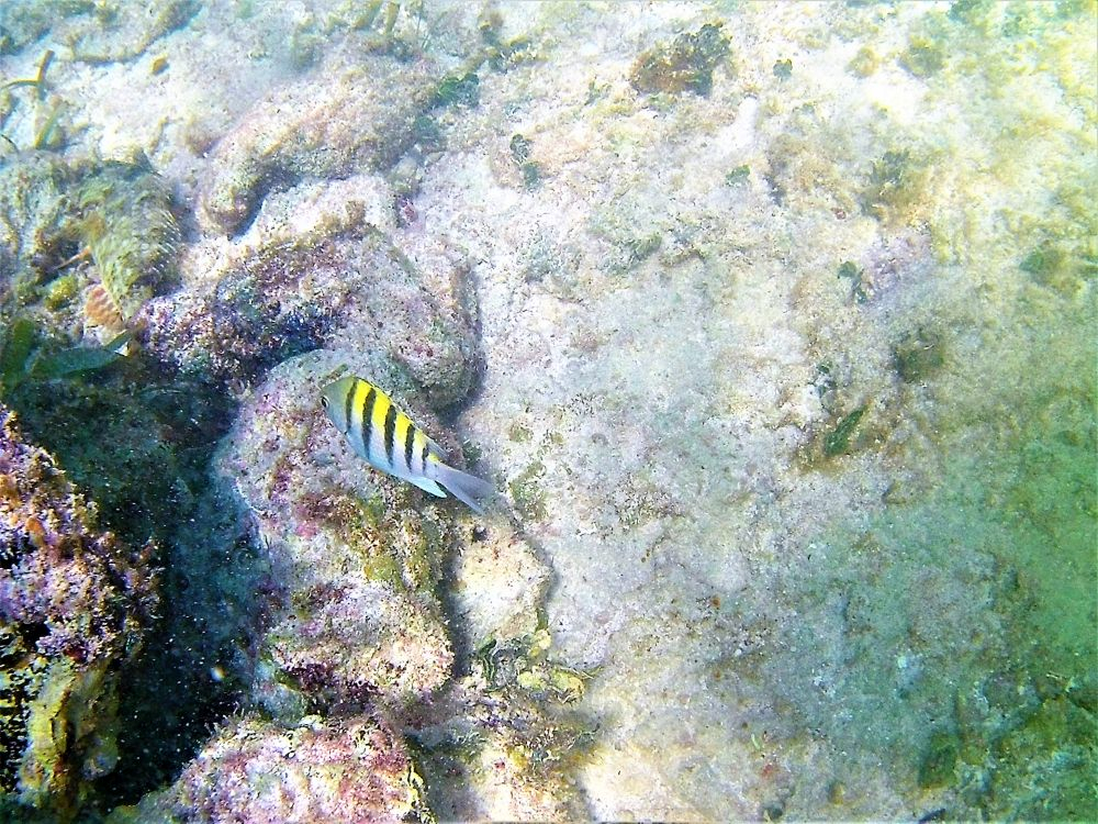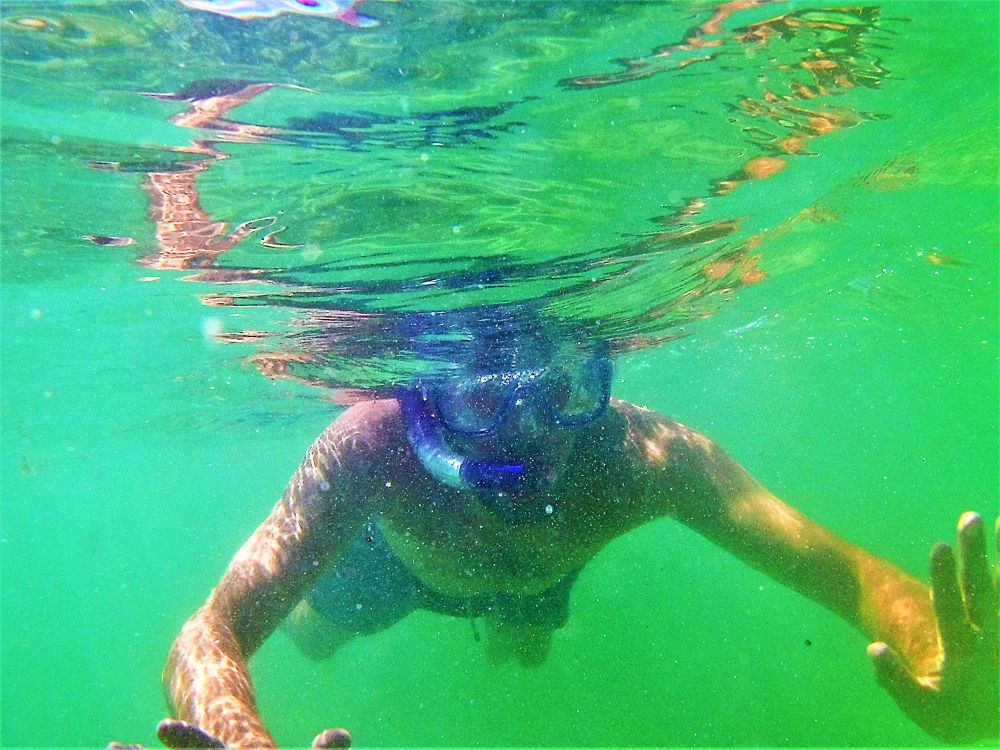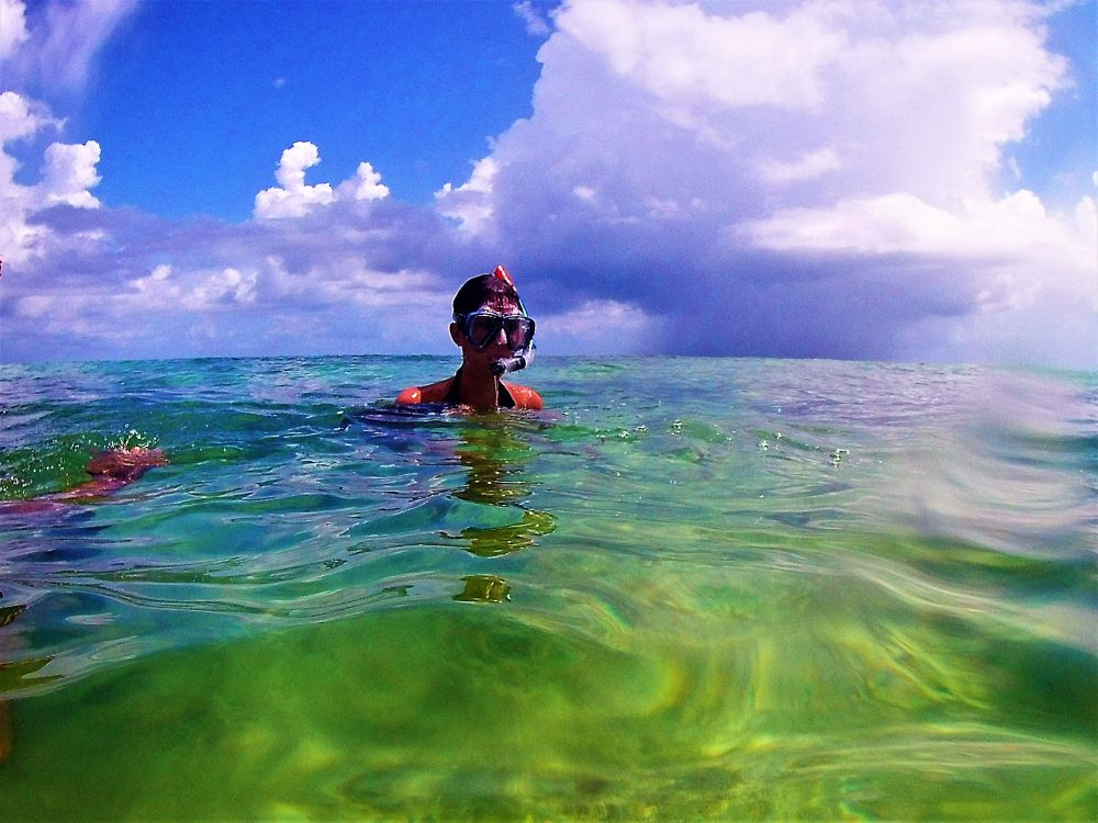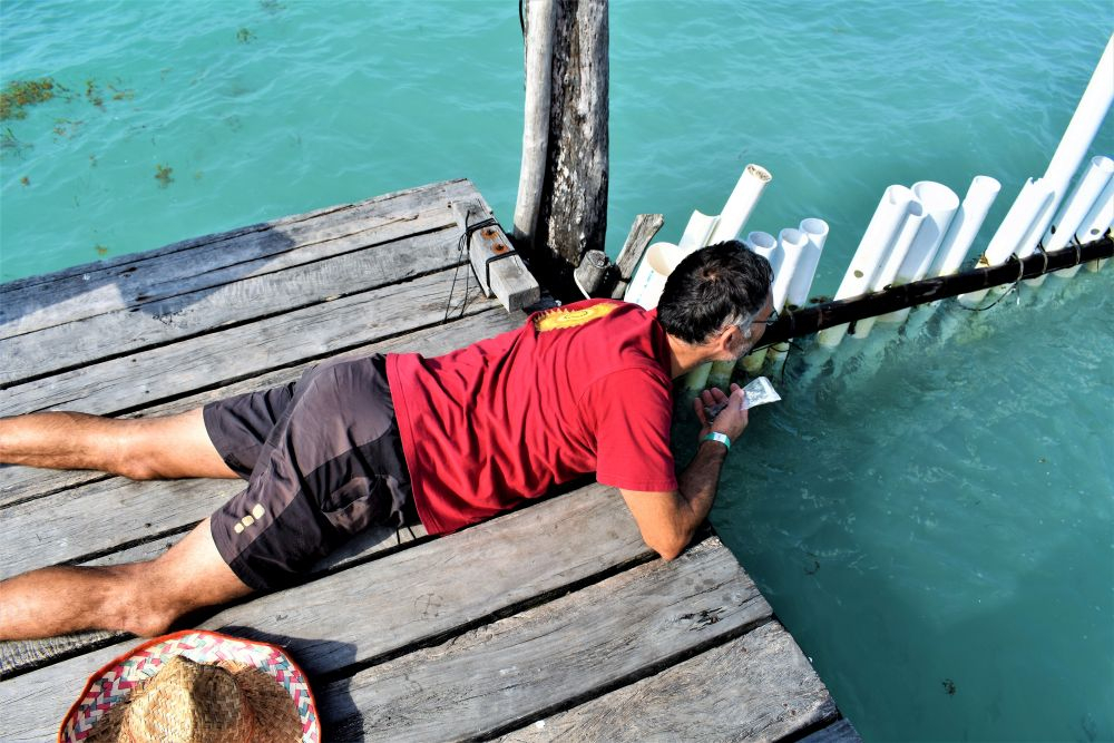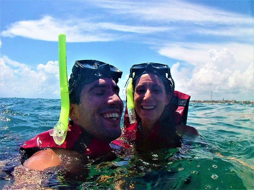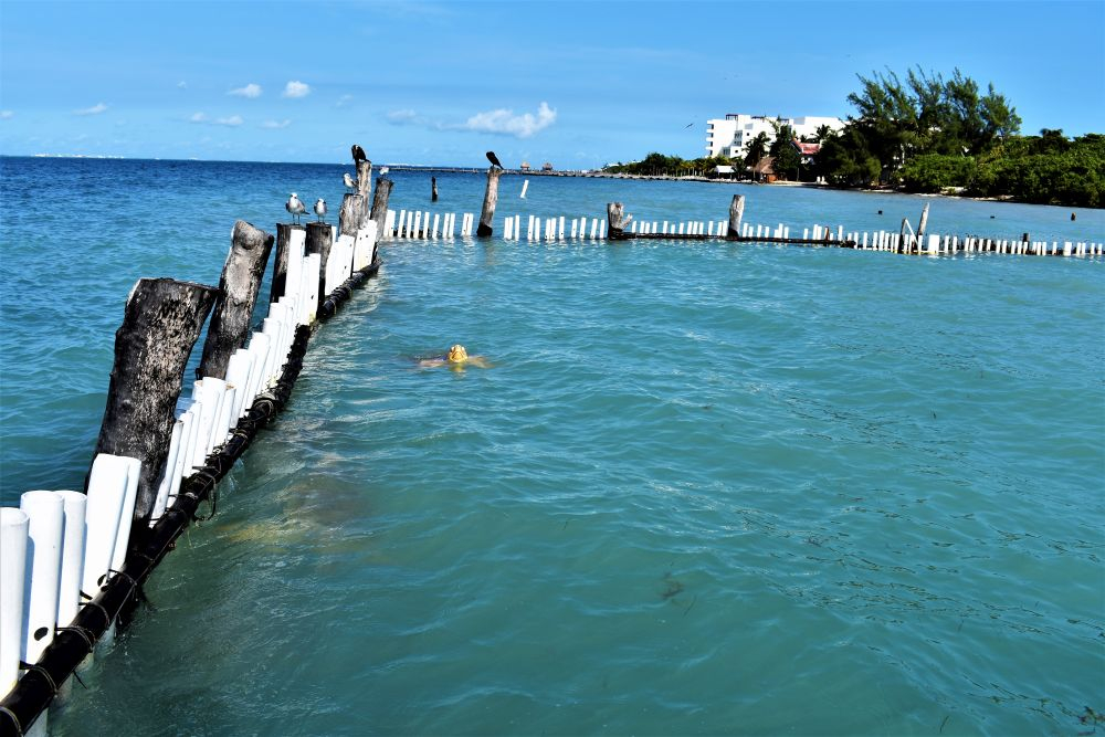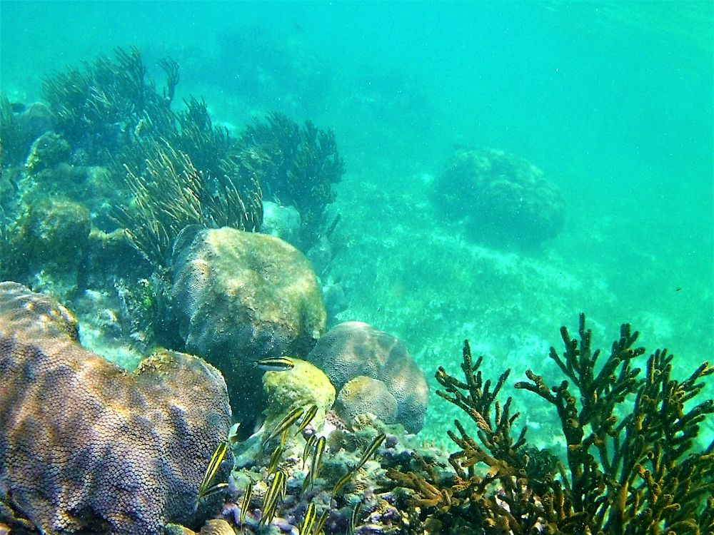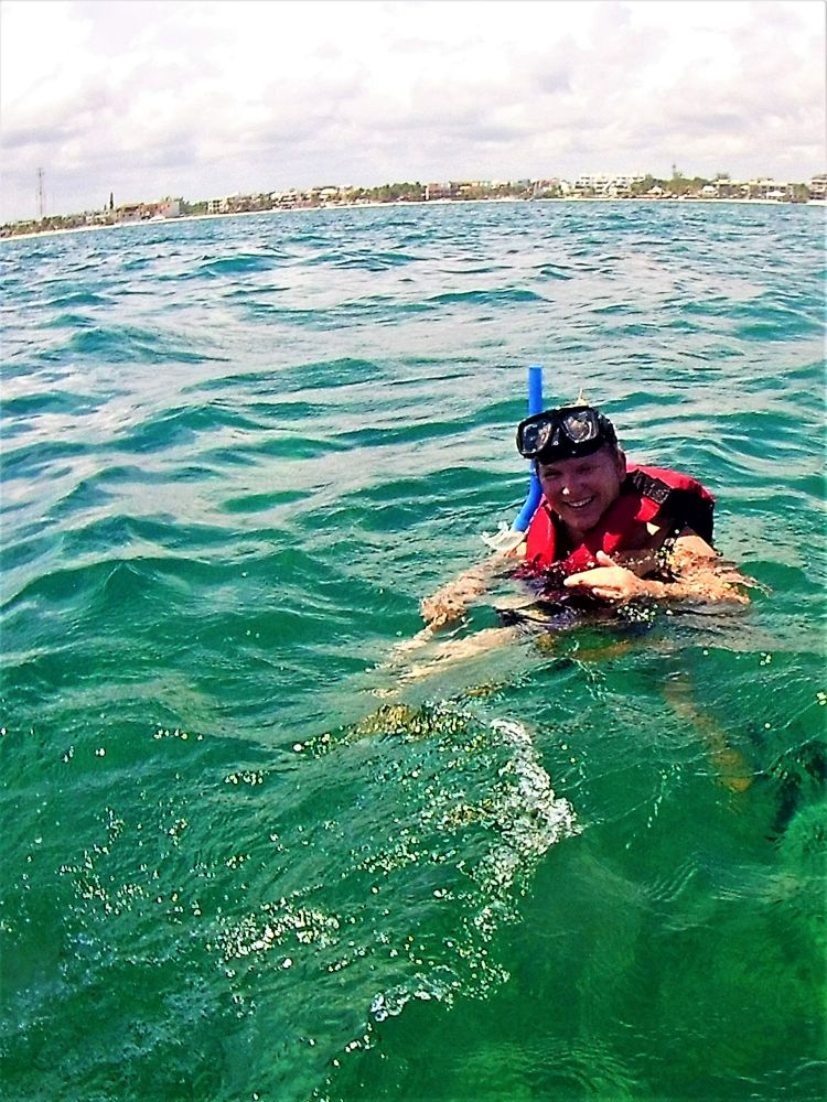 Nach der harten Nacht starteten wir gleich richtig los mit dem ersten Programmpunkt: Schnorcheln! Da gibt es in Mexiko, speziell an der Karibikküste natürlich unzählige Möglichkeiten. Nähe Cancun wurde uns der kleine Ort Puerto Morelos als Ausgangspunkt empfohlen. Aufgrund der diesjährigen Seegrasplage ist es leider kaum möglich direkt vom Strand aus zu schnorcheln oder zu baden. Wir wollten also mit dem Boot etwas weiter hinaus, um das Riff zu erkunden. Bei dieser Gelegenheit wurde auch gleich die neue Unterwasserkamera, die Bärbel und Christian mitgebracht hatten getestet. Die Bilder sind nicht schlecht und es macht uns auf jeden Fall sehr viel Spaß. Nach gut 1,5 Stunden brachte uns unser Guide wieder zurück an Land. Die Zeit war auch wirklich ausreichend und wir haben viele verschiedene Meeresbewohner zu Gesicht bekommen. Unter anderem auch eine riesige Languste. Zu nah wollten wir ihr nicht kommen, auf dem Bild erkennt man zumindest die langen Fühler 😉