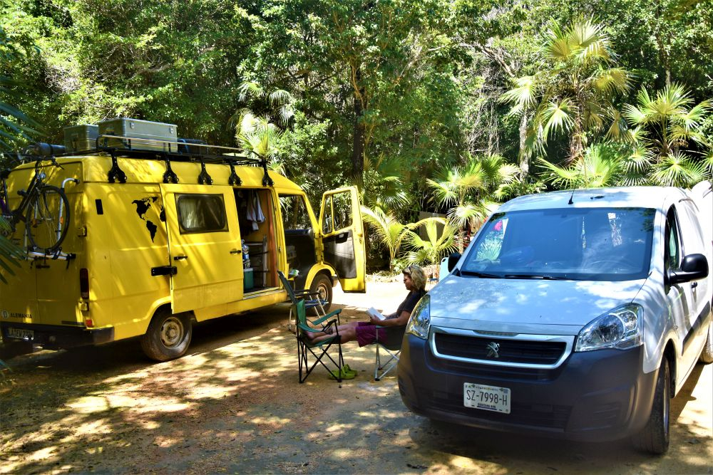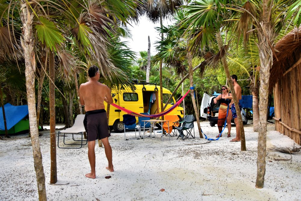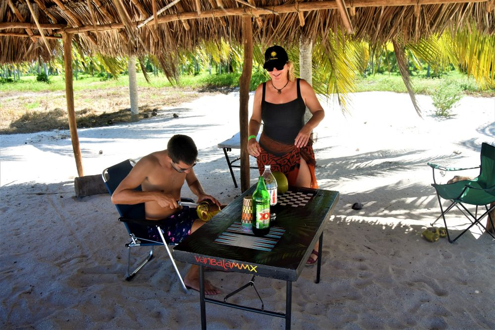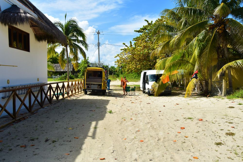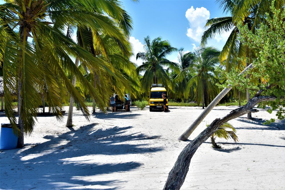 Nach dem Abschied von unserem Kiffer Campingplatz hatten wir an dem ursprünglich geplanten Campingplatz doch noch Glück! Weißer Sandstrand, das türkis blaue Meer, Kokospalmen und schattige Palapas. Der Platz war wirklich ein Traum… man hätte gleich Fotos für einen Reisekatalog machen können. Einzige Herausforderung: Autos so parken, dass keine Kokosnüsse aufs Dach fallen… das sind echte Luxusprobleme 😉