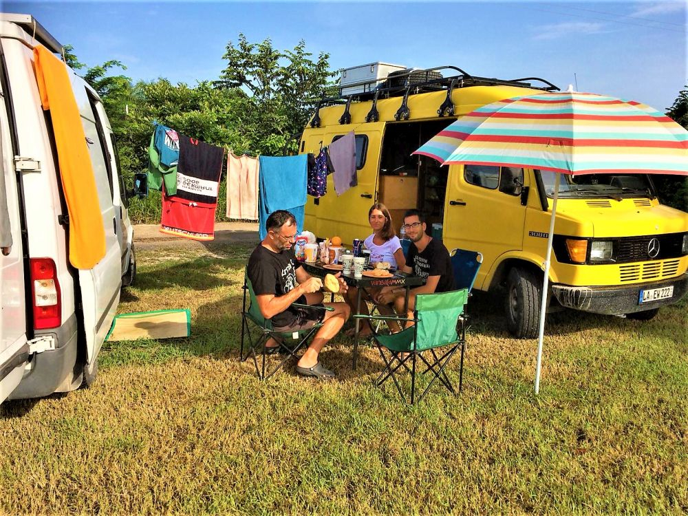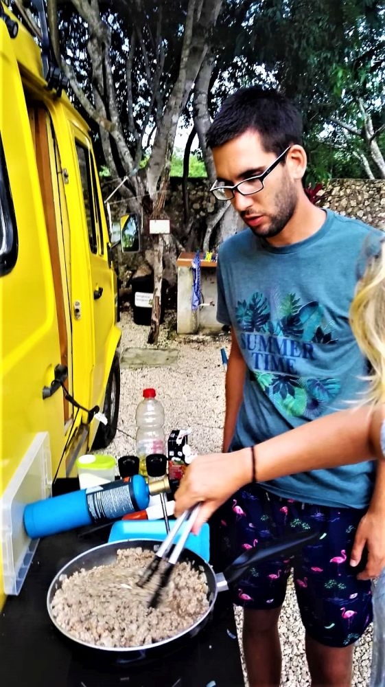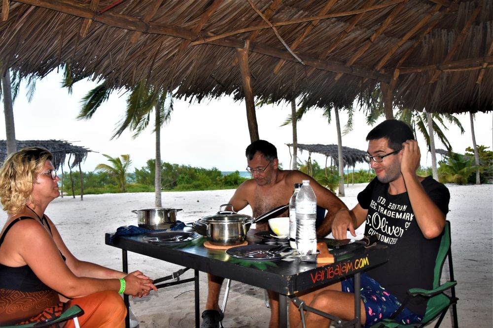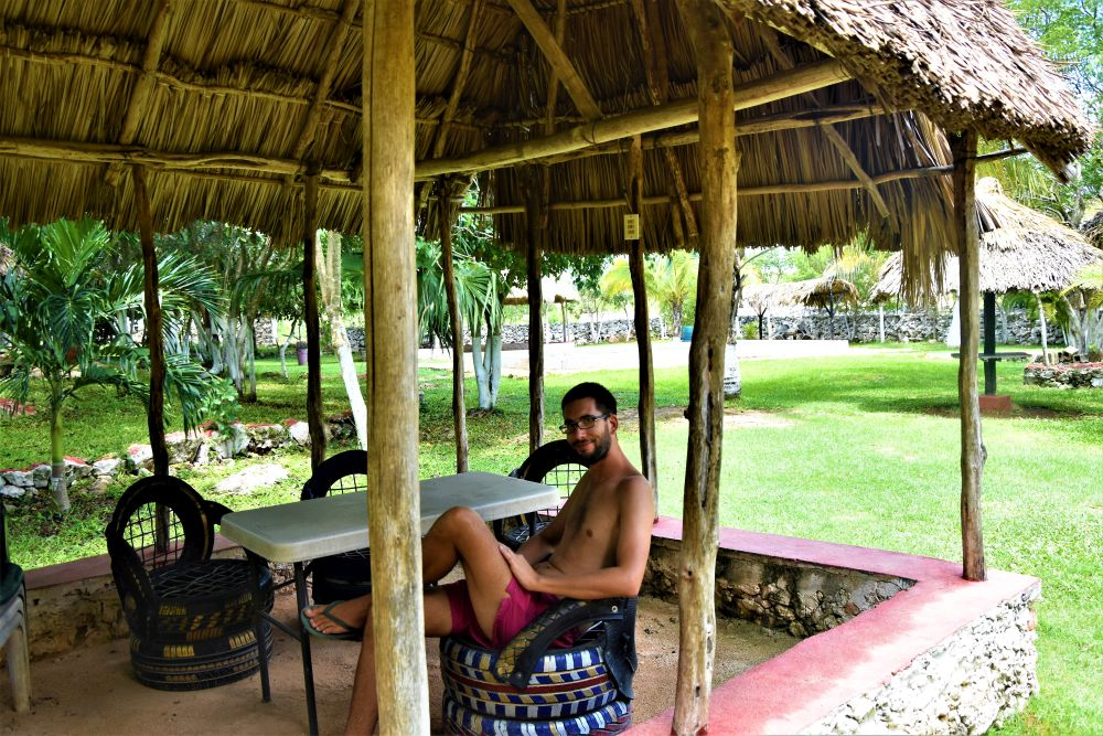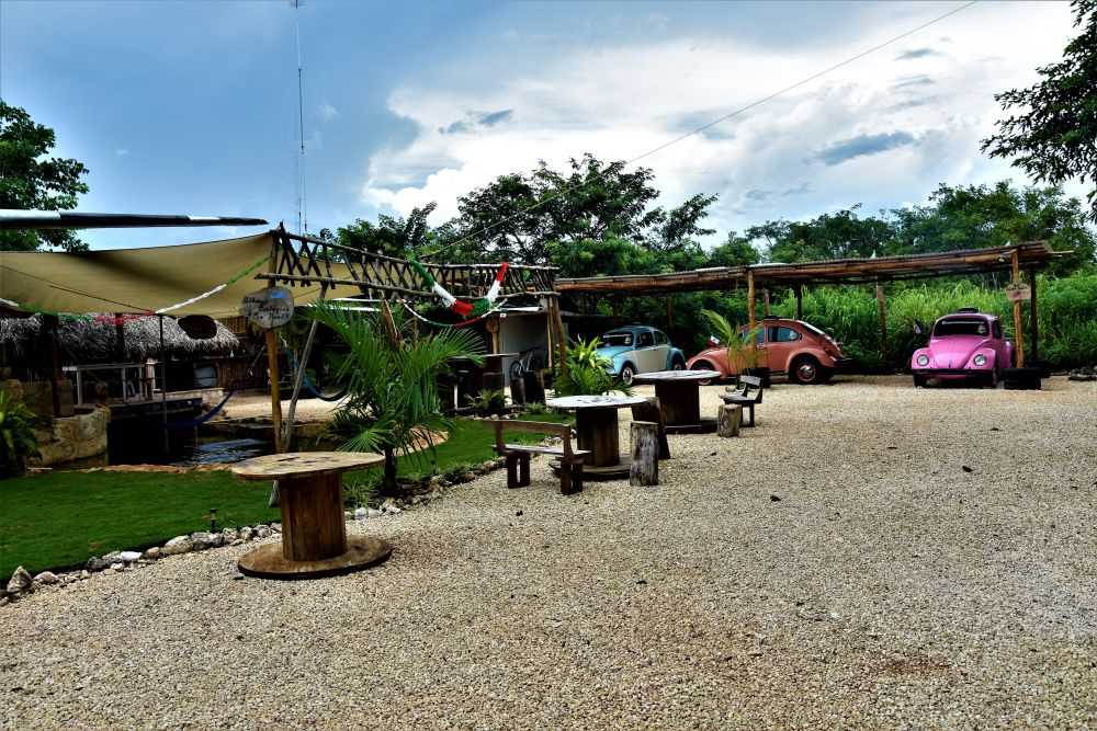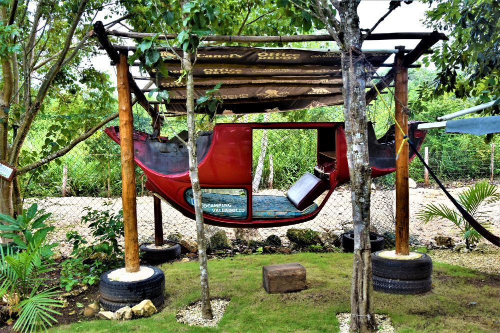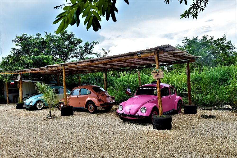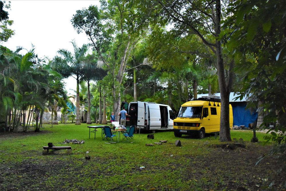 Zum Übernachten steuern wir an diesem Tag noch einen Campingplatz der besonderen Art an. Einen „Eco-Campground“ der uns von anderen Reisenden empfohlen wurde. Der relative neue Platz liegt ca. 5 Kilometer südlich von Valladolid und bietet neben ein paar Plätzen für Wohnmobile auch VW-Busse und VW-Käfer, die zum Übernachten umgebaut wurden. Eine tolle Idee wie wir finden. Der freundliche Besitzer zeigt uns das Areal und seine ganzen umgebauten Fahrzeuge. Das absolute Highlight des Campgrounds befindet sich derzeit noch im Aufbau. Mitten im Platz steht ein riesiges Flugzeug, vermutlich mal irgendwo abgestürzt. Das wird die „Loft“ des Campingplatzes, erzählt er uns stolz. Wir richten es uns gemütlich ein, kühlen uns noch ein wenig im Swimmingpool ab (es war eher ein kleines Becken mit diesen Spa-Fischen, die an der Haut knabbern) und kochen uns dann leckere Tortillas. Die gibt’s hier kiloweise frisch an jeder Ecke für ein paar Cent. Super lecker und so viel, dass man zu viert echt Mühe hat alle zu essen.