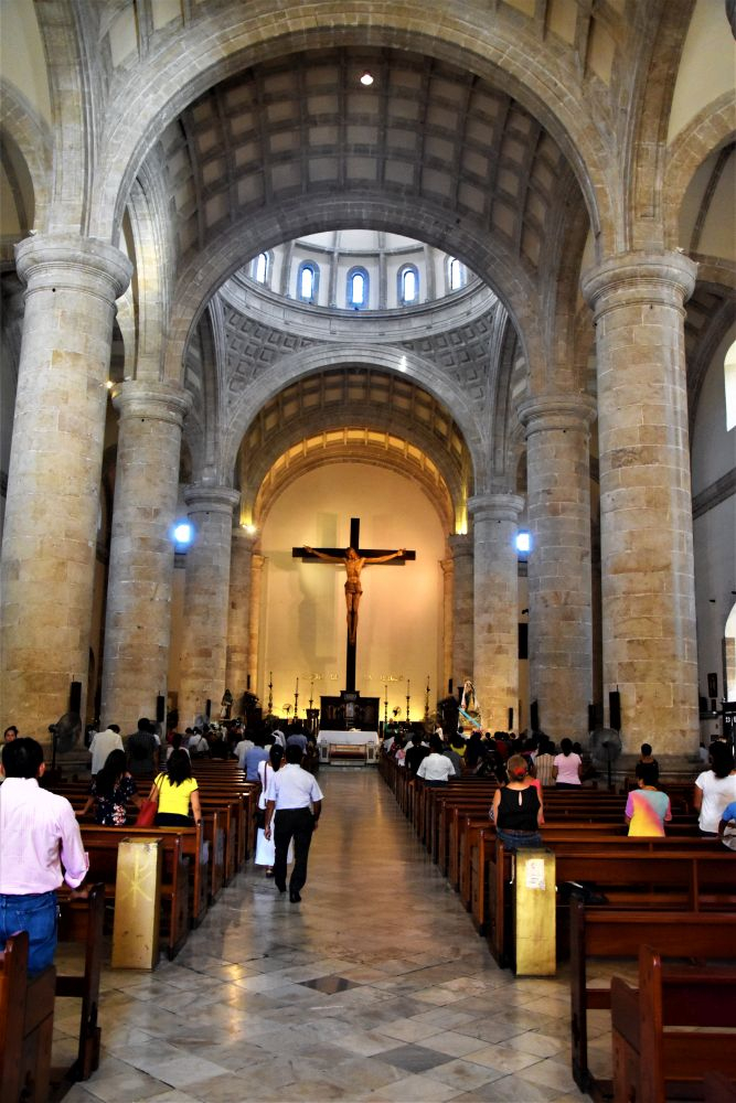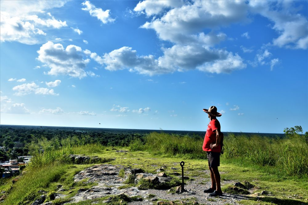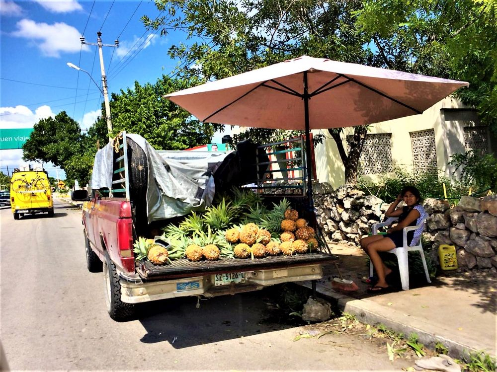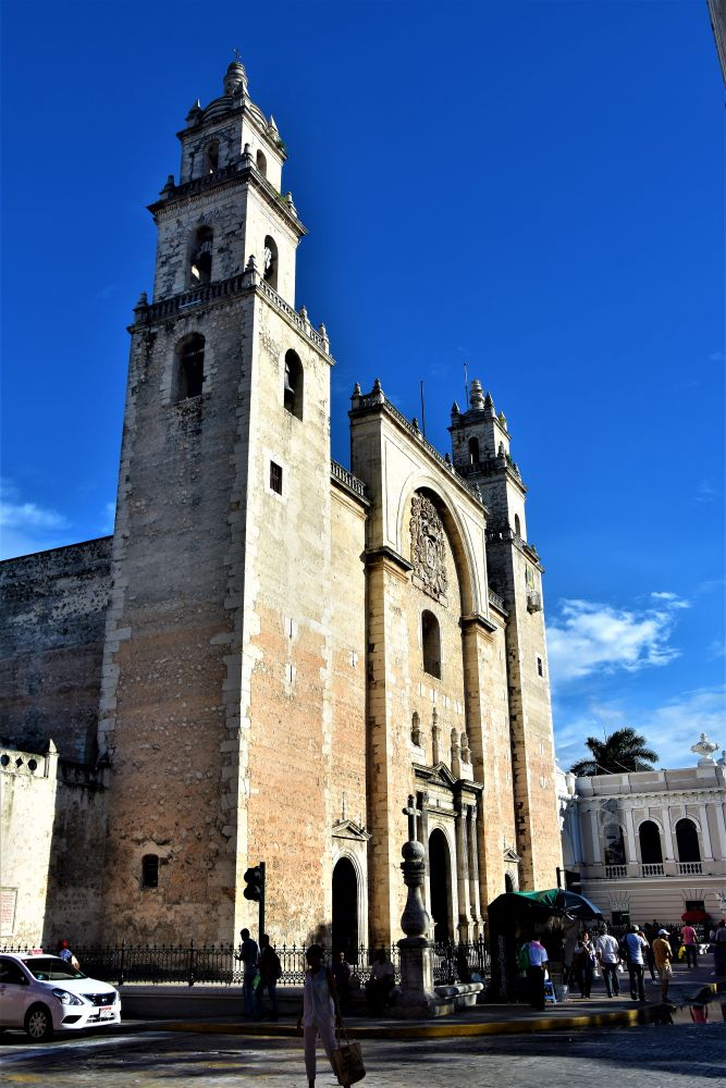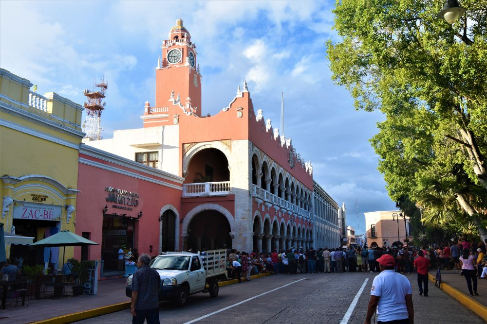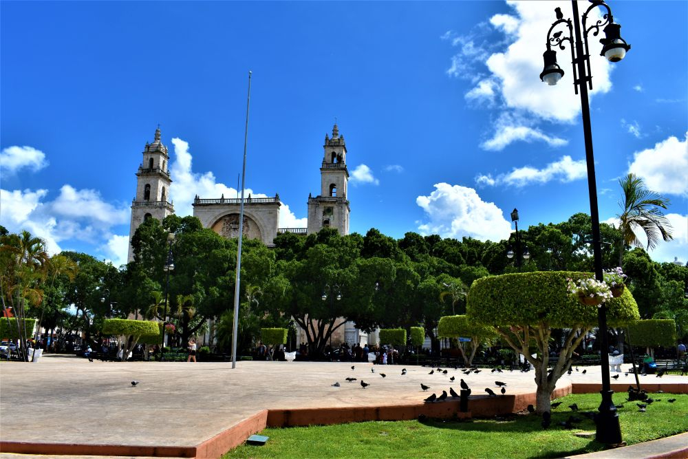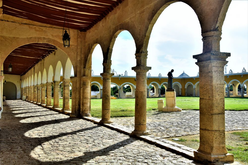 Weiter gings mit unserer geplanten Tour durch Yucatan. Die Stadt Izamal stand auf dem Programm, da es hier tolle alte Gebäude, alle in Gelb, zu sehen gibt. Die ganze Stadt ist bekannt für seine gelben Fassaden. Wir parkten am zentralen Plaza der Stadt und erkundeten die umliegenden Gebäude. In Izamal befinden sich sogar alte Maya Ruinen, die man kostenlos betreten darf. Man kann auf eine Pyramide steigen und bekommt einen wunderbaren Ausblick über die Kleinstadt. Uns hat die Stadt sehr gut gefallen. Das Beste war, dass wir noch einen richtig tollen Platz zum Übernachten gefunden haben. Ein altes Hotel, das leider schon etwas in die Jahre gekommen ist aber den Hotelgarten für Wohnmobile anbietet. Wir campieren mitten im Grünen und können die sanitären Anlagen und den Swimmingpool benutzen.