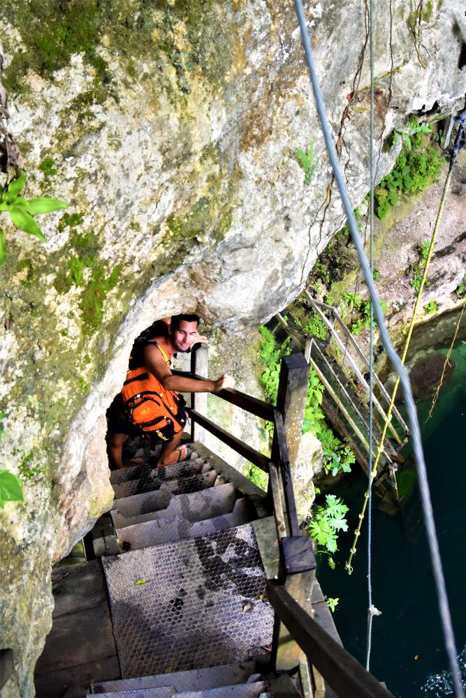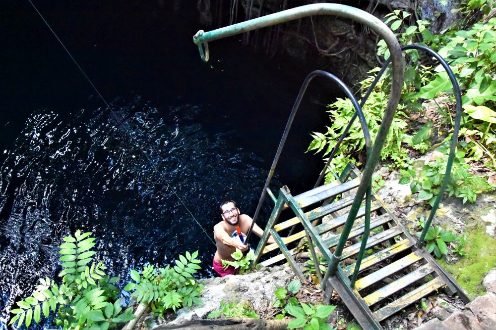 Obwohl es in Honum bestimmt noch viele weiter tolle Dinge zu entdecken gegeben hätte, hatten wir auf dem Weg nach Tulum noch eine bestimmte Cenote im nächsten Ort im Sinn. Etwas abgelegen in einem kleinen Dorf namens Lol-Ha kann man in eine offene Cenote steigen. Etwa 7-8 Meter führte eine wackelige alte rostige Leiter bis zur Wasseroberfläche der Cenote. Das Wasser war richtig schön tiefblau und klar. Wunderschön und bis auf drei einheimische Jungs, die richtig Spaß daran hatten aus 4 oder 5 Metern Höhe ins Wasser zu springen, hatten wir die Cenote für uns alleine.
