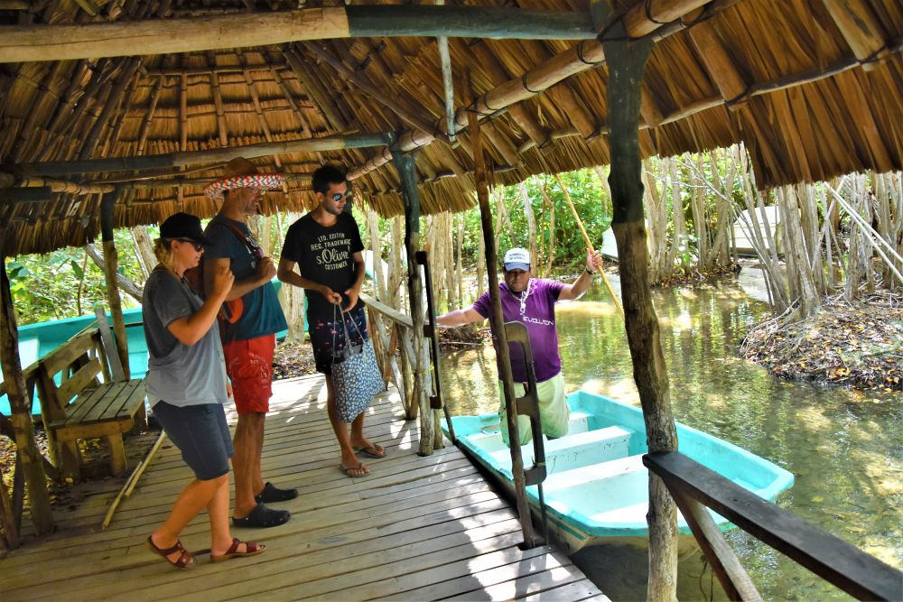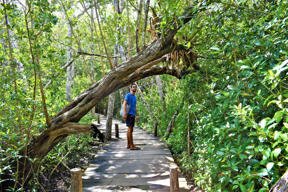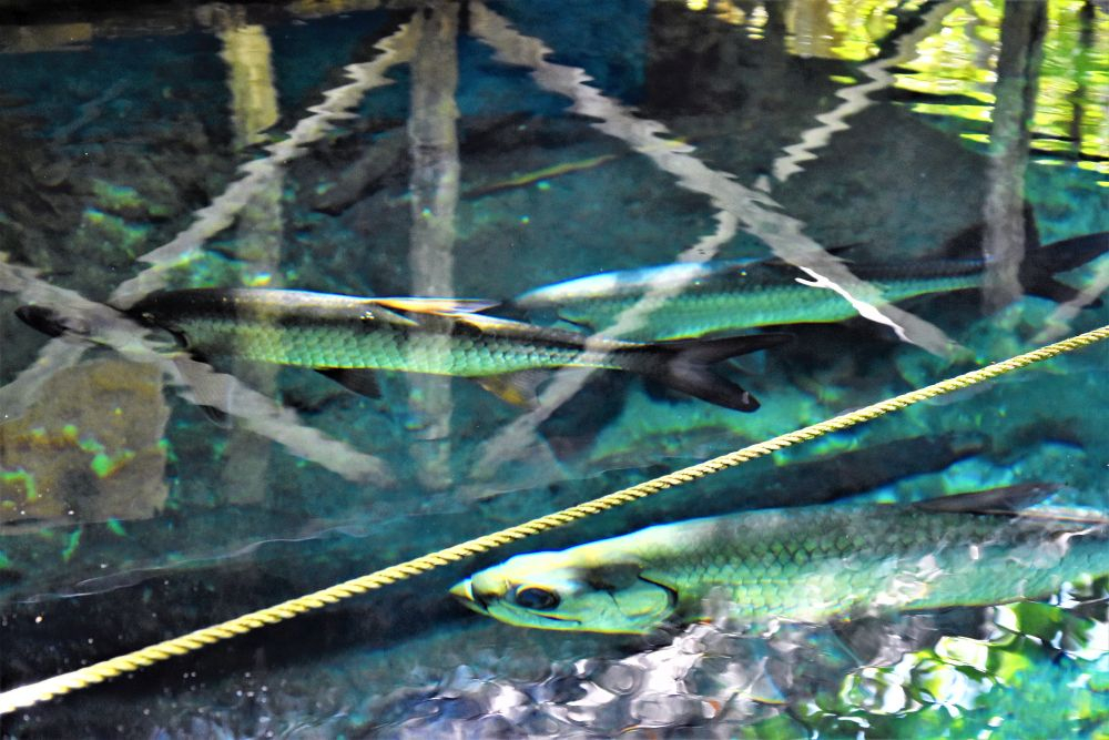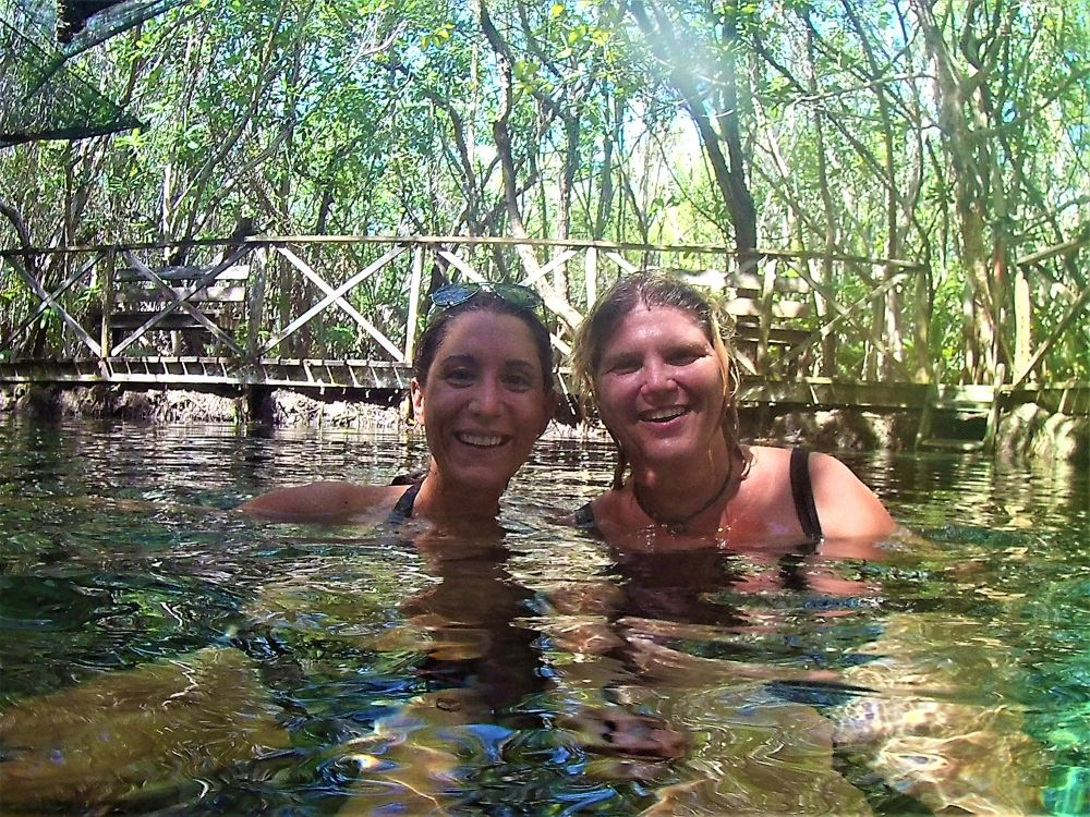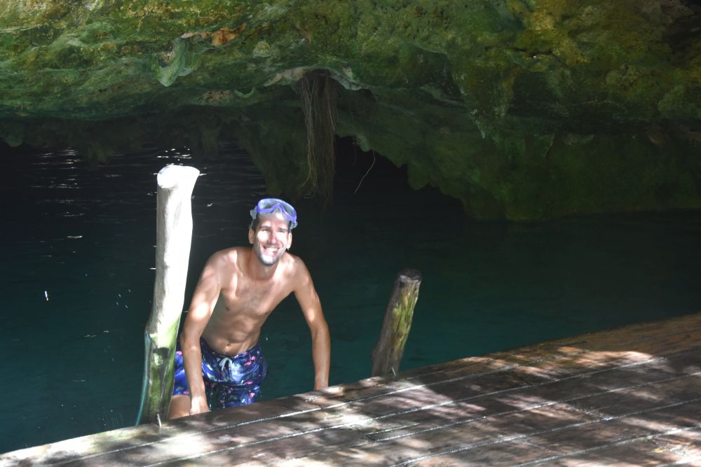 Der kleine Ort San Crisanto liegt wieder direkt an der Golfküste im Norden. Wir wollten dort hin, da es hier den angeblich schönsten Campingplatz in ganz Mexiko gibt. Wir fuhren also dort hin, machten unsere Rechnung aber ohne die flexiblen Arbeits- und Öffnungszeiten der Mexikaner. Wie gesagt, man fühlt sich irgendwie immer noch wie in Südamerika. Es war Freitagnachmittag und der Platz war einfach zu. Ohne Hinweis, ohne Telefonnummer. In dem nächsten kleineren Dorf fanden wir dann einen anderen Campingplatz. Von „schönster Platz“ waren wir zwar weit entfernt, doch dafür wurden wir gleich von einem Hundewelpen begrüßt und bekamen gute Tipps zur Umgebung vom zugekifften Besitzer. Wir beschlossen noch eine geführte Tour durch die dortigen Mangrovenwälder zu machen. Man fährt quasi mit einer kleinen Nussschale durch das Mangroven-Sumpfgebiet und landet an einer Cenote mitten im Wald. Der Ausflug entpuppte sich dann als echtes Highlight. Die Cenote war glasklar und beherbergte Fische mit 70-80 cm Größe. Das waren schon ganz schöne Kaliber und wir fragten unseren Guide erst mal ob es schon sicher ist zu Baden… doch er schmunzelte nur und sagte: „Logisch! Die tun nichts“. Na ok… irgendwie unwohl fühlten wir uns am Anfang zwar schon, aber die Fische interessierten sich dann zum Glück wirklich nicht für uns. Ein einmaliges Erlebnis welches wir nur empfehlen können! Man fühlt sich wie in einem riesigen Aquarium.