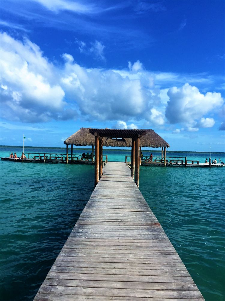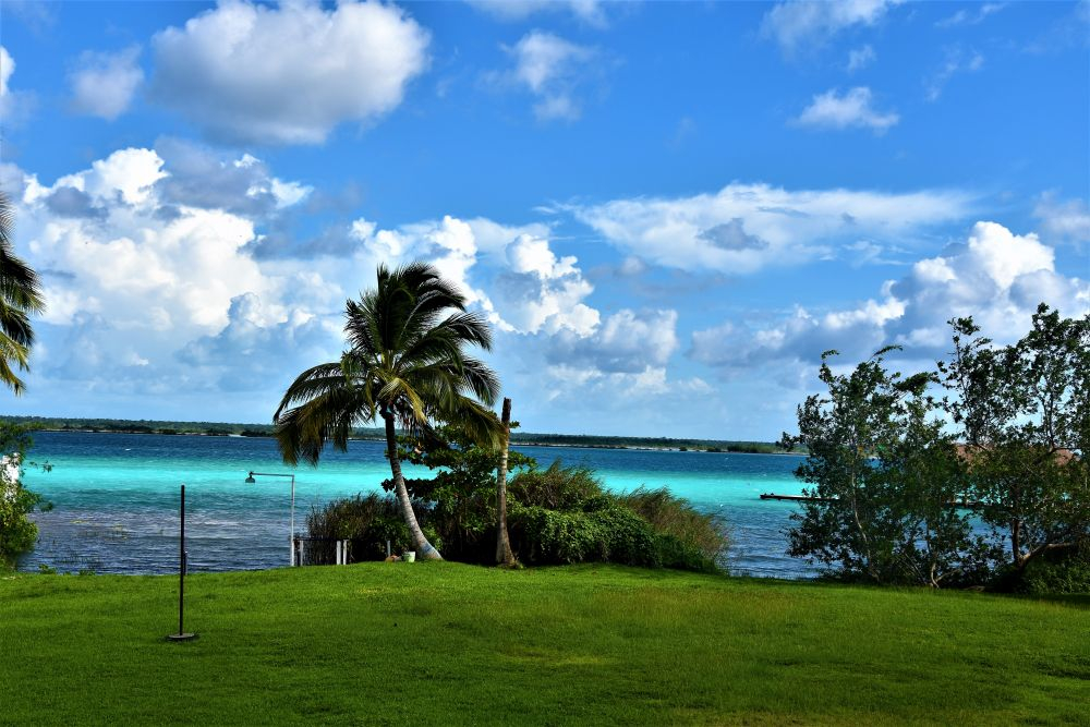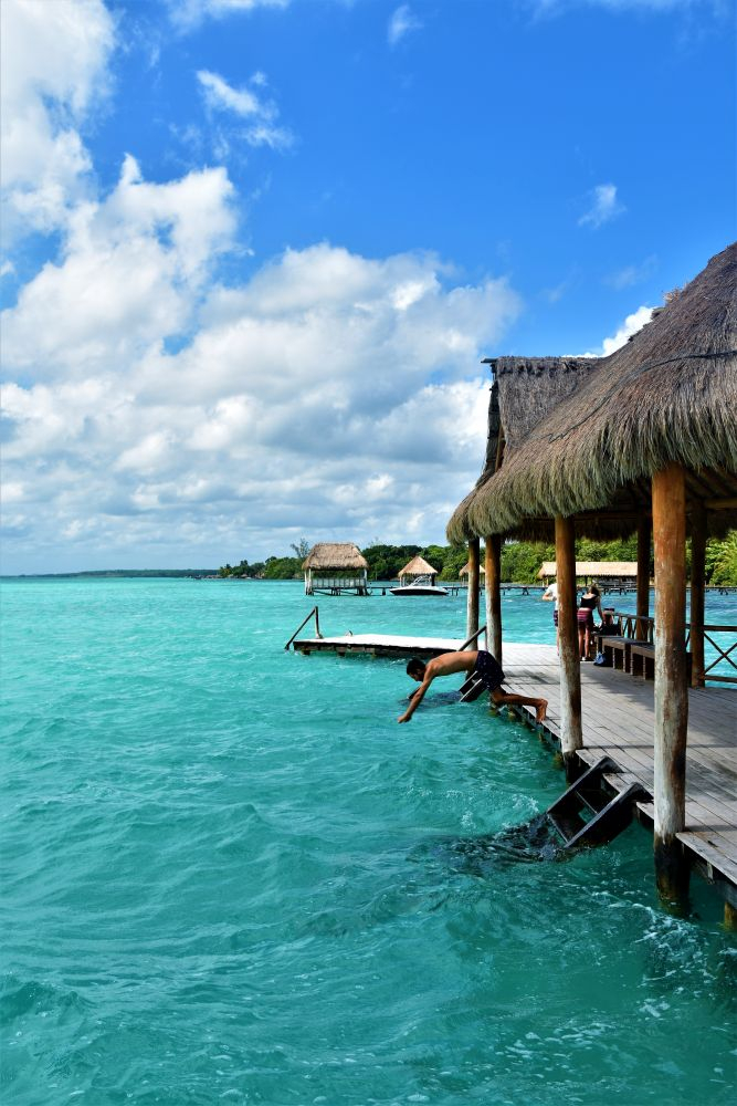 Der Bacalar See mit der gleichnamigen Ortschaft liegt etwa 200 Kilometer südlich von Tulum und gilt als wahres Paradies. Im Internet stolpert man oft über diese, fast schon kitschigen, Bilder die einen türkisblauen See mit einem Steg und einer von Stroh bedeckten Hütte zeigen. Das ist oft der Bacalar See. Leider konnten wir den aufgrund der Entfernung nicht gemeinsam mit Matthias Eltern besuchen, so beschlossen wir auf dem Weg nach Chiapas dort noch einen längeren Halt zu machen. Ja und er war wirklich so toll wie alle gesagt haben. Beim „See der sieben Farben“ handelt es sich mehr um unterschiedliche Blautöne. Wenn die Sonne auf den See scheint, erstrahlen die Farben in voller Pracht. Wir hatten leider etwas wechselhaftes Wetter erwischt und freuten uns daher um jeden Sonnenstrahl. Die Regenzeit macht sich auch hier immer wieder bemerkbar. Es regnet immer wieder mal, dann scheint die Sonne, dann ist es bewölkt und etwas kühler, dann wieder schwül heiß, dann wieder Gewitter und dazwischen immer wieder ein paar Regentropfen. Stört uns aber nicht. Im Gegenteil – wir freuen uns echt wieder auf etwas milderes Klima…