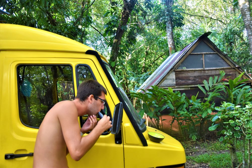 Unser zweiter Versuch endlich an den türkisblauen Rio Lacantun zu kommen brachte uns in ein kleines gemütliches Dorf namens Zacualtipan. Wieder mal wurden wir von den Dorfbewohnern mit großen Augen angeschaut als wäre ein Ufo gelandet. Die meisten schauen anfangs immer recht düster drein, doch wenn man dann zu winkt und freundlich grüßt, kommt ihnen immer ein Lächeln aus und sie grüßen zurück. Wir stellten Erwin direkt am Fluss ab und sahen, dass wir unsere Rechnung ohne die Regenzeit gemacht hatten. Der Fluss war ungefähr zwei Meter höher als sonst und „wunderschön“ braun. Leider nicht so wie erhofft, doch der Platz war trotzdem einer der schönsten Wild-Camping Stellplätze, die wir bisher hatten. Ganz alleine direkt am Fluss unter Bäumen, was will man mehr. Die Dorfbewohner waren unglaublich nett und interessiert an uns. Wir kamen mit einigen ins Gespräch und erfuhren so auch über das Leben weit abseits der großen Städte. Ein Bauer erzählte, dass er für drei Jahre in USA arbeiten „musste“ um seine Familie zu ernähren. Er verdient als Arbeiter auf einer Bananenplantage derzeit zwischen 100 und 150 Pesos pro Tag. Das sind gerade mal 5-7 Euro. Ganze 3 Tage verbrachten wir dort am Fluss unter den Dorfbewohnern, die immer zum Abend hin vorbei kamen um sich selbst und ihre Wäsche am Fluss zu waschen. Ein selbsternannter Guide des Dorfes bot uns dann noch eine kurze Wanderung an, da er sich gut mit den Pflanzen und Tieren der Region auskennt. Er war recht nett und nach einem kurzen Gespräch vereinbarten wir eine kurze Tour mit ihm. Er zeigte uns zunächst eine versteckte Höhle mitten in den Bergen. Ganz interessant wie sowas über die Jahrtausende entstehen konnte. Nachdem uns dann aber ein paar Fledermäuse gegen den Kopf geflogen sind, waren wir auch wieder froh die Gruft verlassen zu können. Wir wollten mehr über die Pflanzen wissen. Unser Guide hatte ein unglaubliches Wissen und das ist für die Menschen auch unabdingbar, da die nächste Apotheke nicht nur Kilometerweit weg ist, sondern die Medikamente für die Meisten auch unbezahlbar sind. Unser Guide zeigte uns unter anderem auch einen Baum, der für die Kaugummiproduktion (Arbol Orbit… oder so :-D) verwendet wird. Wir kamen in den Genuss von Kakao… also nicht den Kakao den wir fertig pulverisiert kennen, sondern die Pflanze. Die hatten wir zwar schon mal in Kolumbien gesehen doch hier durften wir sogar kosten. Und so eine Kakao Frucht schmeckt echt gut. Schön süß und fruchtig. Es war richtig interessant. Wir gingen einfach den Weg entlang und er riss einfach irgendwas aus: „Das ist Arnica… probiert mal“ oder: „Das sind echte Orchideen. Die wachsen hier wild und kosten in den USA ein Vermögen…“ Einen Tukan haben wir leider nicht mehr gesehen, doch dafür eine mindestens genauso seltene Spezies: Matthias beim Joggen 😉
