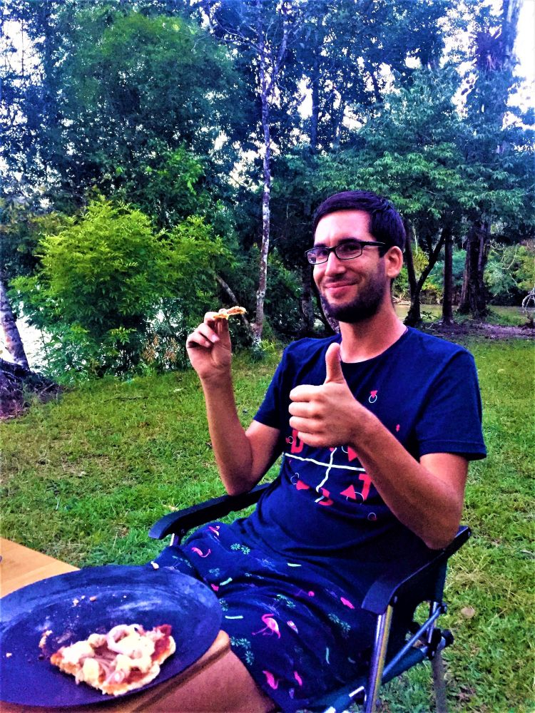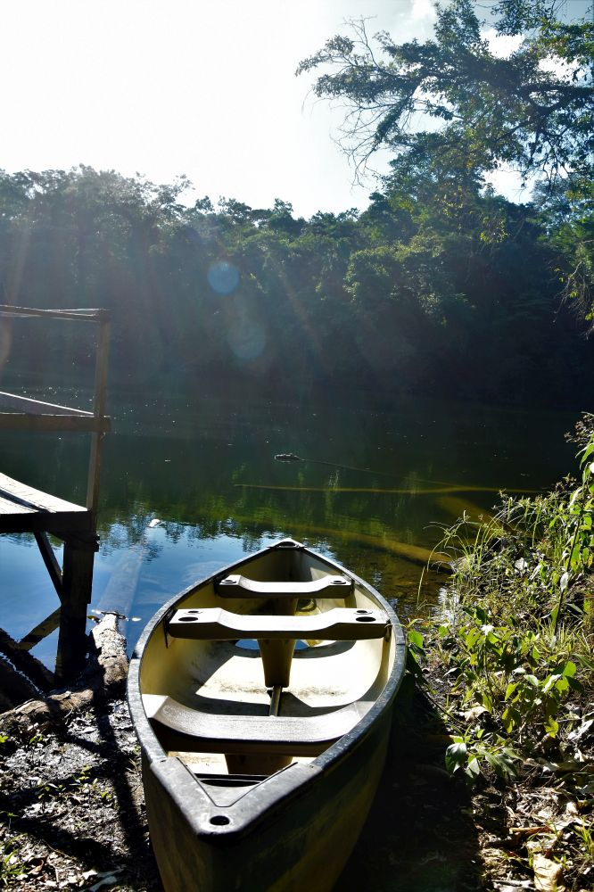 Wir legten gleich am ersten Tag einige Kilometer zurück, da die Strecke bis auf einige knietiefe Schlaglöcher gut ausgebaut war. Das gemeine an den Löchern war eigentlich nur, dass man sie wegen des Schattens der Bäume nur sehr schwer auf der Straße sehen konnte. Doch im Slalomfahren sind wir ja mittlerweile geübt und dank einheimischer Collectivos und LKWs, die hier scheinbar täglich fahren, kamen wir wunderbar durch. Unser erstes Ziel war das Santuario del cocodrilo bei Tres Lagunas. Ein schöner Platz mit 3 kleinen Lagunen und einer kleinen Auffangstation für gerettete Tiere. Die Menschen dort achten noch sehr auf Flora und Fauna was hier leider nicht selbstverständlich ist. Brandrodung, moderne Landwirtschaft und Müll sind auch hier allgegenwärtig. Zur Freude von Stephanie hatte der Campingplatz einen geretteten Tukan, der immer zwischen den Cabanas herum hüpfte. Ein wunderschöner makelloser Vogel.