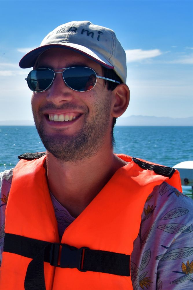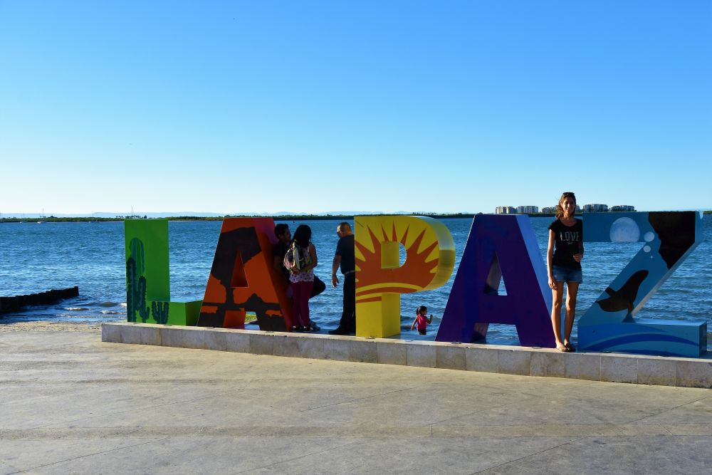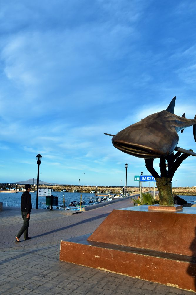 Unser erstes Ziel in Baja California war unweigerlich La Paz (wir kamen ja mit der Fähre dort an). Hier hat man die Chance von Herbst bis Frühjahr mit Walhaien zu schnorcheln. Die Walhaie kommen jedes Jahr nach La Paz, um in der Bucht „el Mogote“ Plankton zu fressen. Zu dieser Jahreszeit ist das „Whalewatching“ quasi zu 100% garantiert. Gleich an unserem ersten Abend schlenderten wir am Malecon, der Uferpromenade von La Paz entlang und wählten den für uns geeignetsten Touranbieter für den nächsten Tag aus. In der Regel nehmen wir den Touranbieter, der am wenigsten aufdringlich ist und das beste Angebot macht. Matthias war bei dem Gedanken im offenen Meer zu schwimmen schon etwas mulmig. Dann auch noch mit den größten Säugetieren der Welt… aber jetzt gab es keinen zurück mehr, die Tour war gebucht. Am nächsten Morgen sollte es pünktlich um 8.30 Uhr losgehen. Natürlich waren wir wieder überpünktlich um 8:15 Uhr am vereinbarten Treffpunkt. Und damit waren wir sogar noch vor unseren Touranbietern vor Ort. Naja, irgendwann kam aber dann doch Bewegung in die Sache und nur 5 Minuten nachdem wir mit unserem Bott ablegten, wurden wir schon wieder langsamer und hielten Ausschau nach den Walhaien. Der einzige Haken an diesem Tag war das Wetter. Eigentlich ist es ja fast immer schön auf Baja, aber an diesem Tag hatten wir leider Pech. Im Wasser ging es ja noch, da der Pazifik recht mild ist, aber sobald wir wieder auf dem Schiff waren, froren wir alle dank des kalten Windes.