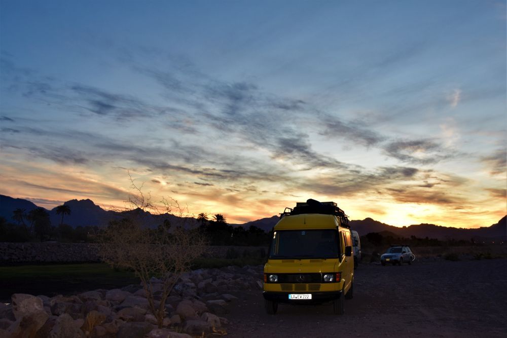 Nach dem langen anstrengenden Tag im Auto erreichten wir abends einen einsamen Strandplatz mit ganzen 3 Palmen. Wunderschön gelegen und direkter Meerblick. Doch aufgrund der Hauptsaison konnten wir in jeden noch so kleinen Feldweg fahren – es war überall was los. So auch an diesem Platz. Wir gesellten uns zu eine jungen amerikanischen Paar, die ebenfalls mit Mercedes Sprinter unterwegs waren. Dann wurden wir auch prompt ganz spontan zum gemeinsamen Dinner eingeladen. Abgerundet wurde der schöne laue Sommerabend am Lagerfeuer mit netten Gesprächen und Gitarren Musik eines südamerikanischen Paares, welches zu später Stunde auch noch den Weg zu dem 3-Palmen Stellplatz gefunden hatte.