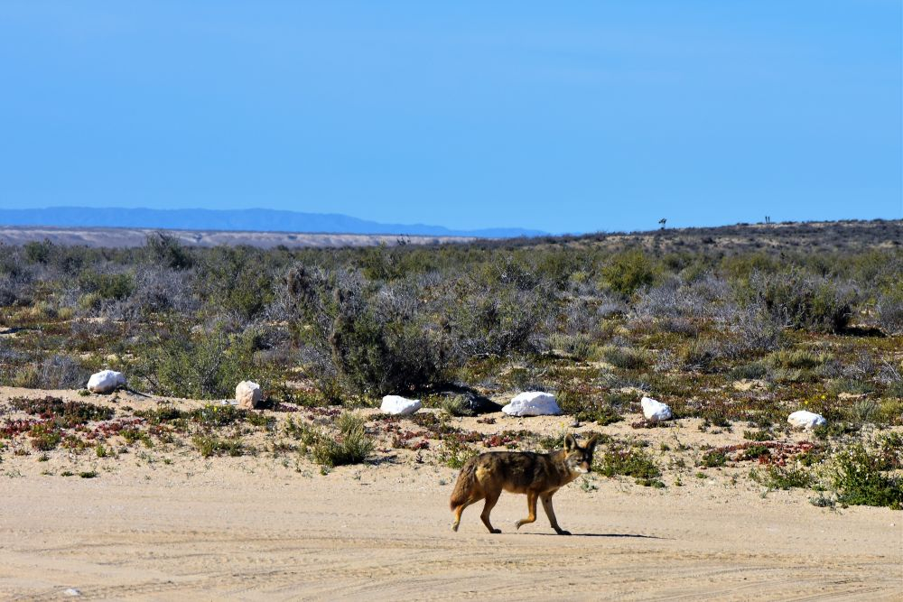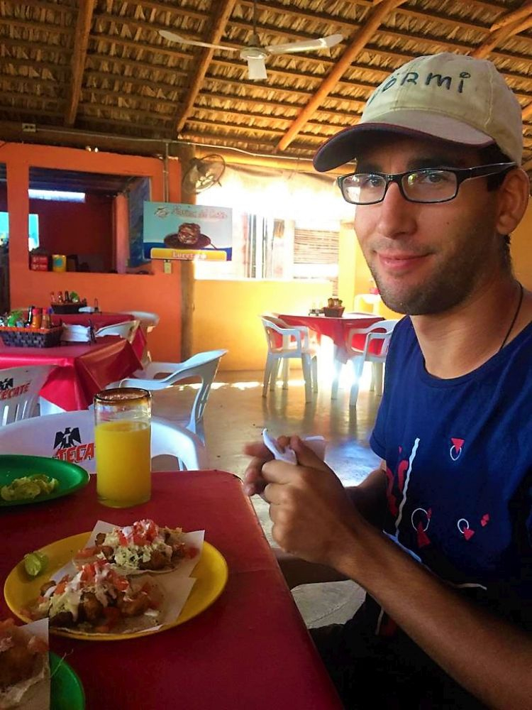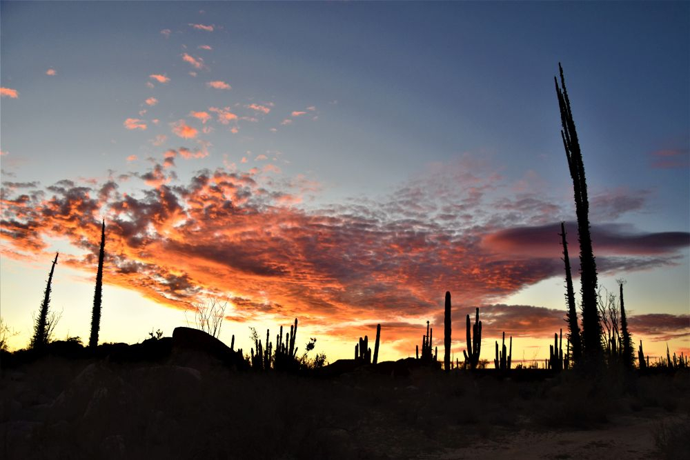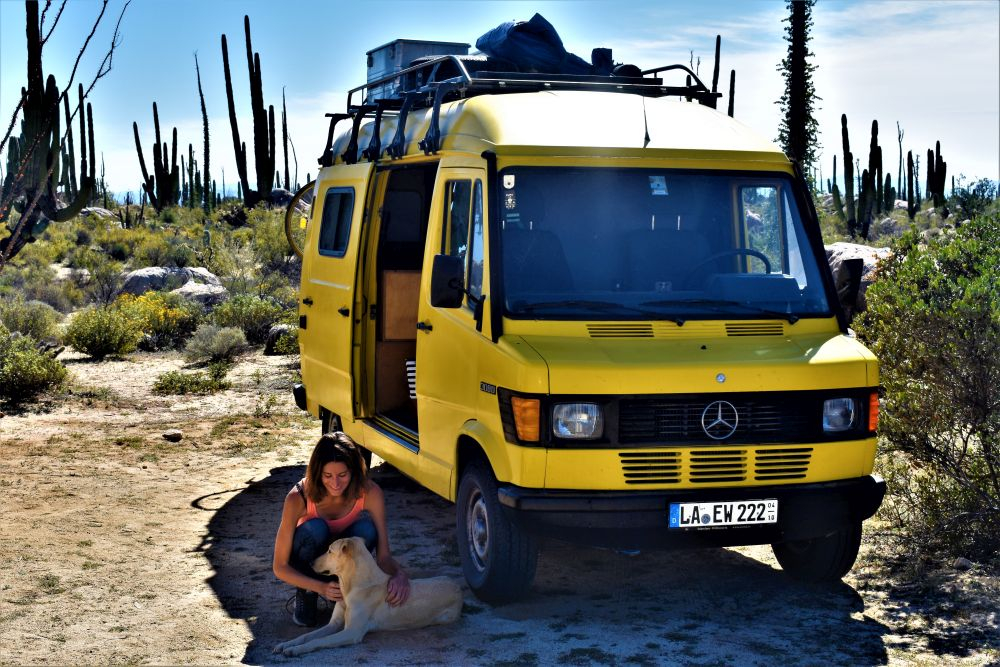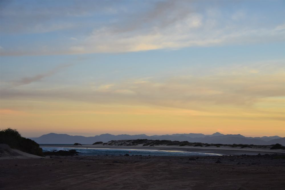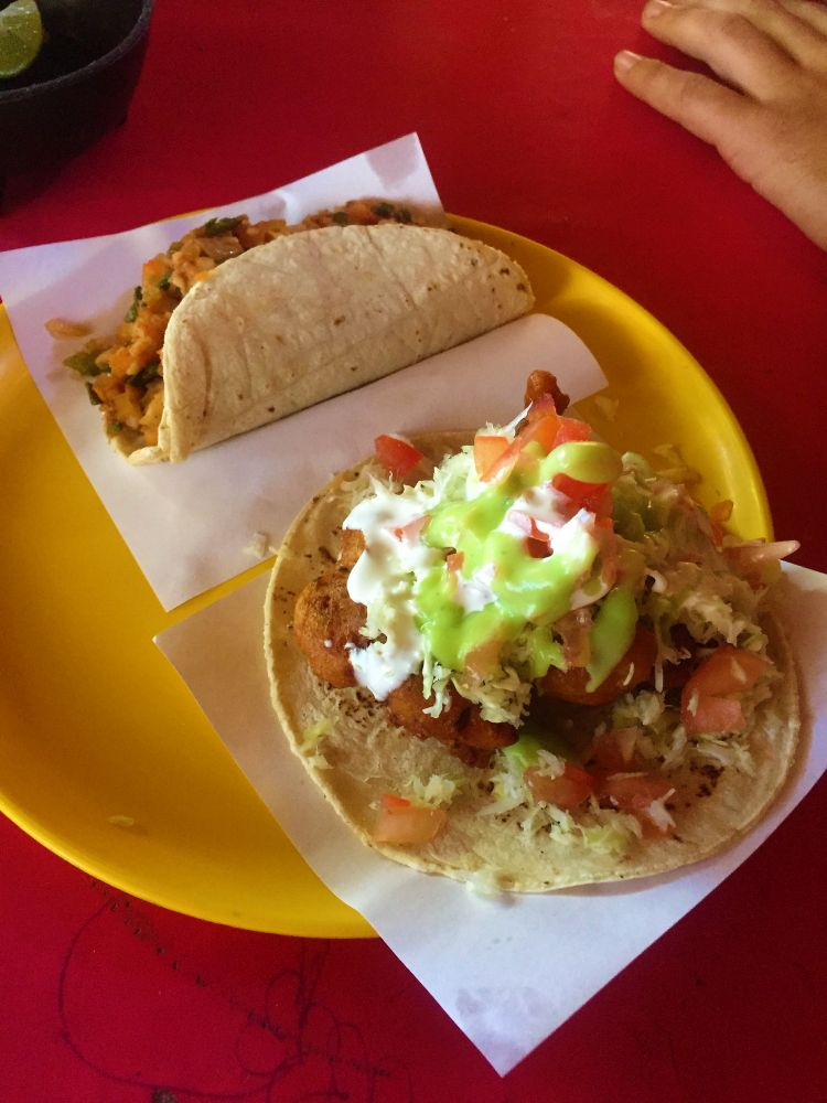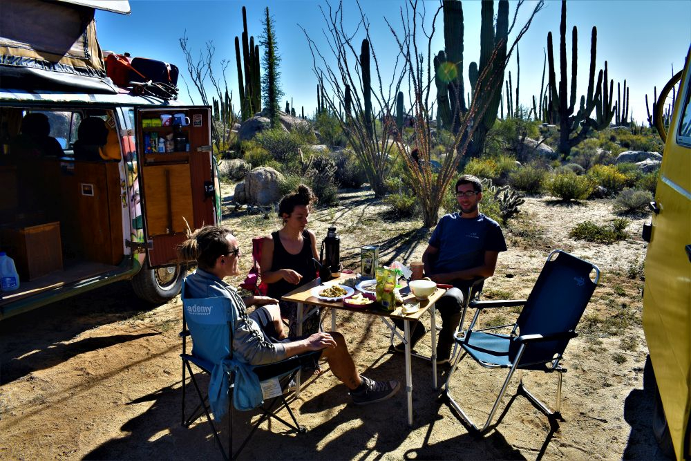 In der Hoffnung den Touristen doch noch etwas zu entkommen fuhren wir am nächsten Tag bereits wieder weiter. Die Fahrt entlang der ungeteerten, buckligen und sandigen Küstenstraße machte uns richtig Spaß. Aber was gibt es auch über eine Straße zu meckern, wenn man vom Erwin aus den Walen beim Planschen zusehen kann? 😉 Hängen blieben wir dann irgendwann in Los Frailes bei einer wunderschönen Bucht, wo neben mehreren Overlandern auch viele Dauercamper ihren Platz gefunden haben. So viele Reisende, Aussteiger, Lebenskünstler und Winterflüchtlinge wie auf Baja haben wir wahrscheinlich auf unserer ganzen Reise noch nicht getroffen. Aber es ist auch wirklich schön und es macht auch jedes Mal wieder Freude Erfahrungen auszutauschen. An diesem Ort bekamen wir das erste mal den heftigen Wind auf Baja zu spüren, der uns hin und wieder an die Zeit in Patagonien erinnerte. Wir wagten uns trotzdem ins Wasser zum Schnorcheln… aber es blieb dann leider auch bei dem einen Mal. Wir hatten auch irgendwie zu wenig Zeit, weil wir von einem Gespräch ins nächste kamen. Bei einer „Auto-Rettung“ (hier an der Bucht ist das wie bei „täglich grüßt das Murmeltier“, mindestens ein Fahrer täglich bleibt in dem weichen Sand stecken (wir nicht, denn wir lernen ja aus Fehlern und erkunden den Sand erst zu Fuß und lassen auch Luft aus den Reifen), lernten wir dann noch Codie und Cori aus Kanada kennen. Die beiden haben einen Mercedes Sprinter selbst zum Camper umgebaut und reisen nun durch Kanada, USA und Mexiko. Wir verbrachten einen tollen Abend gemeinsam und freuen uns schon die Beiden mit ihrem Hund Ozzy in Kanada wiederzusehen. Nach zwei Nächten ging es dann wieder weiter… Man merkt vielleicht, dass wir es recht eilig hatten zu der Zeit. Das war in der Tat so, denn auf den letzten Drücker wollten wir nicht an der Grenze zu USA erscheinen. Unsere verbleibenden Tage in Mexiko hatten wir sehr genau durchgeplant, damit wir das Visum nicht überziehen. Aufgrund des anhaltenden Windes machte es auch nicht wirklich Spaß einen weiteren Strandtag einzulegen und wir beschlossen letztendlich Richtung Norden weiter zu fahren. Nach einer Nacht außerhalb von La Paz (inklusive Sternenhimmel und gigantischer Sicht auf den Blutmond) legten wir am nächsten Tag mehrere Kilometer zurück. Daher blieb Mittag unsere Küche kalt und wir probierten das hiesige Essen. An dieser Stelle sei gesagt, wer jemals nach Baja kommt….unbedingt die Fisch- und Shrimp-Tacos probieren!! Am liebsten hätten wir nichts Anderes mehr gegessen.
