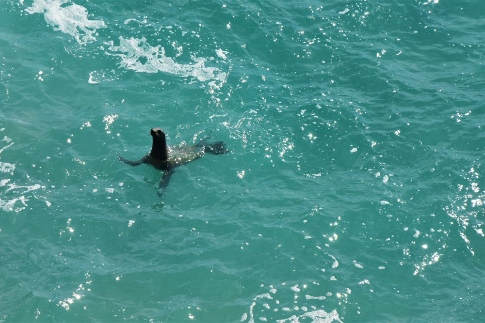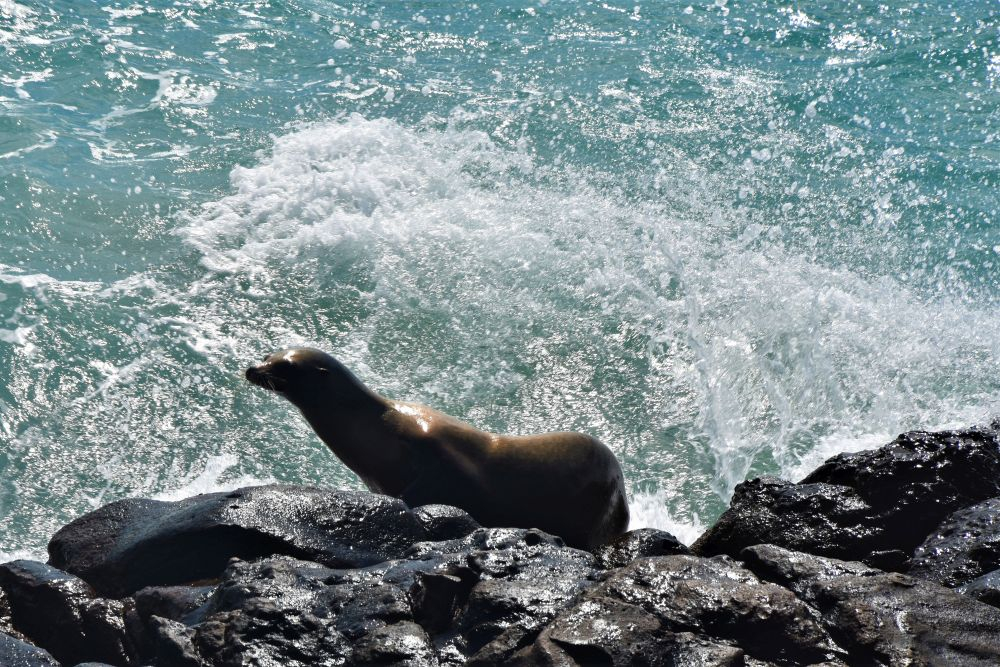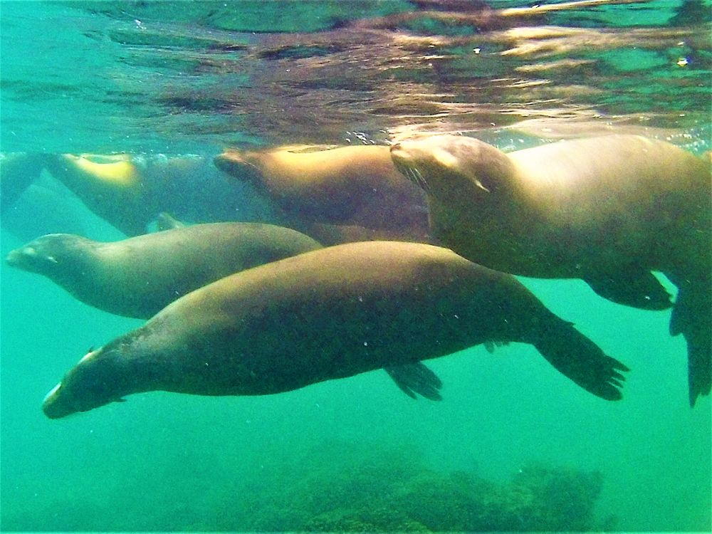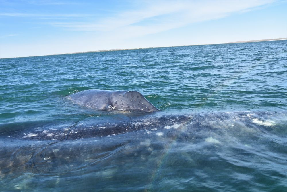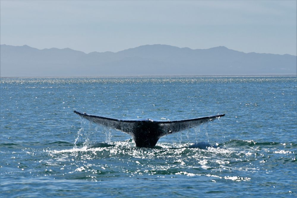 Am Vortag haben wir uns für eine zweigeteilte Tour entschieden. Neben den Walhaien stand noch eine weitere Fahrt zur etwa 32 km entfernten Insel Espiritu Santo an. Leider verschlechterte sich das Wetter immer mehr und es dauerte nicht lange bis der erste Regen einsetzte. Der zweite Teil unseres Ausflugs fiel also sprichwörtlich ins Wasser und aufwärmen konnten wir uns bei dem kalten Wind auch nicht mehr wirklich. Nach einem kurzen Mittagssnack unter einem Felsvorsprung besuchten wir noch eine Seelöwenkolonie. Auch hier wurde wieder geschnorchelt. Die rasante Fahrt zurück war dann unspektakulär und uns hat einfach nur gefroren. Den Teil des Ausfluges konnten wir also leider nicht wirklich genießen, es wollte gar nicht mehr aufhören zu regnen. Wir waren daher wirklich glücklich, als La Paz endlich wieder in Sicht war. Auf dem Rückweg hatten wir aber nochmals Glück und konnten ein paar Grauwale sehen. Im Erwin brauchte es dann erst mal viele Tassen Tee bis uns wieder einigermaßen warm war… zum Glück blieb das unser einziger Regentag auf Baja.