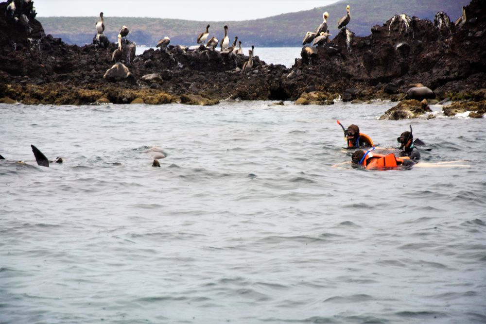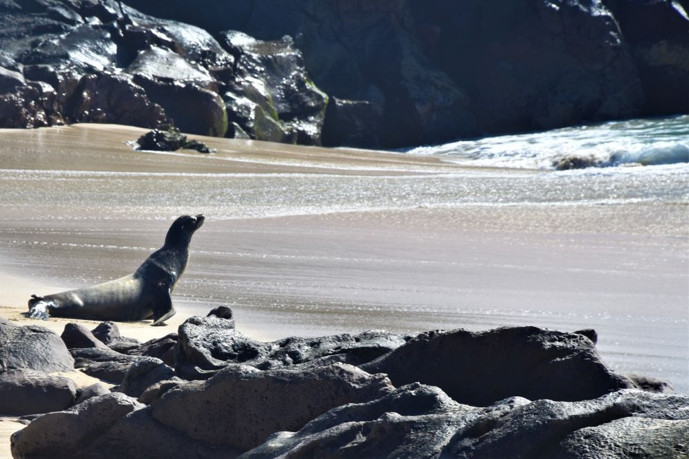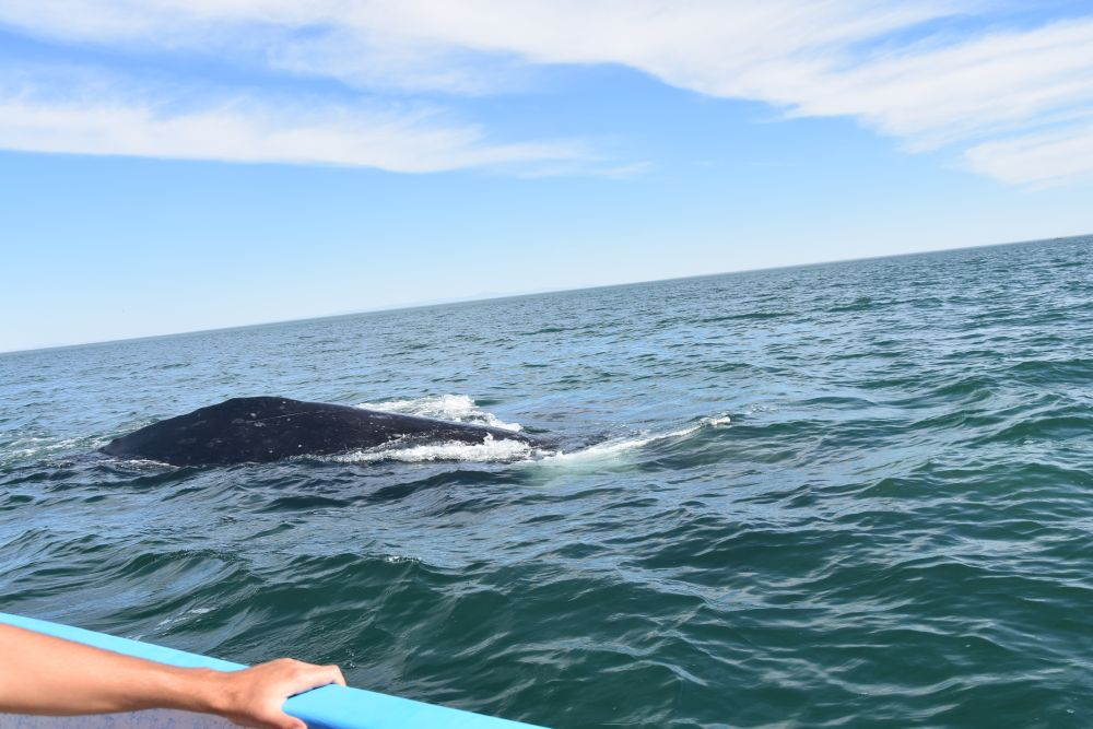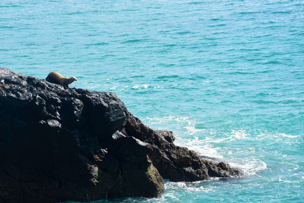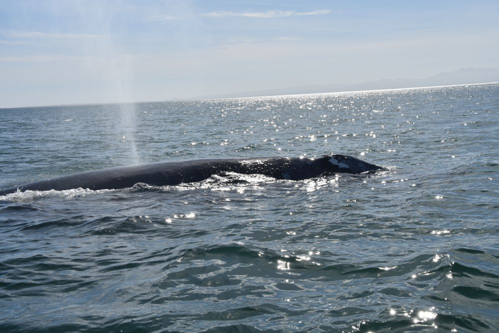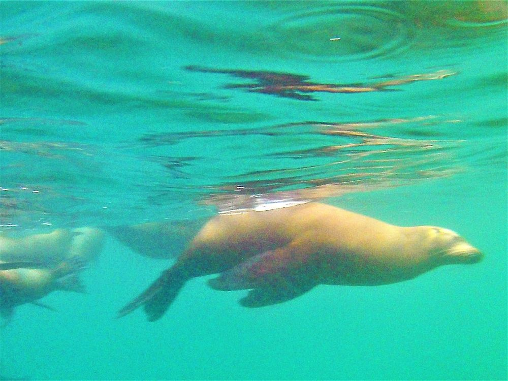 Am Vortag haben wir uns für eine zweigeteilte Tour entschieden. Neben den Walhaien stand noch eine weitere Fahrt zur etwa 32 km entfernten Insel Espiritu Santo an. Leider verschlechterte sich das Wetter immer mehr und es dauerte nicht lange bis der erste Regen einsetzte. Der zweite Teil unseres Ausflugs fiel also sprichwörtlich ins Wasser und aufwärmen konnten wir uns bei dem kalten Wind auch nicht mehr wirklich. Nach einem kurzen Mittagssnack unter einem Felsvorsprung besuchten wir noch eine Seelöwenkolonie. Auch hier wurde wieder geschnorchelt. Die rasante Fahrt zurück war dann unspektakulär und uns hat einfach nur gefroren. Den Teil des Ausfluges konnten wir also leider nicht wirklich genießen, es wollte gar nicht mehr aufhören zu regnen. Wir waren daher wirklich glücklich, als La Paz endlich wieder in Sicht war. Auf dem Rückweg hatten wir aber nochmals Glück und konnten ein paar Grauwale sehen. Im Erwin brauchte es dann erst mal viele Tassen Tee bis uns wieder einigermaßen warm war… zum Glück blieb das unser einziger Regentag auf Baja.