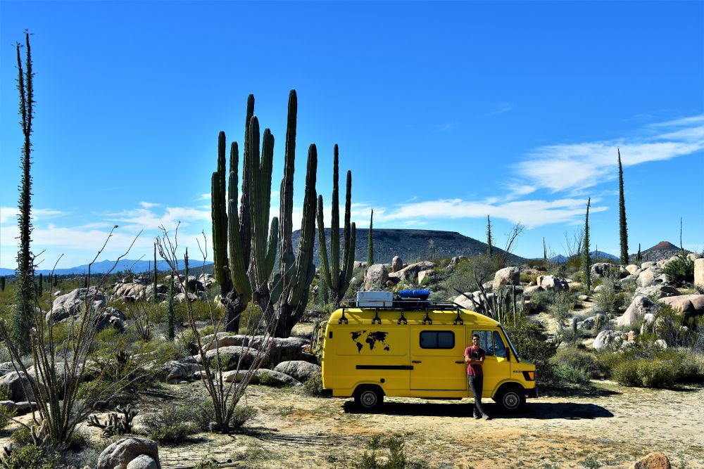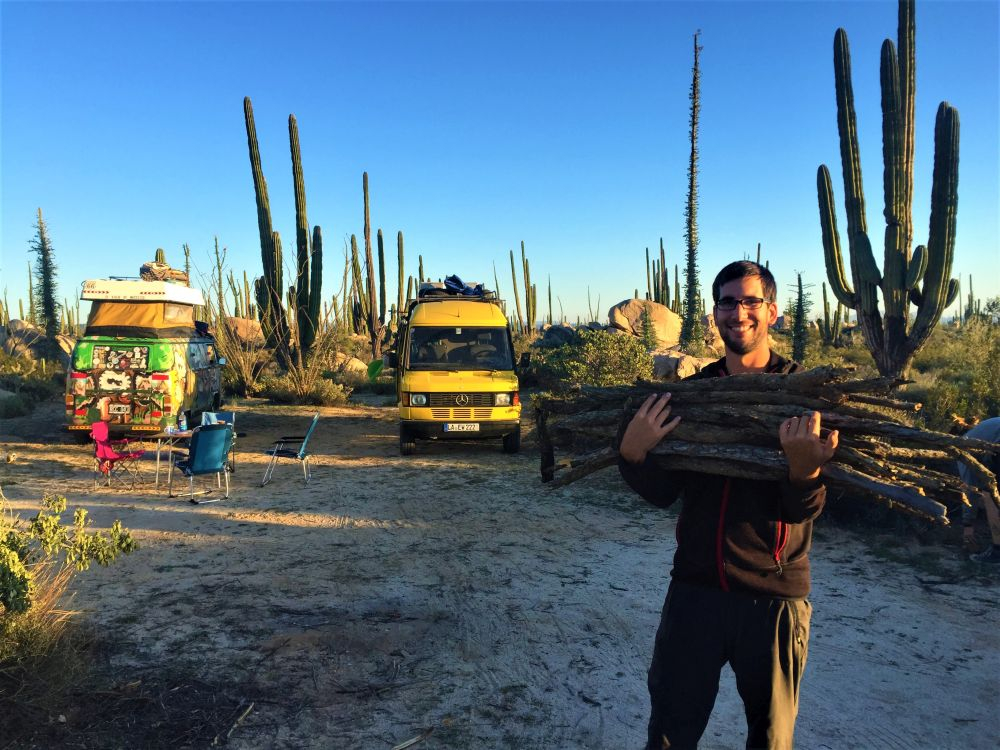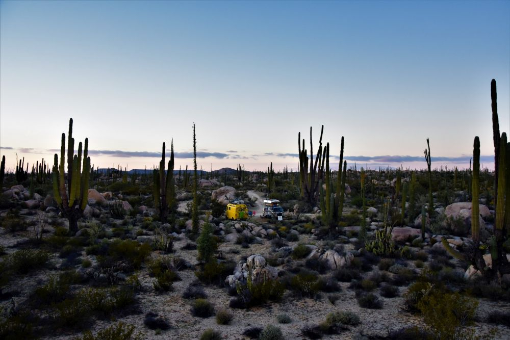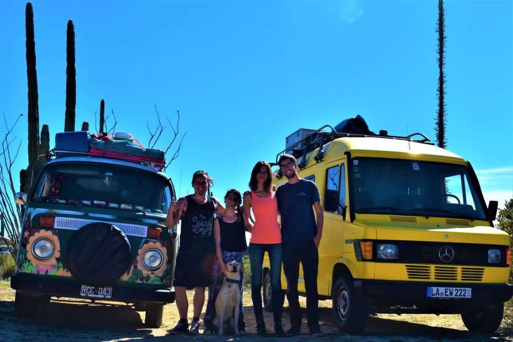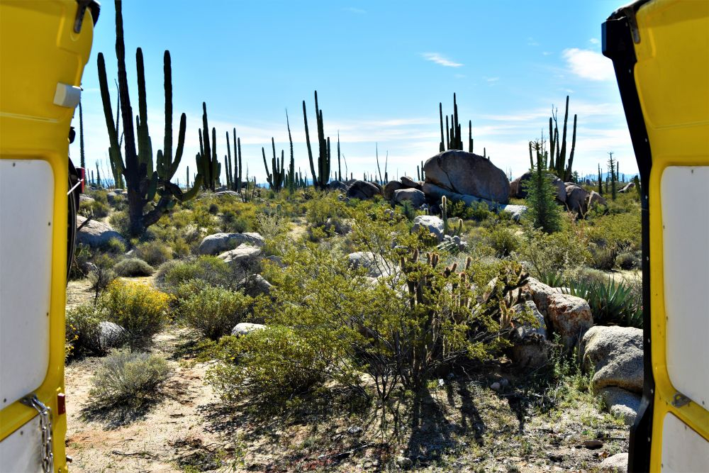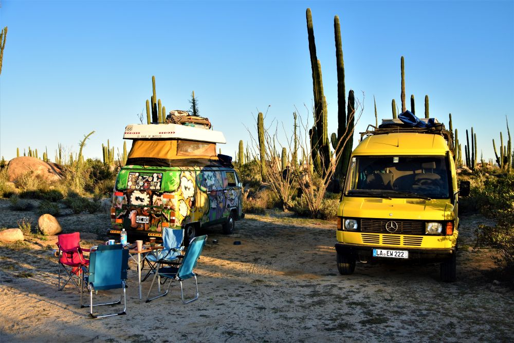 Wir waren nun schon recht weit im Norden von Baja angekommen. Das merkten wir nicht zuletzt an den Temperaturen. Bei einem kurzen Zwischenstopp an einem sehr einsamen Strand konnten wir nach einer kurzen Wanderung auch noch ein paar Seelöwen sehen. Die waren alles andere als scheu und wir hatten irgendwie das Gefühl, dass sie richtig Spaß hatten sich fotografieren zu lassen. In der Nähe einer alten Höhle, in der wir Felsmalereien bestaunen konnten, schlugen wir dann unser Nachtlager auf. Inmitten von Kakteen und Felsen waren wir für uns alleine. Wir wollten irgendwie gar nicht mehr weg von diesem Ort und umso besser war es, dass wir am zweiten Tag unsere Freunde aus Argentinien, Christian und Agus trafen. Wir hatten uns zwar ein paar Tage zuvor fest verabredet, doch kamen wir uns dann zufällig auf der Straße entgegen und beschlossen bei unserem Kaktus Platz noch einen gemeinsamen Abend zu verbringen. Es gab schließlich viel zu erzählen, da wir die zwei zuletzt in Veracruz gesehen hatten. Das war immerhin ein halbes Jahr her. Es war wieder mal ein schönes Treffen und wir hoffen sie haben eine schöne Zeit in Mexiko.