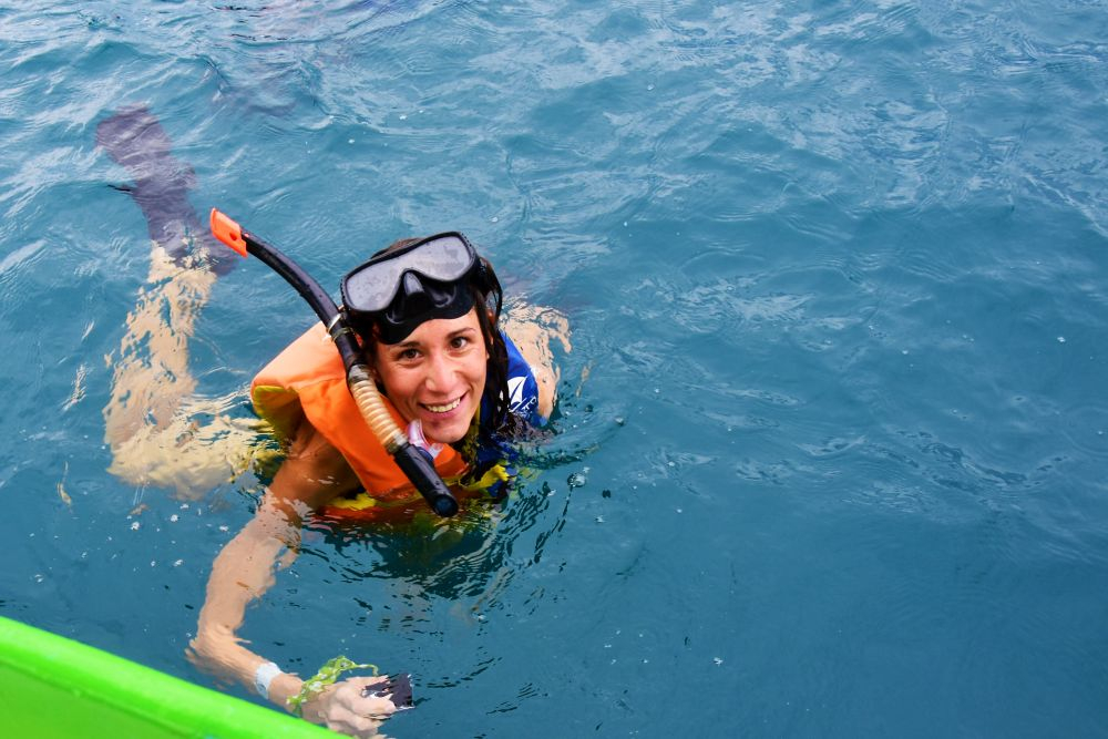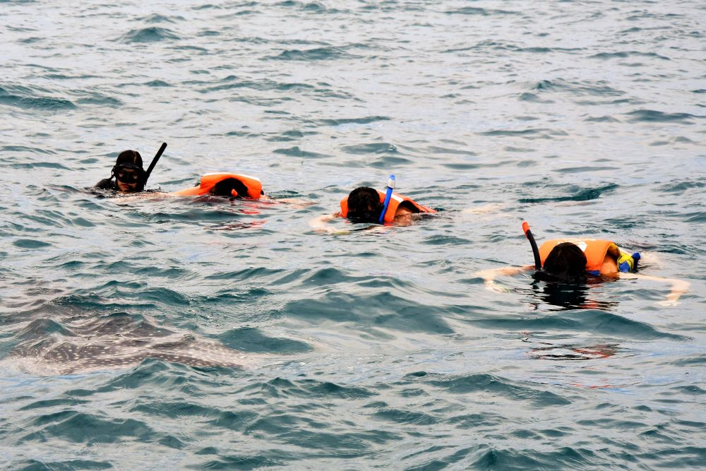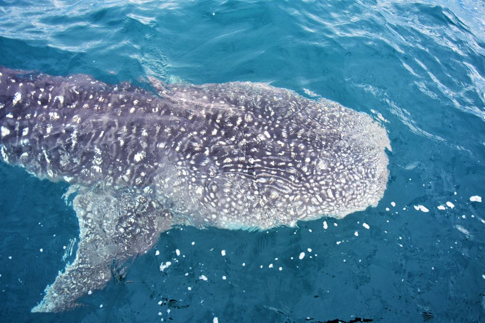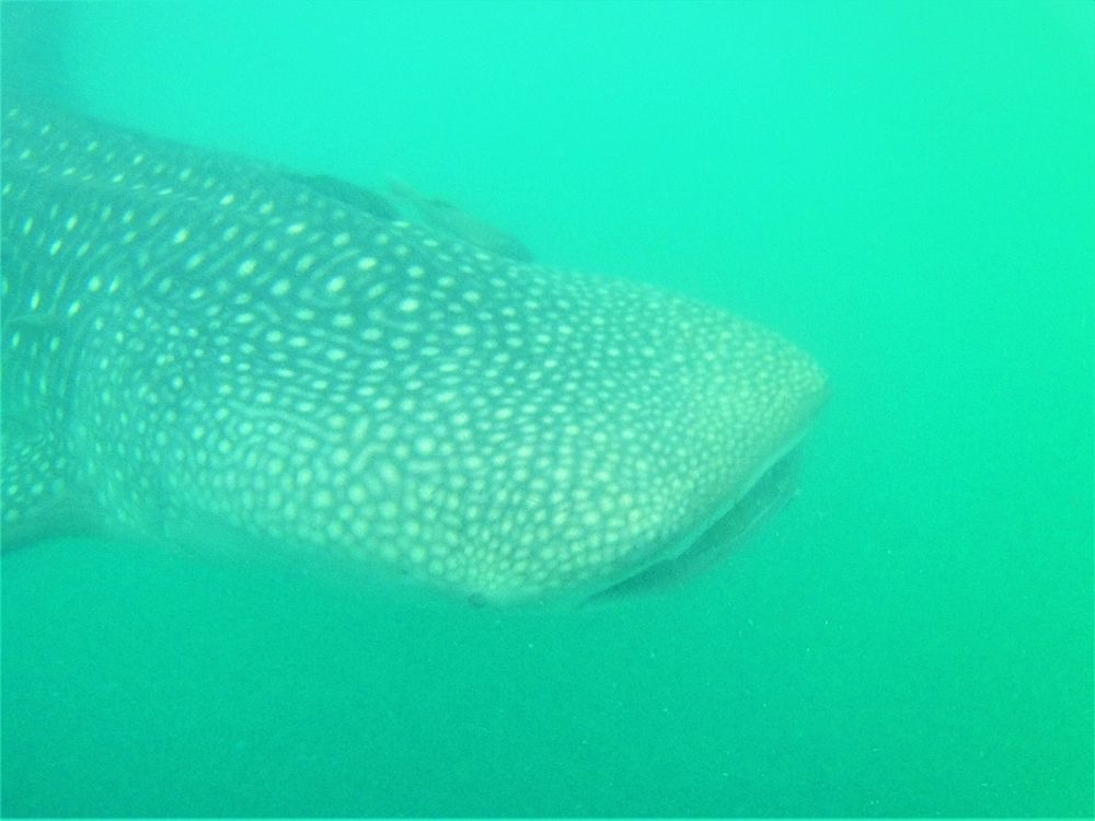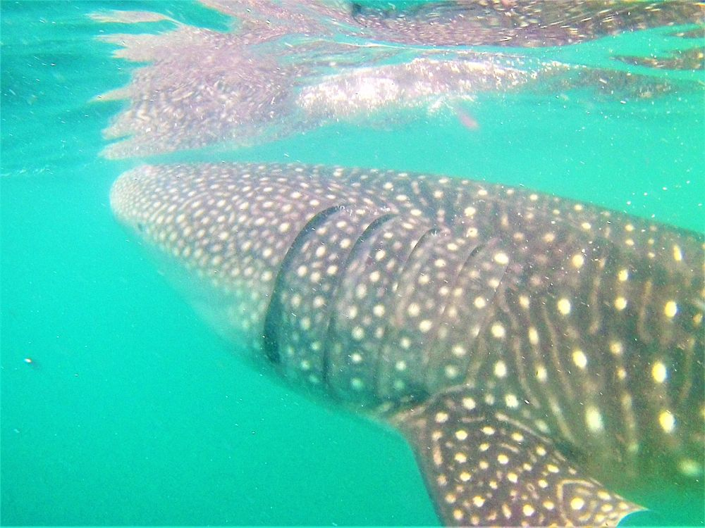 Unser Boot hielt also Ausschau und es dauerte auch nicht lange bis wir das erste Tier entdeckten. Insgesamt waren es 7 Personen auf dem Boot. Unser Guide erklärte, dass zum Schutz der Tiere immer nur 3 Personen maximal gleichzeitig ins Wasser dürfen. Der Gruppenzwang half Matthias dann auch sich ins Wasser zu wagen. Stephanie sprang ganze vier Mal vom Boot. Für uns beide war es ein unvergessliches Erlebnis mit den 6-7 Meter langen Wasserriesen zu schwimmen. Wir werden es sicherlichen nicht vergessen und wollen an dieser Stelle lieber unsere Bilder sprechen lassen. Gefährlich ist das Ganze übrigens nicht, denn die Walhaie sind Gott sei Dank Vegetarier. Allerdings sollte man aufpassen, dass man nicht mit den Tieren zusammenstößt und immer einen gewissen Abstand – vor allem zu den Flossen – einhalten. Das ist teilweise gar nicht so einfach und man muss manchmal ganz schön zurückrudern, damit man ihnen nicht doch etwas zu nah kommt. Für Nichtschwimmer eher ungeeignet.