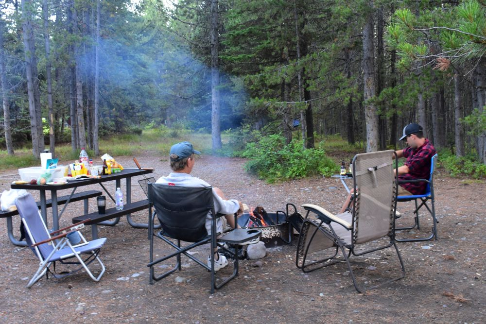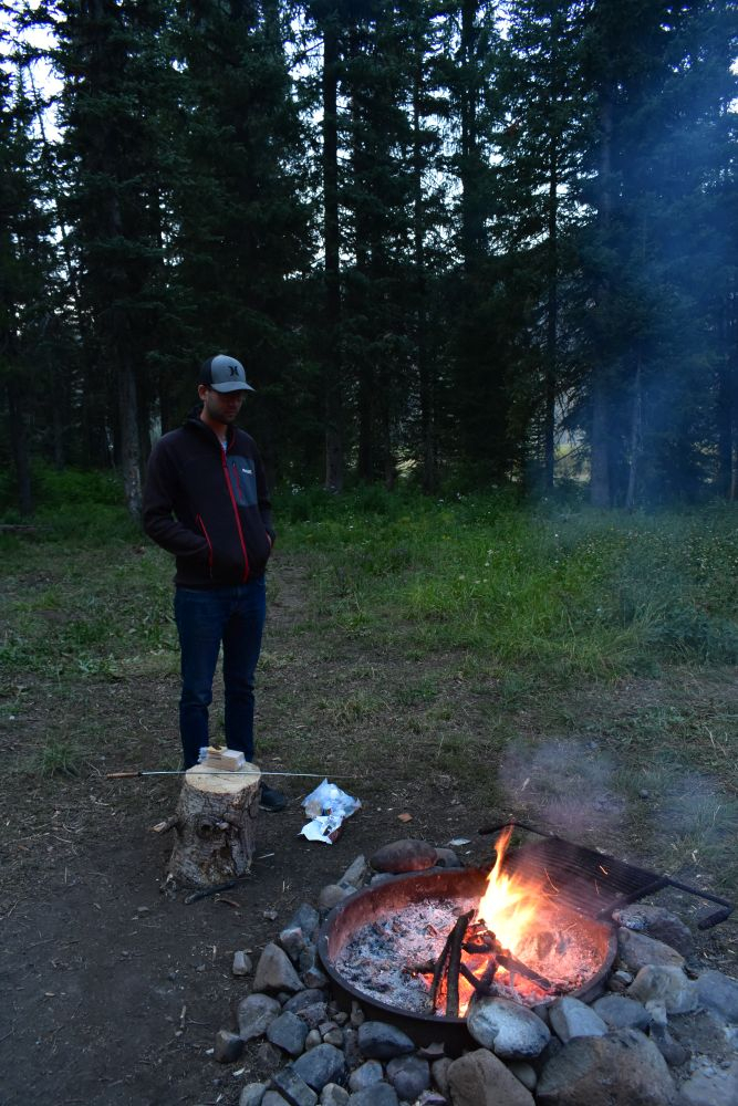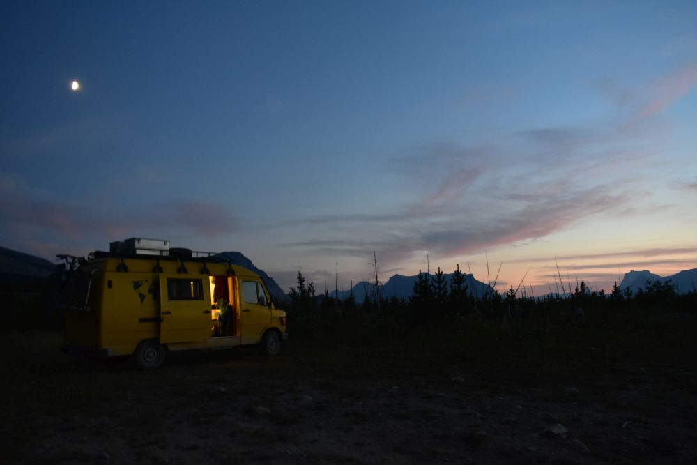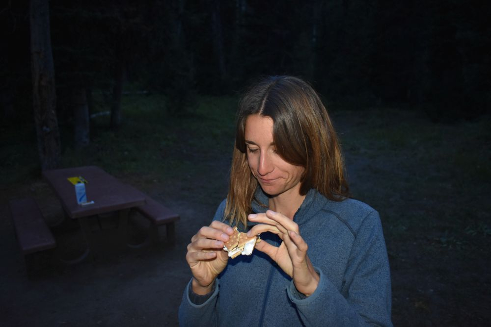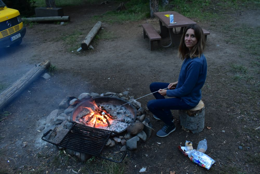 Am Abend unseres Abschiedes waren wir dann irgendwie ganz komisch drauf. Natürlich freuten wir uns auf die letzten Wochen unserer Reise, dennoch sind solche Abschiede immer mit einem faden Beigeschmack behaftet. Die Stellplatzsuche gestaltete sich dann der Stimmung entsprechend – wir fanden schlichtweg keinen. Erst nach etlichen Kilometern entlang der Grassy Lake Road tat sich ein geeigneter (und vor allem freier!) Stellplatz auf. Der war aber dafür wieder mal bombastisch, mit eigener Feuerstelle, Toilette und Campinggarnitur. Wir verbrachten dann die restlichen Stunden noch mit Feuerholz sammeln, gemütlich Kochen und der neuen Nachspeise über offenem Feuer – S´mores. Für alle die neu sind, S´mores sind zwei Cracker, in der Mitte ein gerösteter Marshmallow und ein Stück Zartbitterschokolade. Schmeckt tatsächlich sehr lecker und ist ein toller Gag bei jeder Lagerfeuer-Session 😉