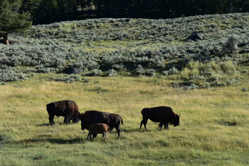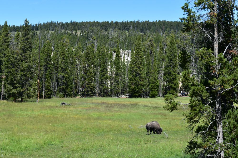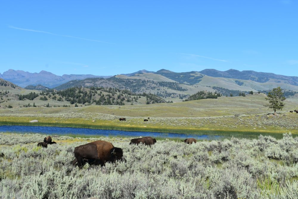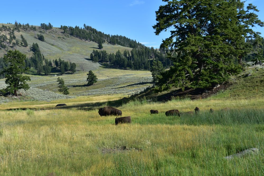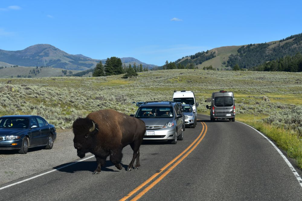 Die Landschaft wechselte nun etwas und es wurde immer karger. Fast schon wie eine Steppe. Das Wetter war wieder einmal grandios und wir genossen jeden Kilometer den wir auf der schönen „Grand Loop Road“ zurücklegten. Und dann plötzlich – Bisons! Das Highlight an diesem Tag. Zunächst war es nur einer der sich im Dreck wälzte, doch dann… immer mehr und mehr. Bis wir sogar mitten drin standen 😀 Aussteigen sollte man besser nicht, die Bisons sind mindestens so tödlich wie Bären. Die Herden hielten sich überwiegend entland der „Northeast Entrance Road“ (US212) auf. Hier hat man wahrscheinlich die besten Chancen Bisons zu sehen.