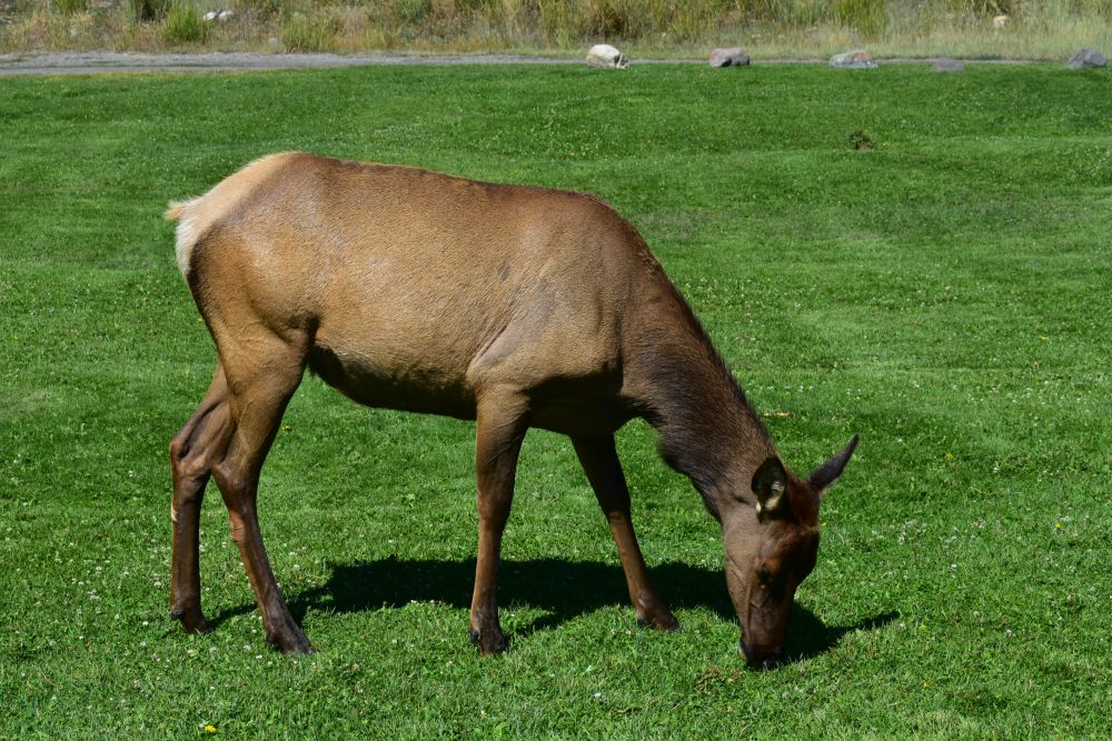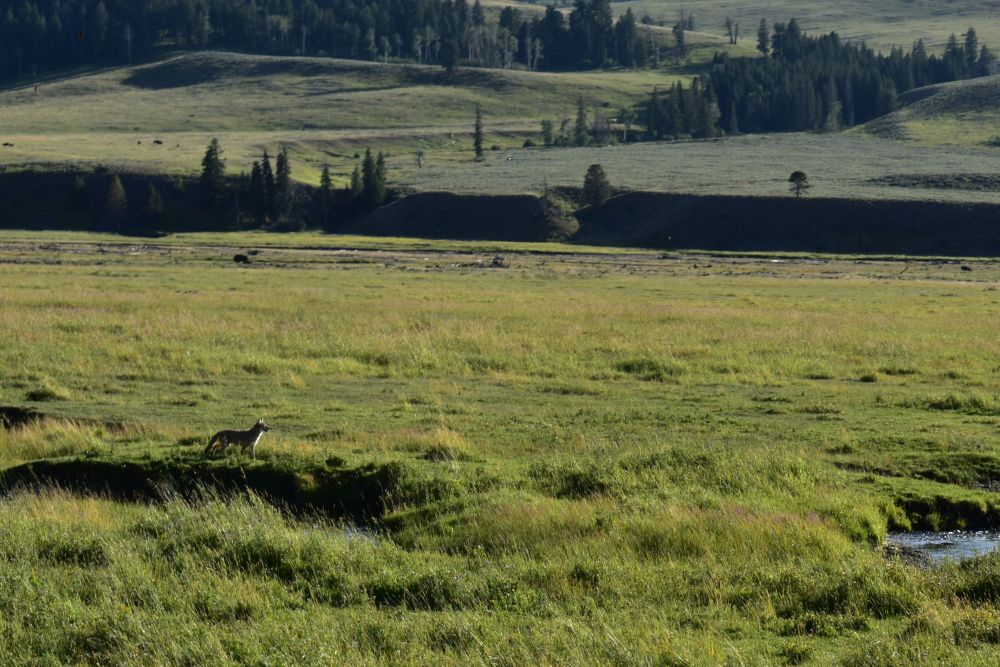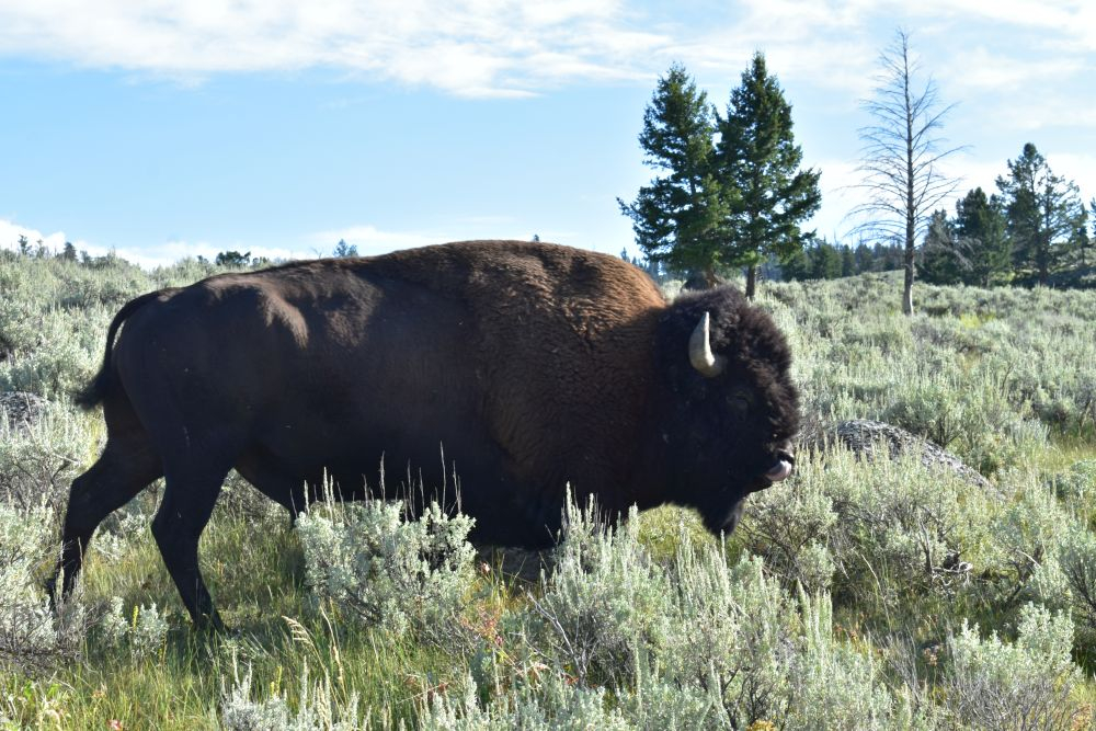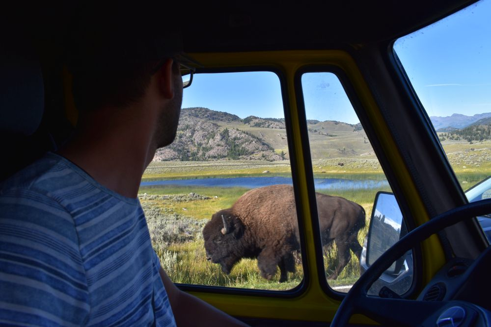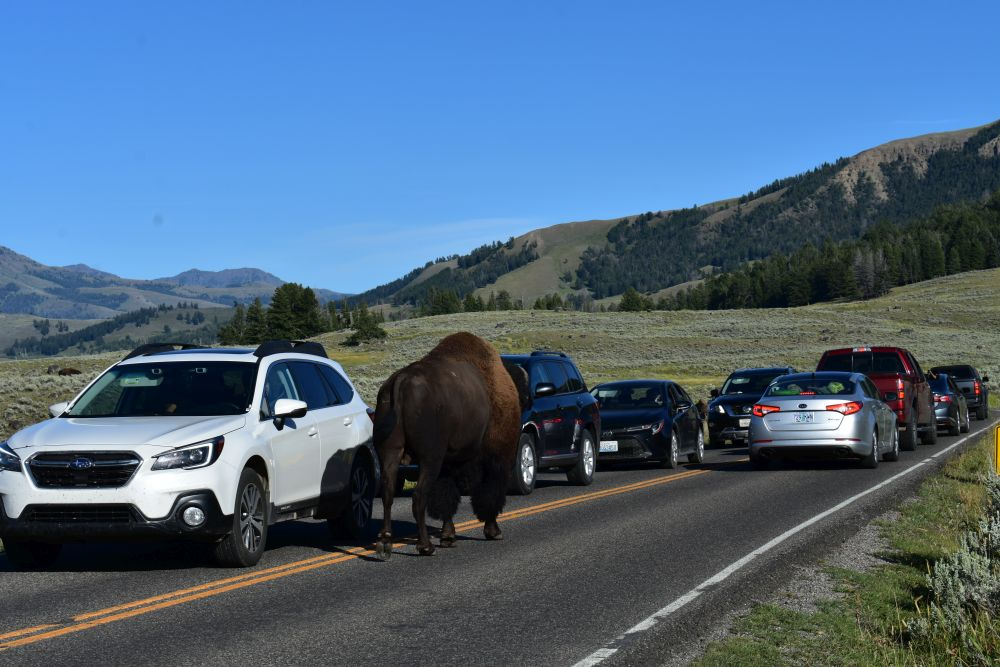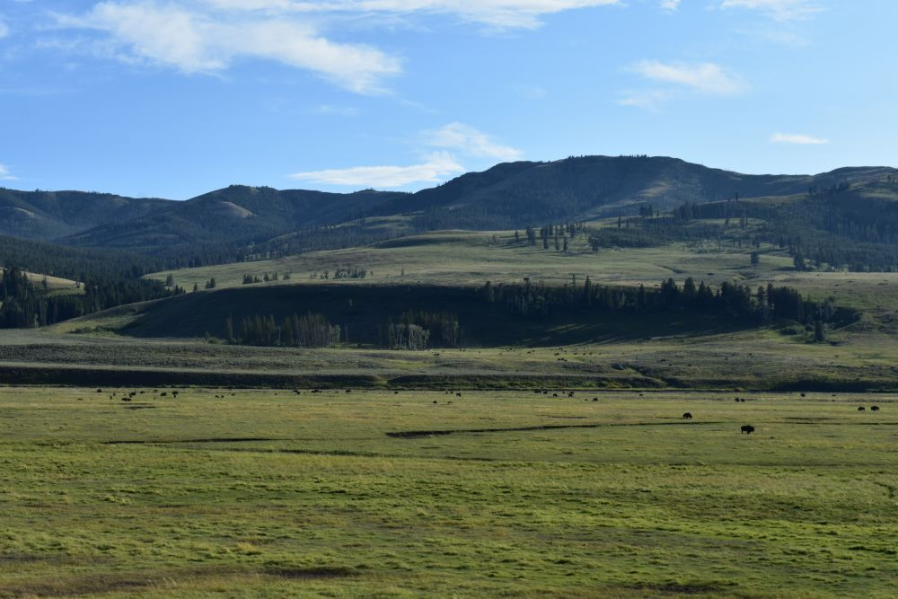 Die Landschaft wechselte nun etwas und es wurde immer karger. Fast schon wie eine Steppe. Das Wetter war wieder einmal grandios und wir genossen jeden Kilometer den wir auf der schönen „Grand Loop Road“ zurücklegten. Und dann plötzlich – Bisons! Das Highlight an diesem Tag. Zunächst war es nur einer der sich im Dreck wälzte, doch dann… immer mehr und mehr. Bis wir sogar mitten drin standen 😀 Aussteigen sollte man besser nicht, die Bisons sind mindestens so tödlich wie Bären. Die Herden hielten sich überwiegend entland der „Northeast Entrance Road“ (US212) auf. Hier hat man wahrscheinlich die besten Chancen Bisons zu sehen.