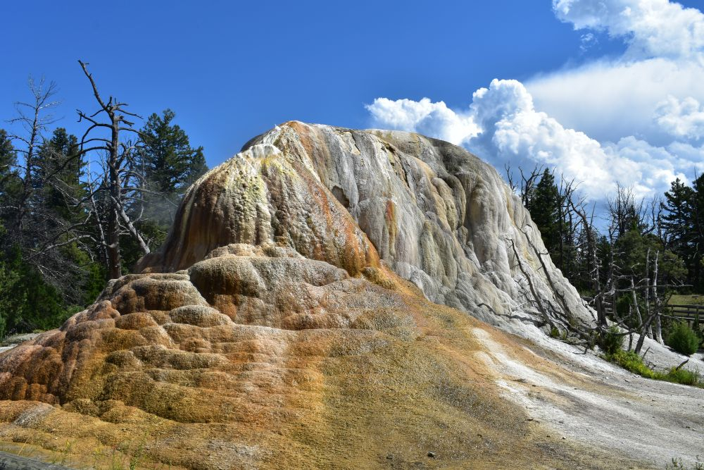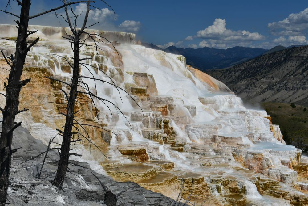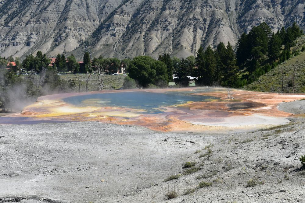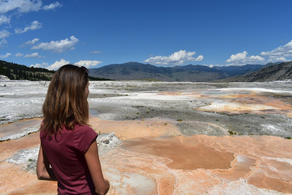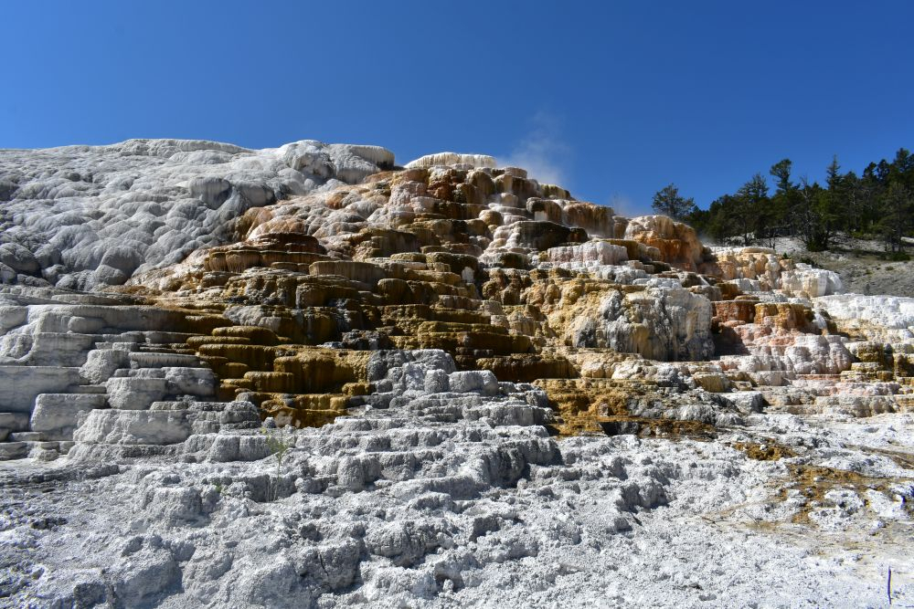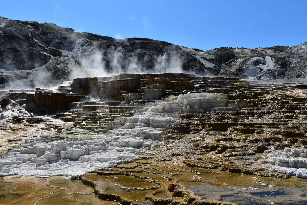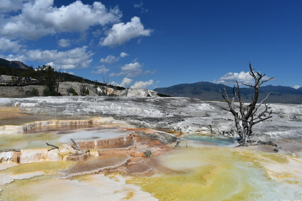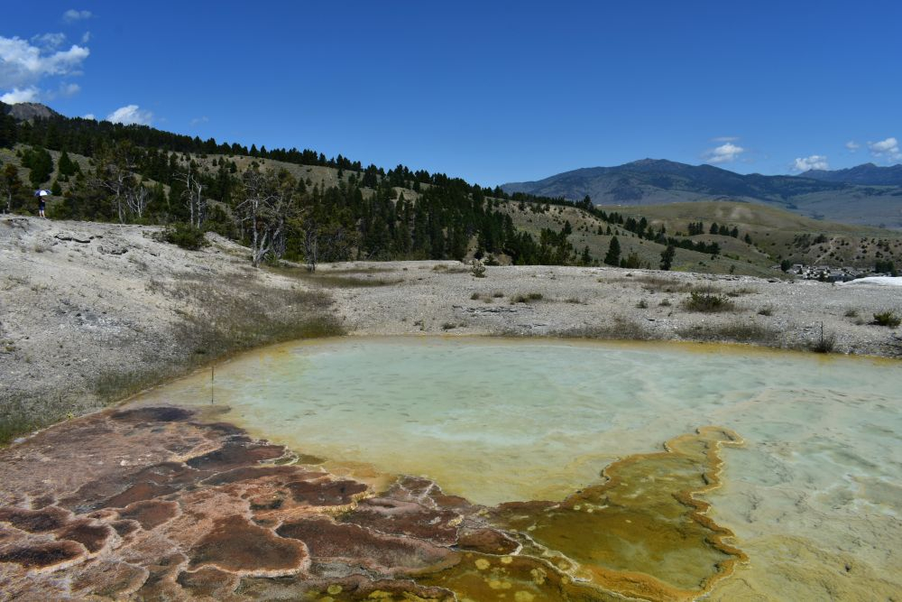 Von dort aus hatten wir dann auch schon einen ersten Blick auf die heißen Quellen. Das ca. 70 °C heiße Wasser hat einen sehr hohen Kalk- und Mineralienanteil, die sich über die Jahrhunderte hinweg in Form von Terrassen ablagerten. Je nach Bakterien und Algen, die im Wasser enthalten sind, ergeben sich zudem unterschiedliche Farben. Wir sind total begeistert von dem Anblick und gehen staunend den Rundweg entlang. Aufgrund unserer langen Anfahrt am ersten Tag sind wir erst am späten Vormittag angekommen, daher ist schon recht viel los. Für diejenigen, die einen Besuch planen: (sehr) früh aufstehen lohnt sich, denn Yellowstone zählt zu den fünf Nationalparks in den USA mit den höchsten Besucherzahlen.