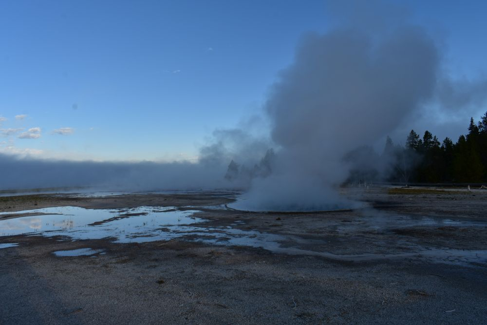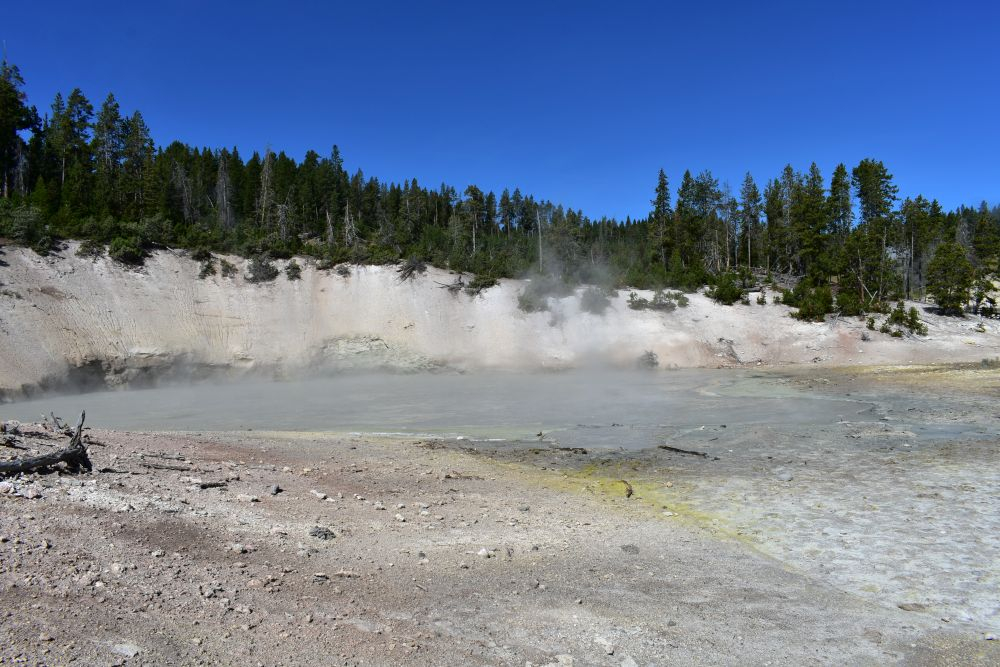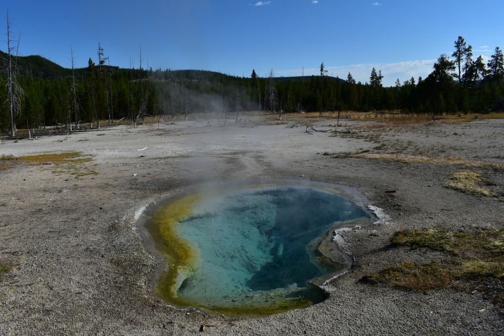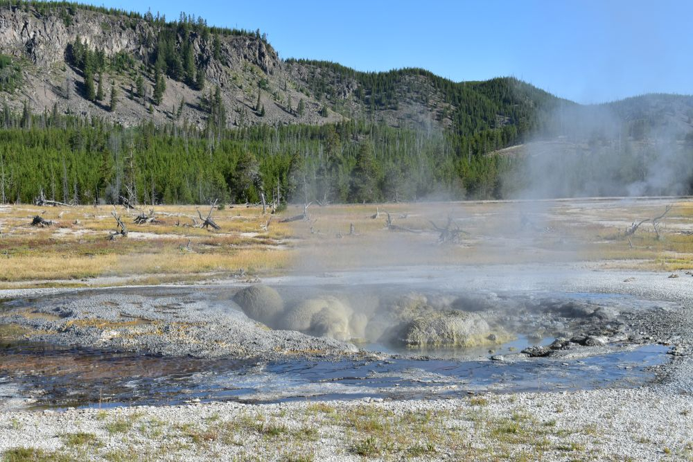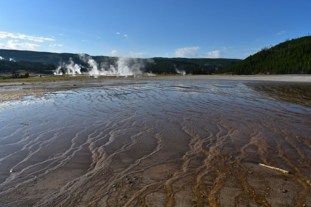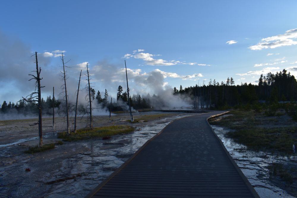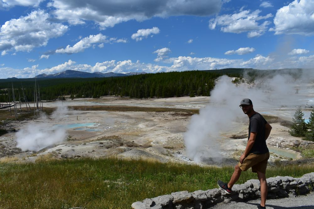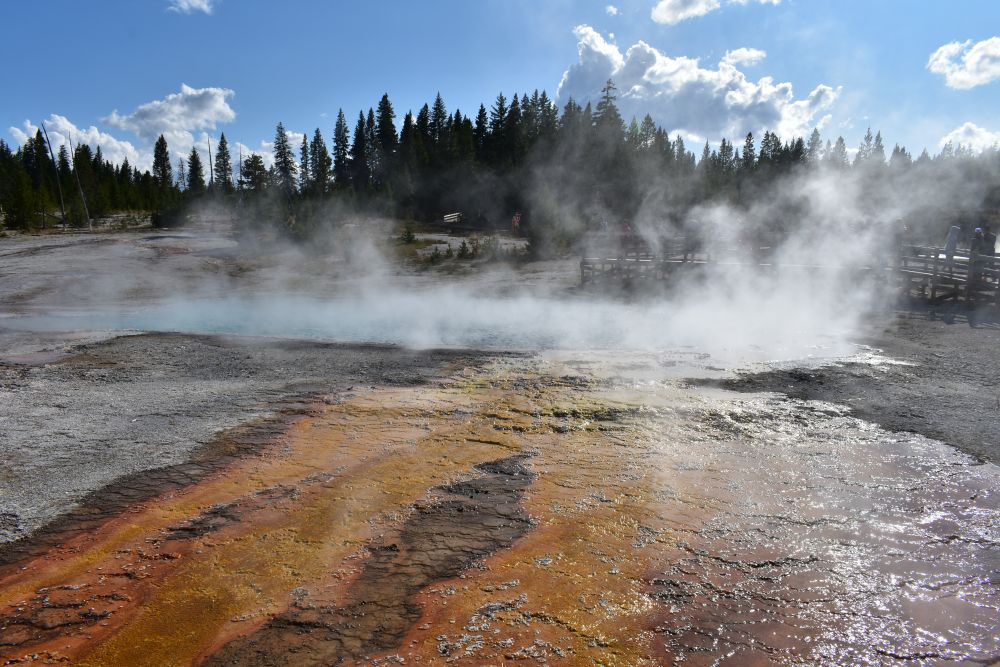 Vorbei an Flüssen, dem Obsidian Cliff und vielem mehr, legten wir unseren nächsten Stopp am Norris-Geysirbecken ein. Dieses Gebiet zählt zu den ältesten und heißesten hydrothermalen Quellen. Der Bereich befindet sich in einem ständigen Wandel und man kann hier den größten aktiven Geysir weltweit (Steamboat Geyser: bei einem Ausbruch erreicht er eine Höhe von bis zu 120 Metern) bewundern. Wir gehen entlang der angelegten Holzstege und überall um uns herum sprudelte, dampfte und zischte es und immer wieder hat man den Geruch von faulen Eiern in der Nase.