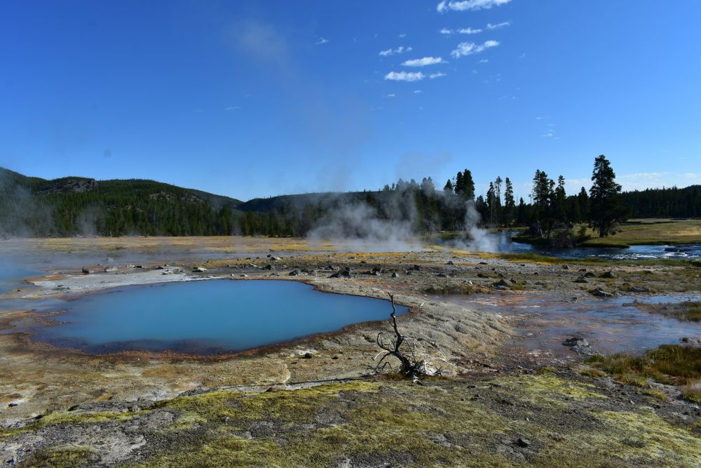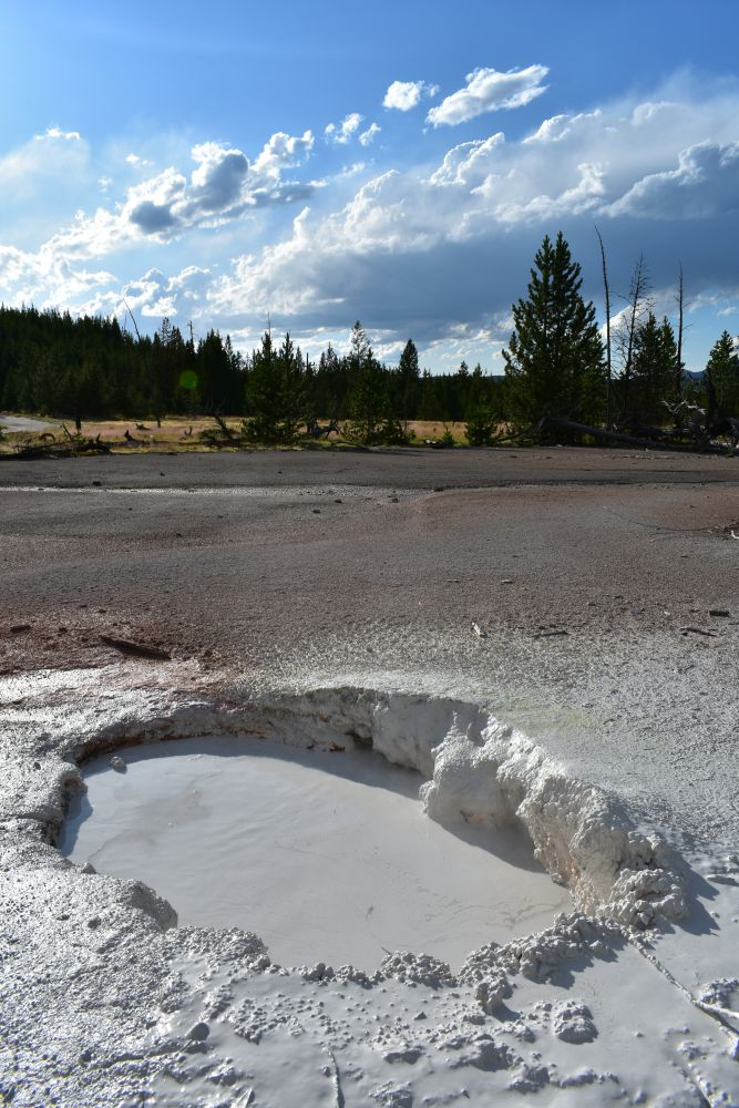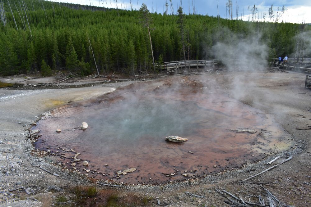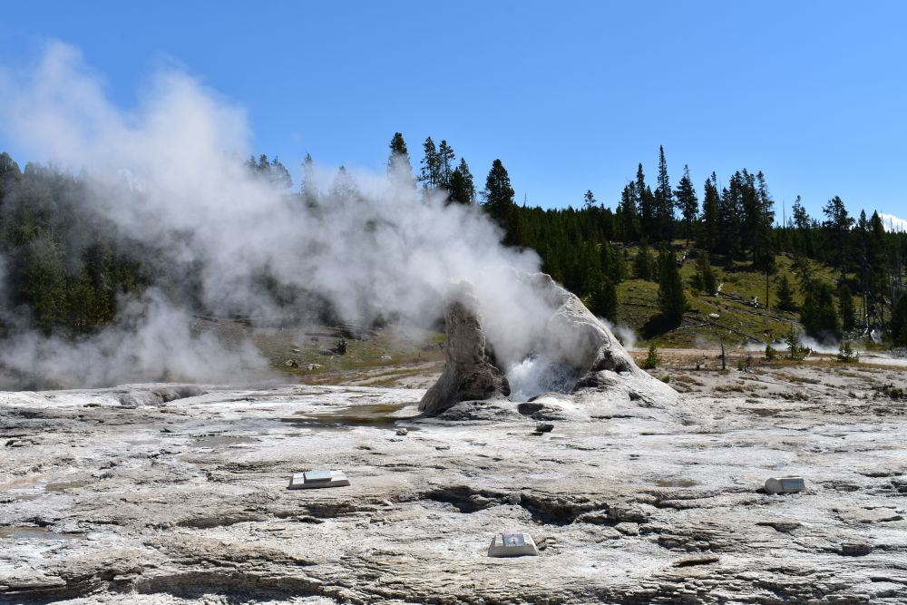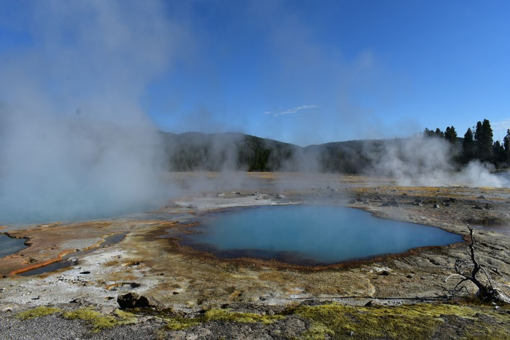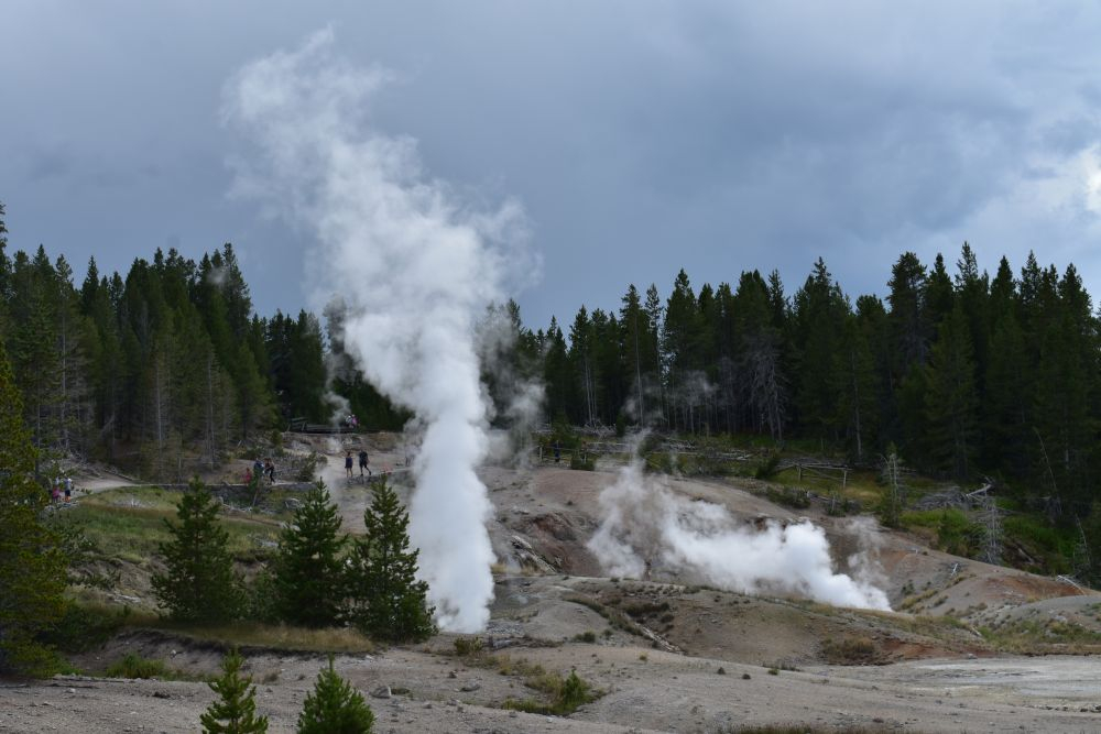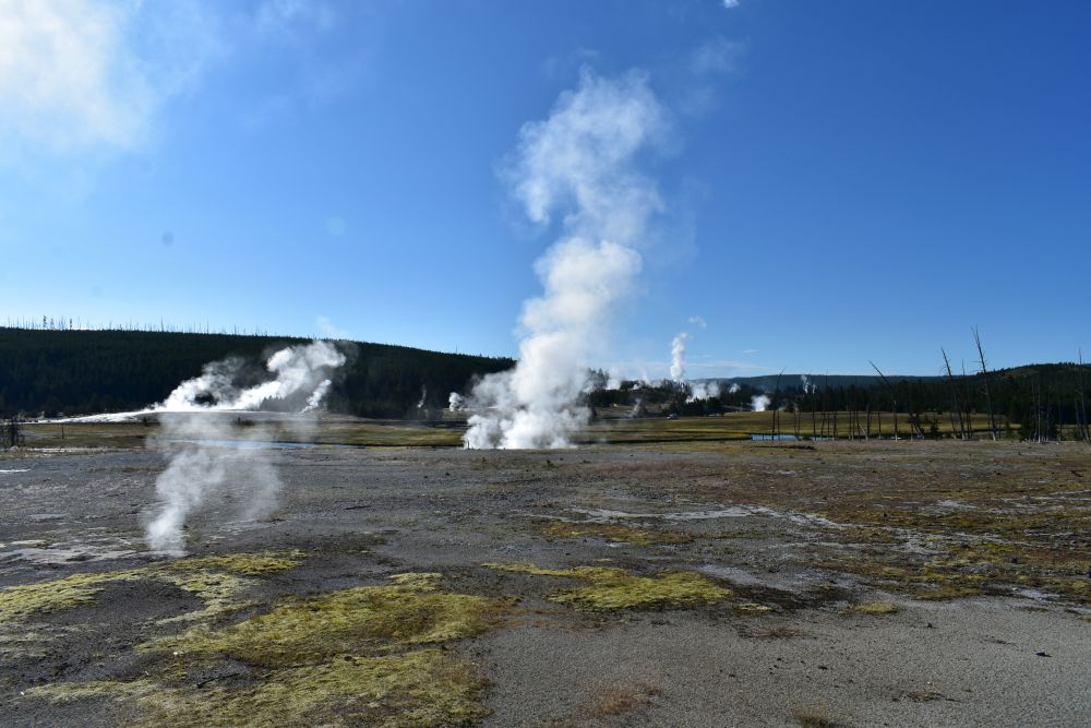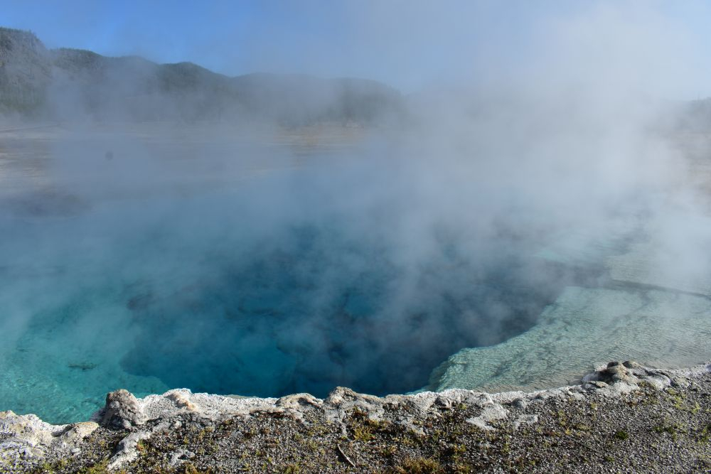 Vorbei an Flüssen, dem Obsidian Cliff und vielem mehr, legten wir unseren nächsten Stopp am Norris-Geysirbecken ein. Dieses Gebiet zählt zu den ältesten und heißesten hydrothermalen Quellen. Der Bereich befindet sich in einem ständigen Wandel und man kann hier den größten aktiven Geysir weltweit (Steamboat Geyser: bei einem Ausbruch erreicht er eine Höhe von bis zu 120 Metern) bewundern. Wir gehen entlang der angelegten Holzstege und überall um uns herum sprudelte, dampfte und zischte es und immer wieder hat man den Geruch von faulen Eiern in der Nase.