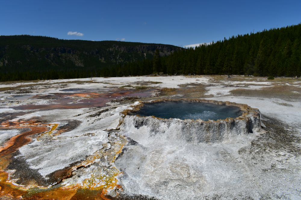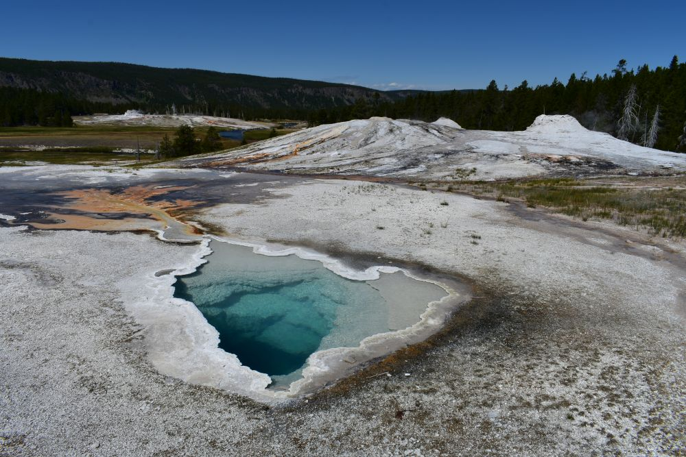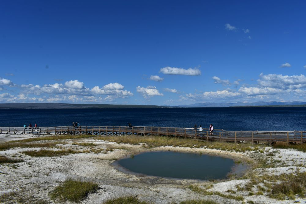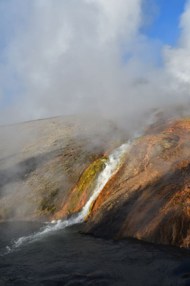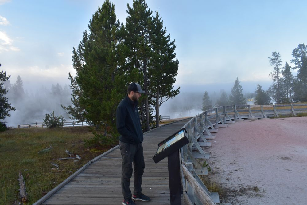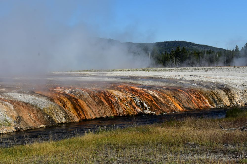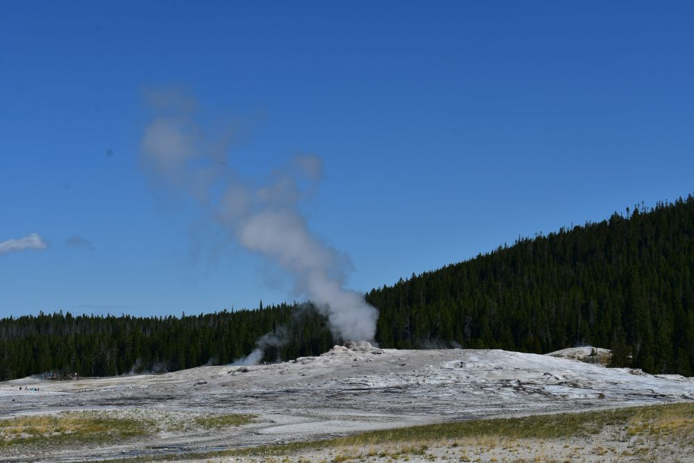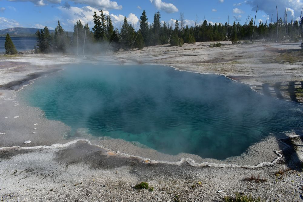 Vorbei an Flüssen, dem Obsidian Cliff und vielem mehr, legten wir unseren nächsten Stopp am Norris-Geysirbecken ein. Dieses Gebiet zählt zu den ältesten und heißesten hydrothermalen Quellen. Der Bereich befindet sich in einem ständigen Wandel und man kann hier den größten aktiven Geysir weltweit (Steamboat Geyser: bei einem Ausbruch erreicht er eine Höhe von bis zu 120 Metern) bewundern. Wir gehen entlang der angelegten Holzstege und überall um uns herum sprudelte, dampfte und zischte es und immer wieder hat man den Geruch von faulen Eiern in der Nase.