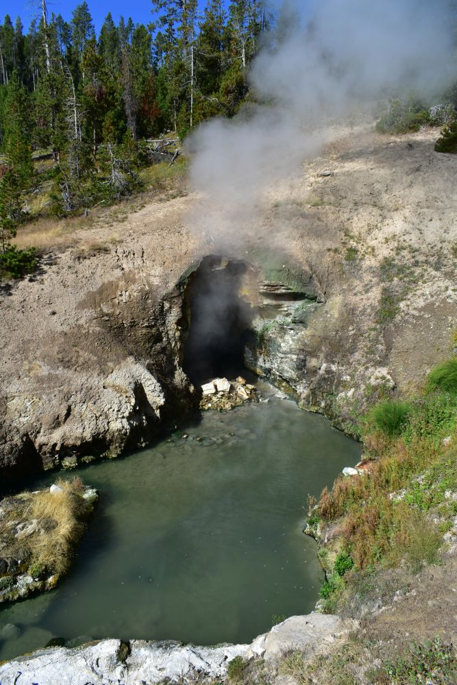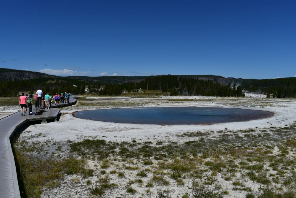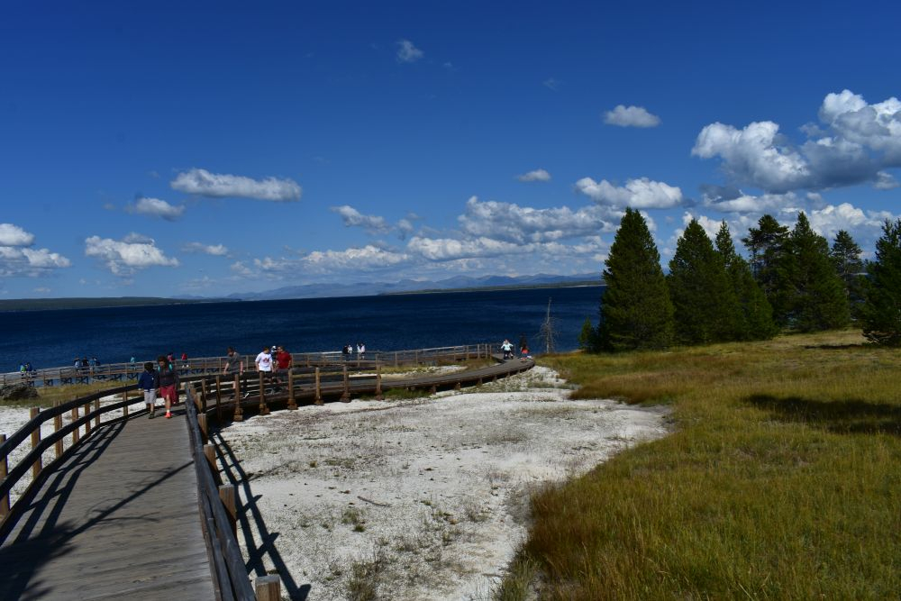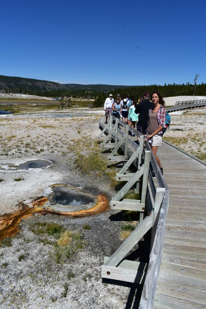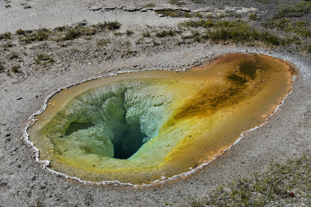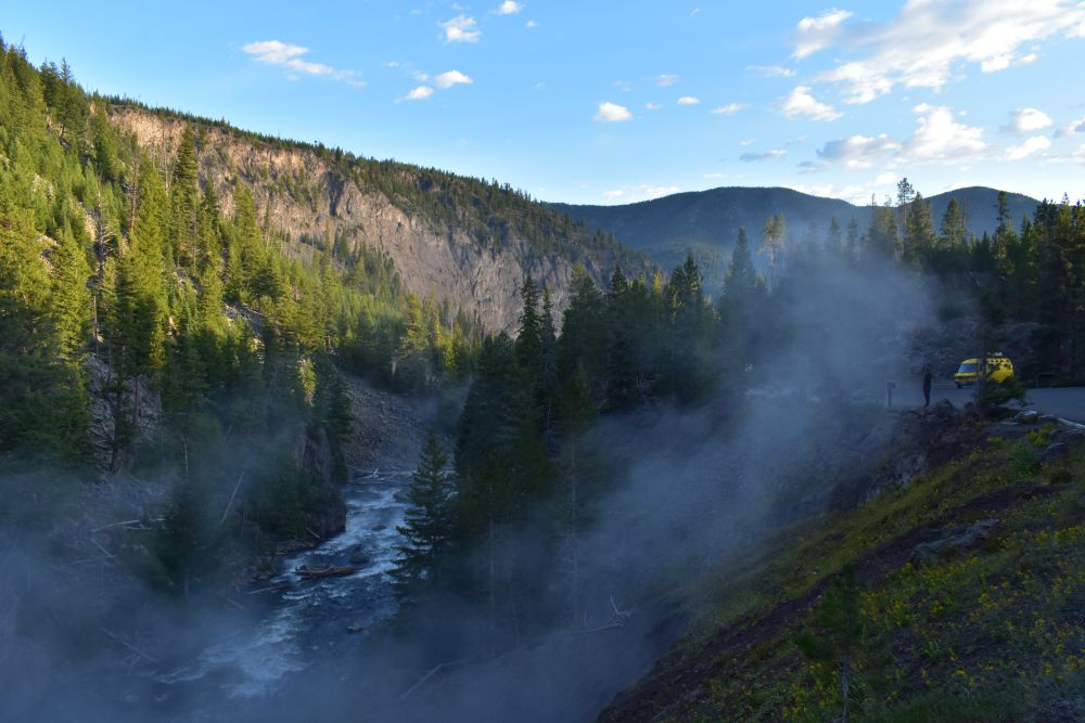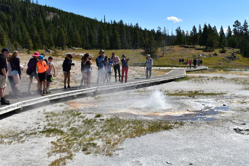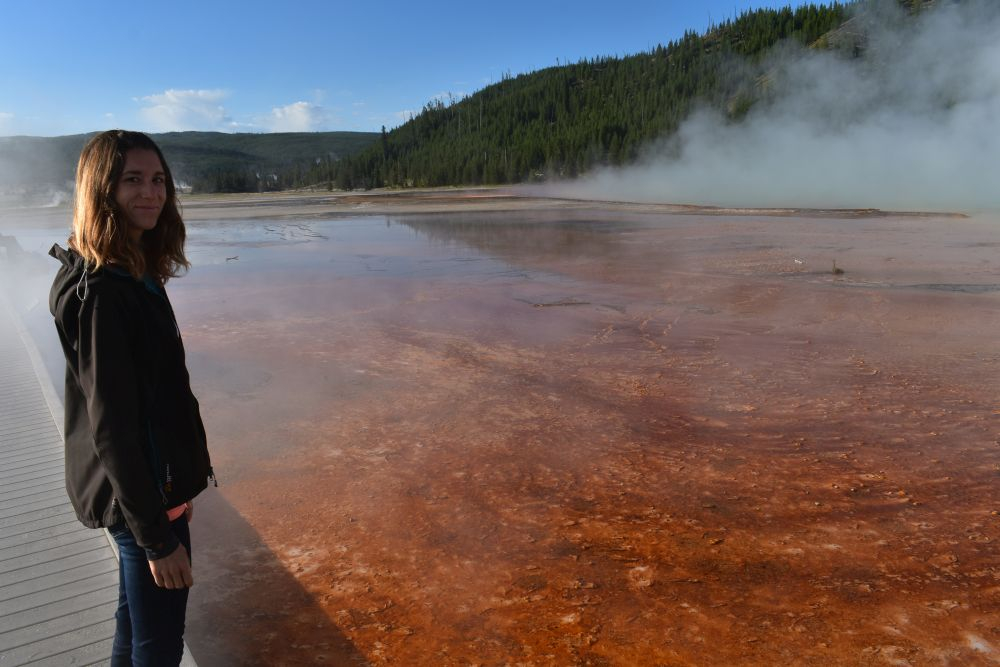 Vorbei an Flüssen, dem Obsidian Cliff und vielem mehr, legten wir unseren nächsten Stopp am Norris-Geysirbecken ein. Dieses Gebiet zählt zu den ältesten und heißesten hydrothermalen Quellen. Der Bereich befindet sich in einem ständigen Wandel und man kann hier den größten aktiven Geysir weltweit (Steamboat Geyser: bei einem Ausbruch erreicht er eine Höhe von bis zu 120 Metern) bewundern. Wir gehen entlang der angelegten Holzstege und überall um uns herum sprudelte, dampfte und zischte es und immer wieder hat man den Geruch von faulen Eiern in der Nase.