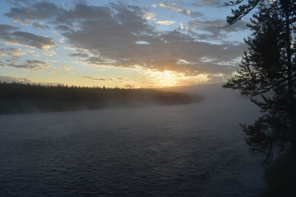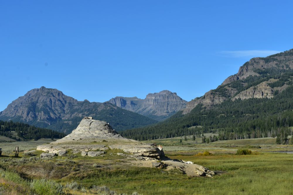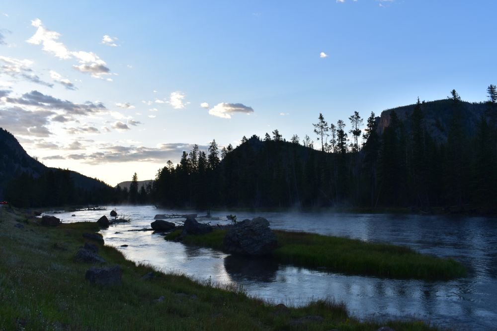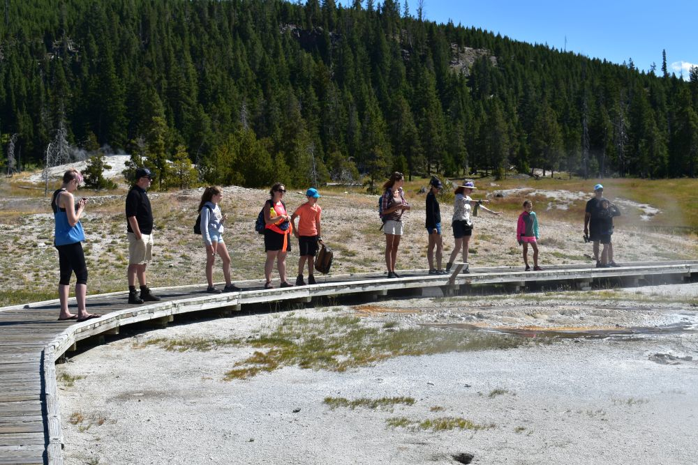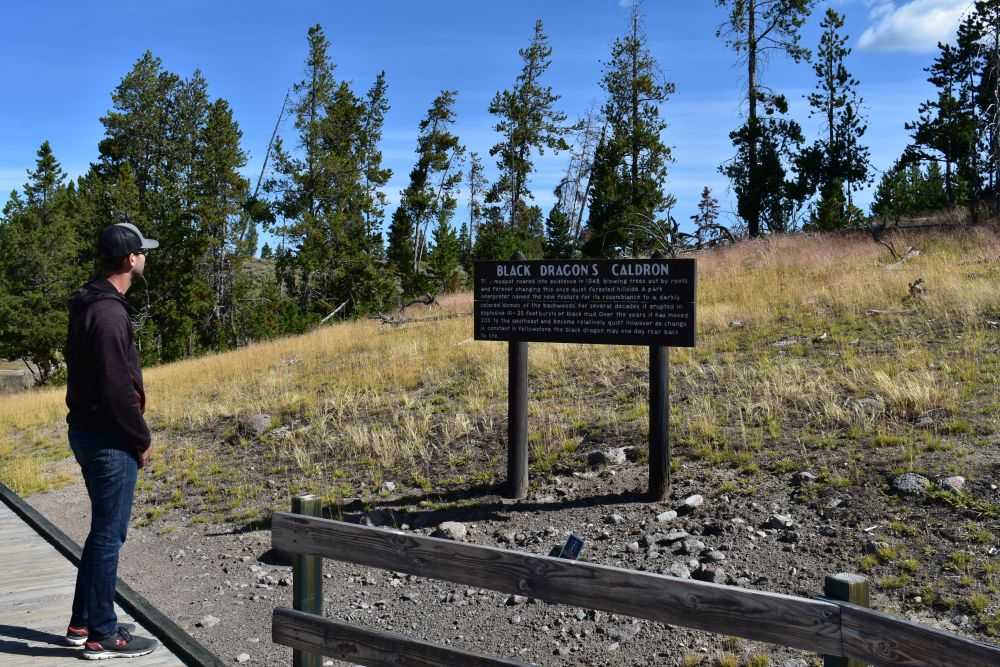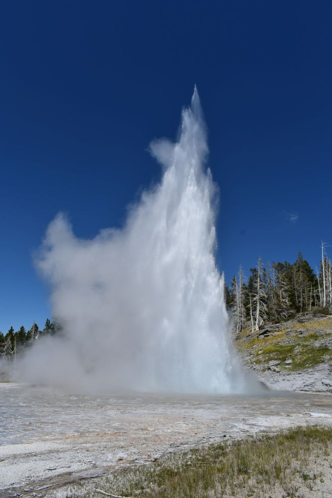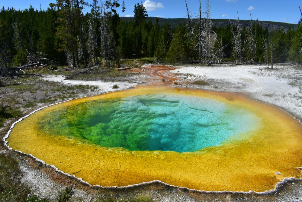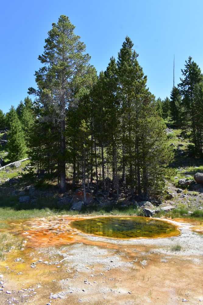 Vorbei an Flüssen, dem Obsidian Cliff und vielem mehr, legten wir unseren nächsten Stopp am Norris-Geysirbecken ein. Dieses Gebiet zählt zu den ältesten und heißesten hydrothermalen Quellen. Der Bereich befindet sich in einem ständigen Wandel und man kann hier den größten aktiven Geysir weltweit (Steamboat Geyser: bei einem Ausbruch erreicht er eine Höhe von bis zu 120 Metern) bewundern. Wir gehen entlang der angelegten Holzstege und überall um uns herum sprudelte, dampfte und zischte es und immer wieder hat man den Geruch von faulen Eiern in der Nase.