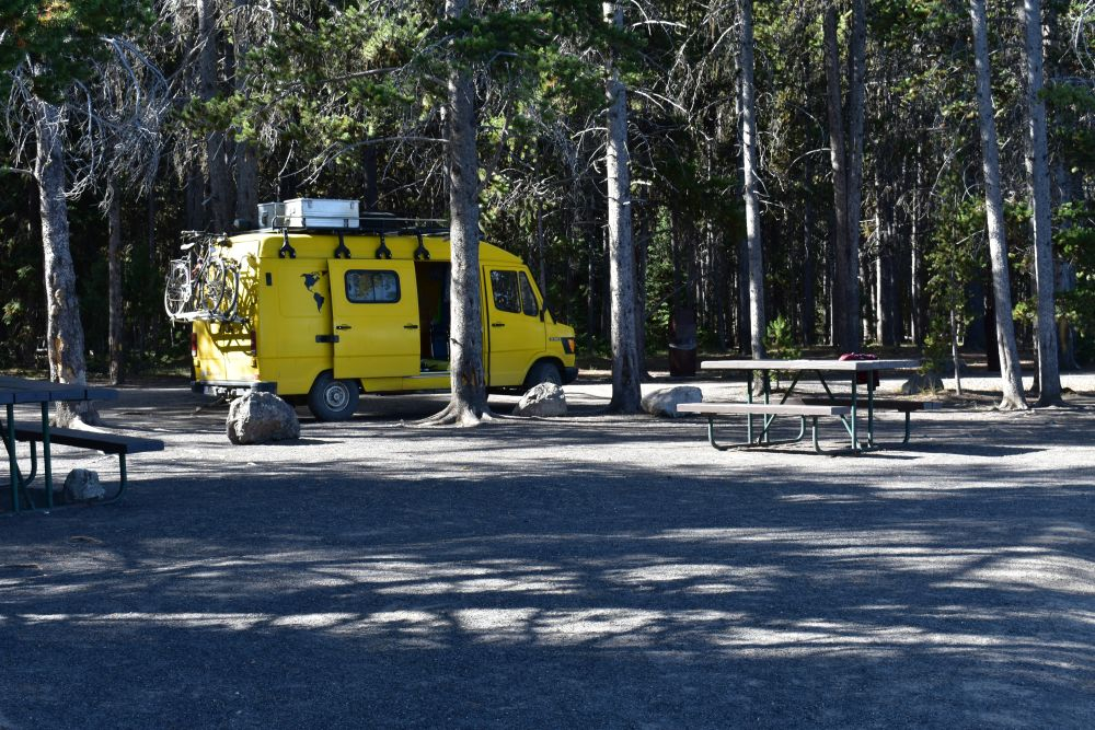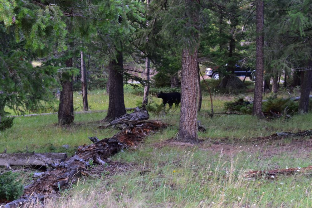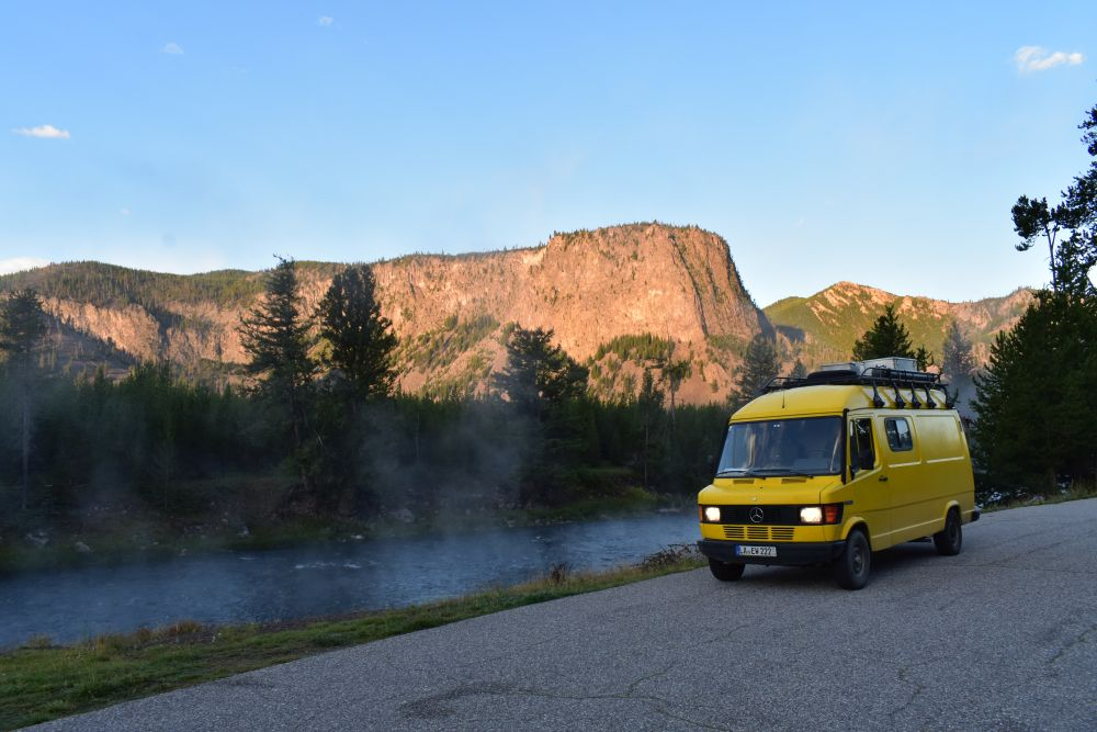 Wir fuhren also Richtung Ausgang, da kam plötzlich der gesamte Verkehr zum Erliegen. Wir dachten erst an eine Baustelle (Baustellen findet man immer irgendwo im Park und man muss zum Teil mit längeren Wartezeiten rechnen, da Bauarbeiten nur in den Sommermonaten durchgeführt werden können). Als dann aber so gar nichts vorwärtsgehen wollten war unser nächster Gedanke: ein Unfall. Wir wissen nicht mehr wie lange wir in dem Stau gestanden sind, bis wir endlich die Ursache für das Verkehrschaos entdeckten: ein Bär am Straßenrand!!!! Das hatten wir bisher wirklich noch nie erlebt… wir wussten zwar, dass man vielleicht mal kurz warten muss bis sich eine Büffelherde über die Straße bewegt hat, aber dass wegen einem Bär der ganz Verkehr still steht, das war uns neu. Rick klärte uns im Nachhinein auf, dass sowas in Yellowstone ganz normal sei und die Locals schon ein Wort dafür haben: Bear-Jam! Bis wir dann bei unserem Nachtlager waren, waren wir für nichts mehr zu gebrauchen… schnell noch was zu essen zaubern und dann ab ins Bett, der Wecker sollte schon früh am nächsten Tag läuten.