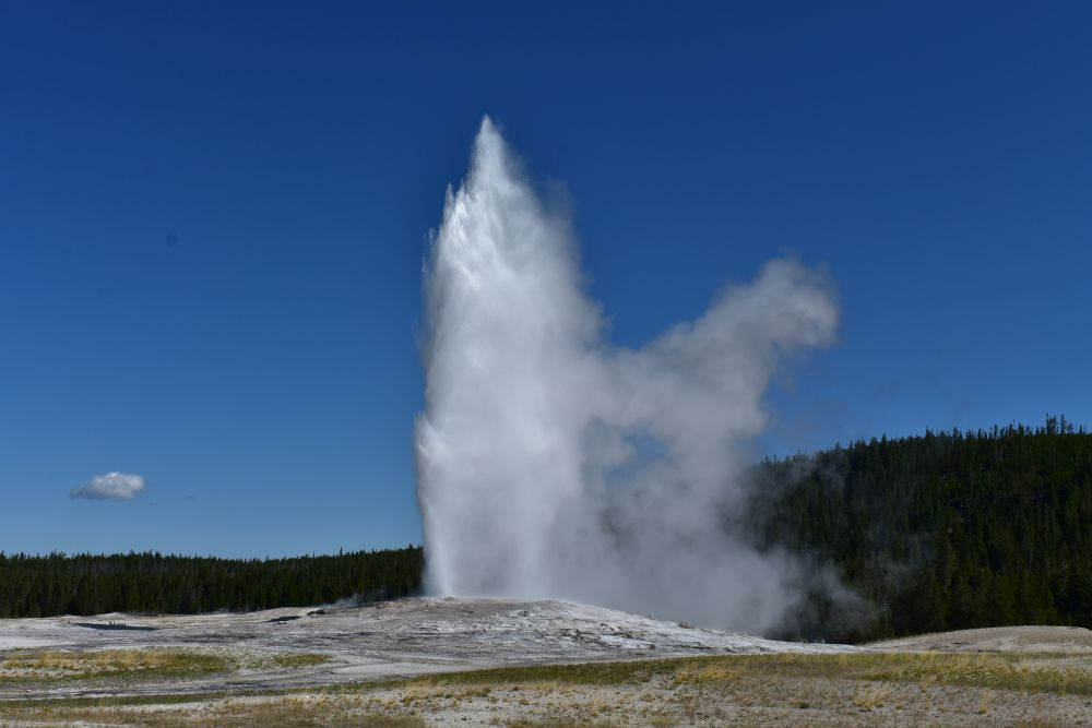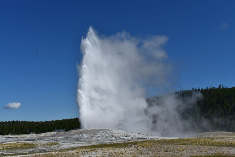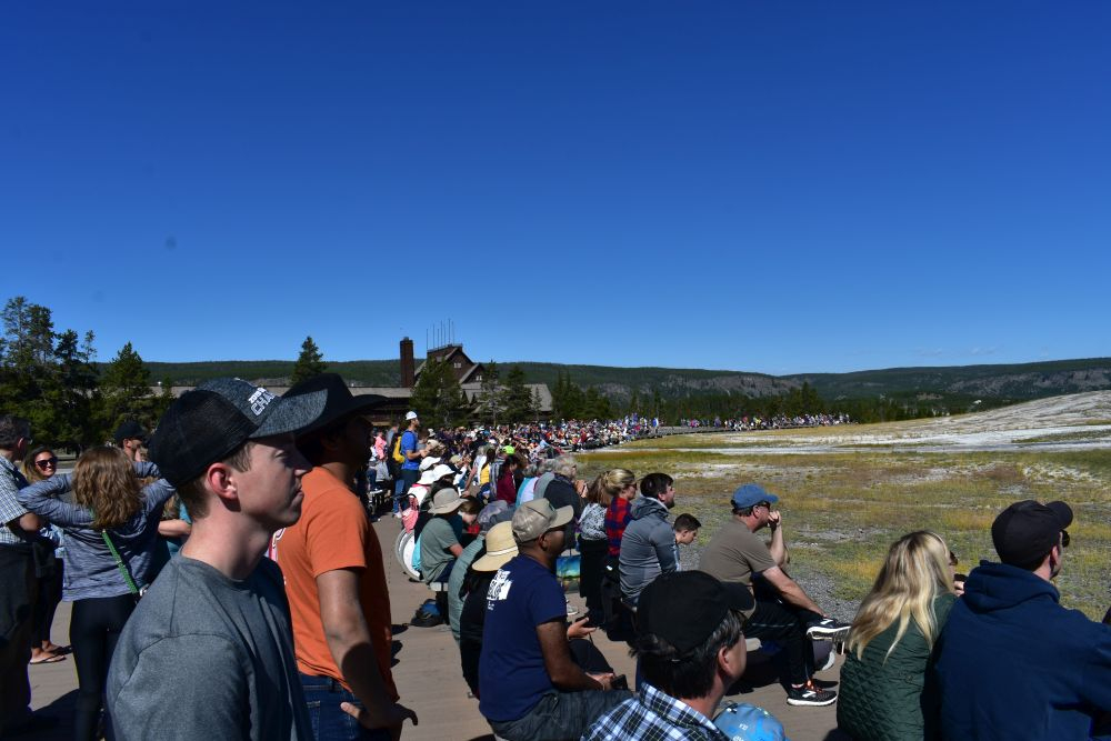 Es war ein schöner sonniger Tag und wir konnten die Zeit in den Geysirfeldern sehr genießen. Am späten Vormittag waren wir dann beim Highlight des Tages angekommen. Dem Old Faithful Geyser. Die Attraktion ist so groß und berühmt, dass hier ein eigenes Visitor Center gebaut wurde. Zudem gibt es mehrere Lodges, Ranger Stations und Verpflegungsmöglichkeiten. Wir schlenderten zunächst noch etwas in der Anlage umher, da zum nächsten voraussichtlichen Ausbruch noch etwas hin war. Der Ausbruch des Old Faithful Geysir ist interessanterweise sehr genau vorhersehbar. An dem Visitor Center hängt eine Karte aus, wann der letzte Ausbruch war und der nächste sein wird. Das stimmt in der Regel auf wenige Minuten genau. Für 11:20 Uhr war der nächste Termin angesagt. Wir waren schon gute 10 Minuten eher dort und hatten Mühe, noch einen guten Platz zu bekommen. Die „erste Reihe“ war zwar schon belegt… doch Gott sei Dank sind wir so groß 😉 Um 11:25 Uhr begann dann das Schauspiel und man hörte überall die Leute staunen und Kameras klicken. Bis zu 50 Meter wird das Wasser aus dem Geysir geschleudert, etwa 2-3 Minuten lang. Dann dauert es wieder 90 Minuten bis sich genügend Wasser gesammelt hat und das Spektakel von vorne beginnt.