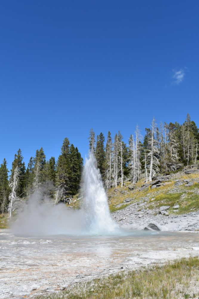 Teilweise konnten wir auch hier beeindruckende Geysir-Ausbrüche sehen. Diese sind aber im Gegensatz zum Old Faithful nie genau vorhersehbar und können Tage, Wochen oder sogar Monate auseinander liegen. Man muss also echt Glück haben. Auf den Fotos zu sehen ist der Ausbruch des West Triplet Geysirs.