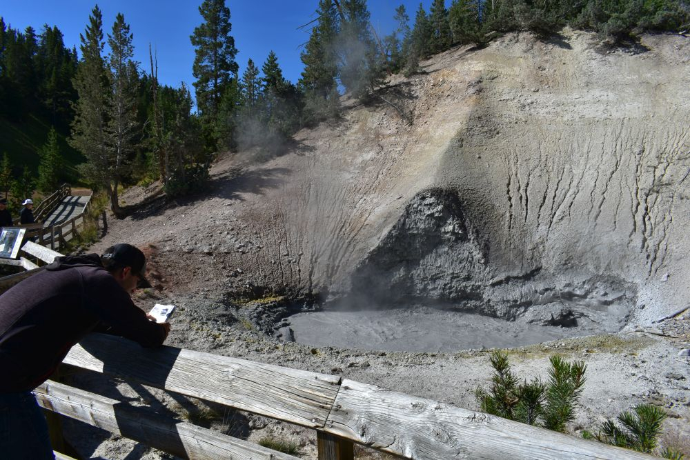 Dann ging es auch schon los – der dritte Tag im Yellowstone Nationalpark war angebochen und wir starteten gleich mal mit einem Geysirfeld nördlich des Yellowstone Lakes. Geysire waren dort eher weniger zu sehen, dafür aber kochende und stinkende Schlammlöcher, über deren Namen wir oft schmuzeln mussten. „Mud Volcano“, „Dragon´s Mouth Spring“ oder „Grizzly Fumarole“… echt komisch 😀