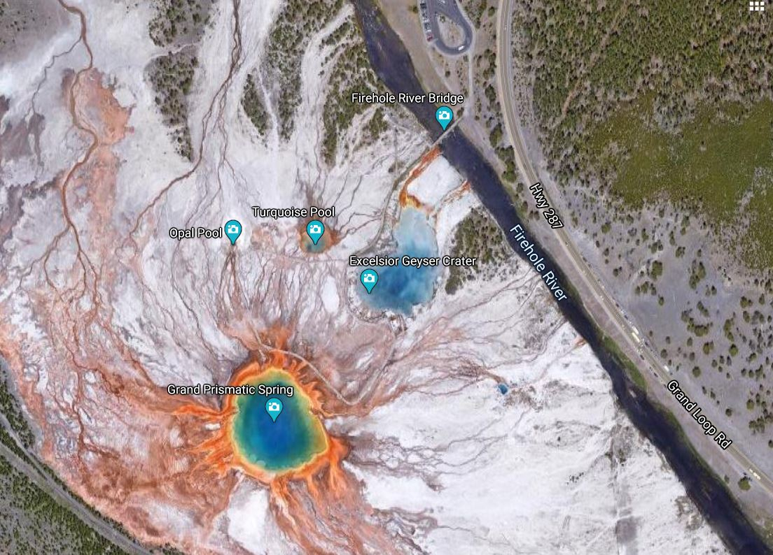 Schon früh am Morgen machten wir uns auf den Weg zu den ersten Geysiren. Die Straße führte uns immer entlang des Firehole Rivers zum Excelsior Geyser Crater und dem Grand Prismatic Spring. Die Farbenpracht der drittgrößten Thermalquelle der Welt kommt hier auf unseren Fotos leider nicht so rüber wie es wirklich war. Zur besseren Vorstellung haben wir noch einen Google Earth Ausschnitt eingefügt 😀