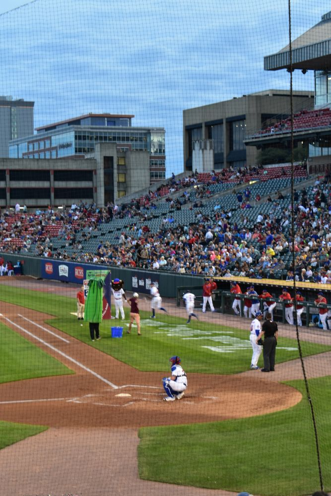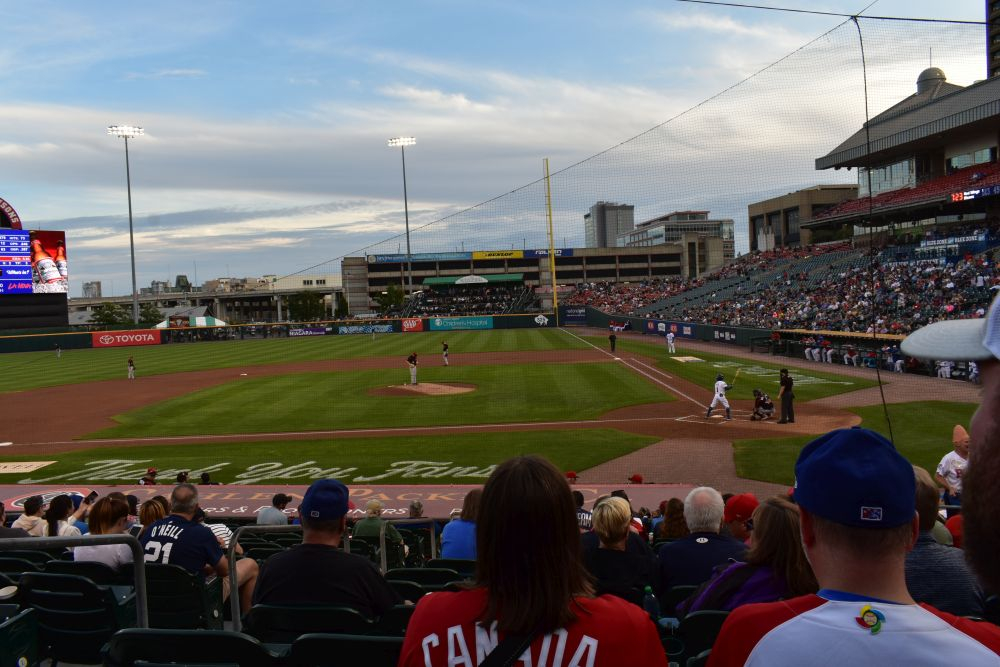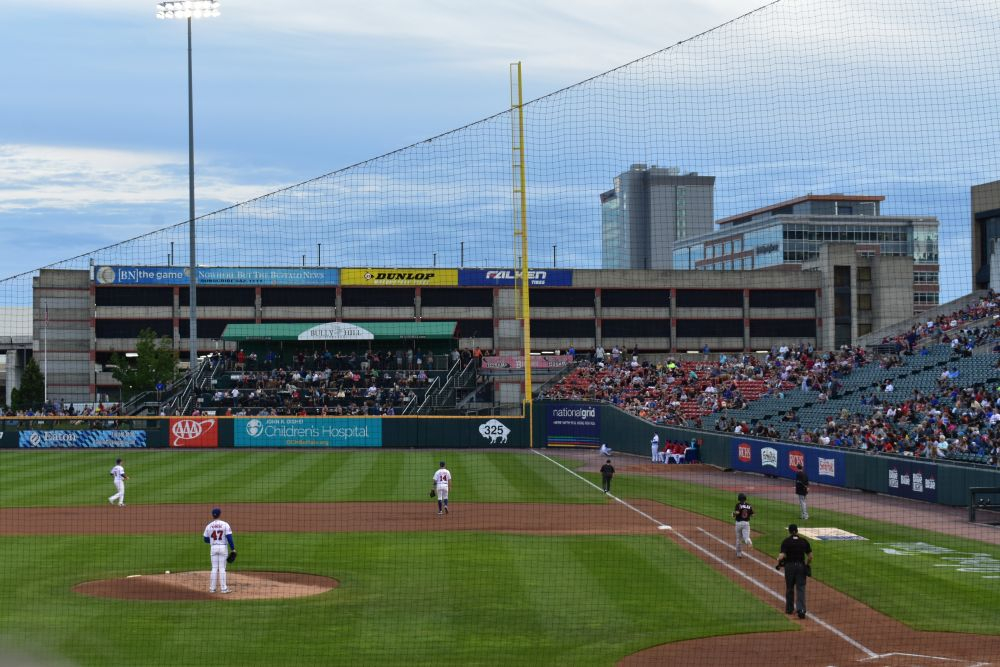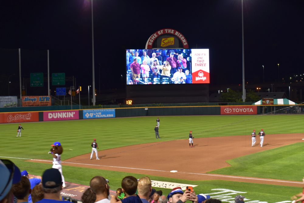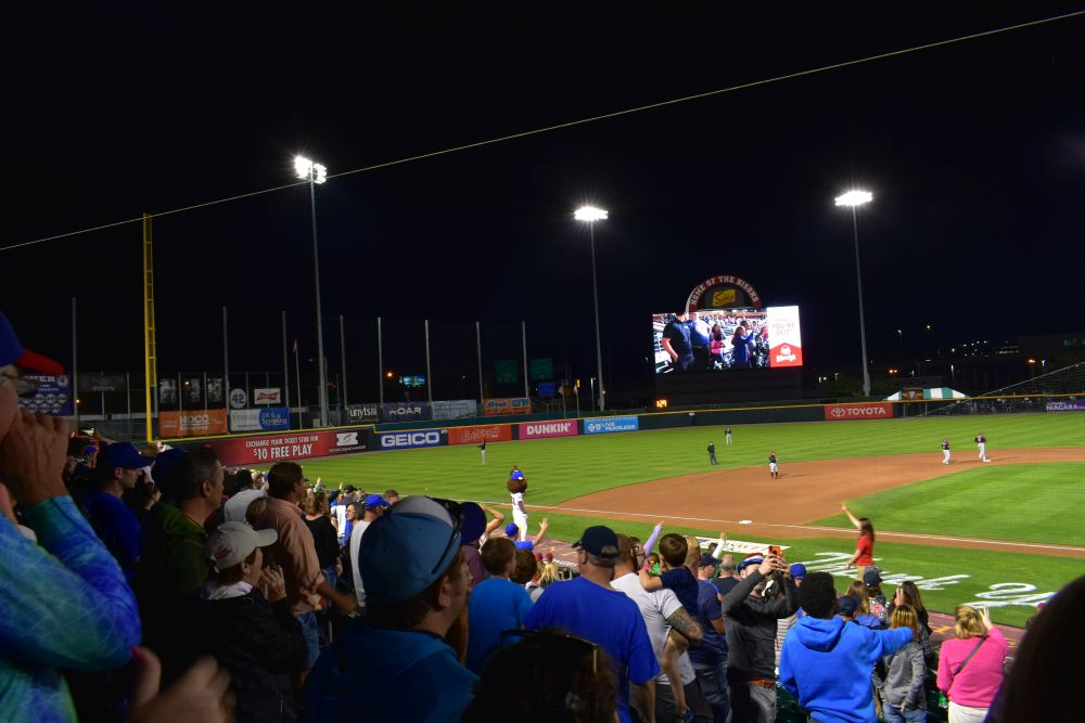 Während wir so durch Buffalo fuhren, sahen wir eine Reklame für ein Baseball Spiel, das an dem Abend stattfinden soll. Eigentlich findet in jeder Stadt in USA täglich irgendwo ein Baseball Spiel statt. Wir hatten zwar null Ahnung von den Regeln und Gepflogenheiten dieses Traditionssports, doch die Chance ein Baseball Spiel mal live zu sehen und die Atmosphäre zu spüren, reizte uns sehr. Und so kompliziert war es dann im Endeffekt gar nicht. Tickets am Schalter kaufen, Hot-Dogs besorgen und Platz suchen. Das Schöne am Baseball ist, dass man nicht wie bei uns im Fußball gespannt während des ganzen Spiels auf das Feld starrt, sondern es eher ein ganzes abendfüllendes Event ist. Ein Spiel kann schon mal 3 Stunden oder länger dauern, da muss man auf jeden Fall genug Platz für Bier und Hot-Dogs mitbringen. Dann sitzt man einfach da, ratscht und unterhält sich mit den Sitznachbarn über Gott und die Welt. Beim Fachsimpeln über das Spiel konnten wir jetzt eher weniger punkten, das war aber letztendlich auch gar nicht so wichtig 😉